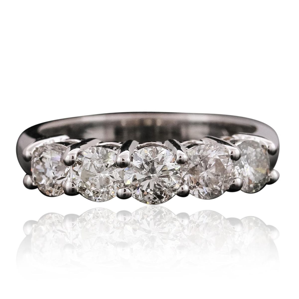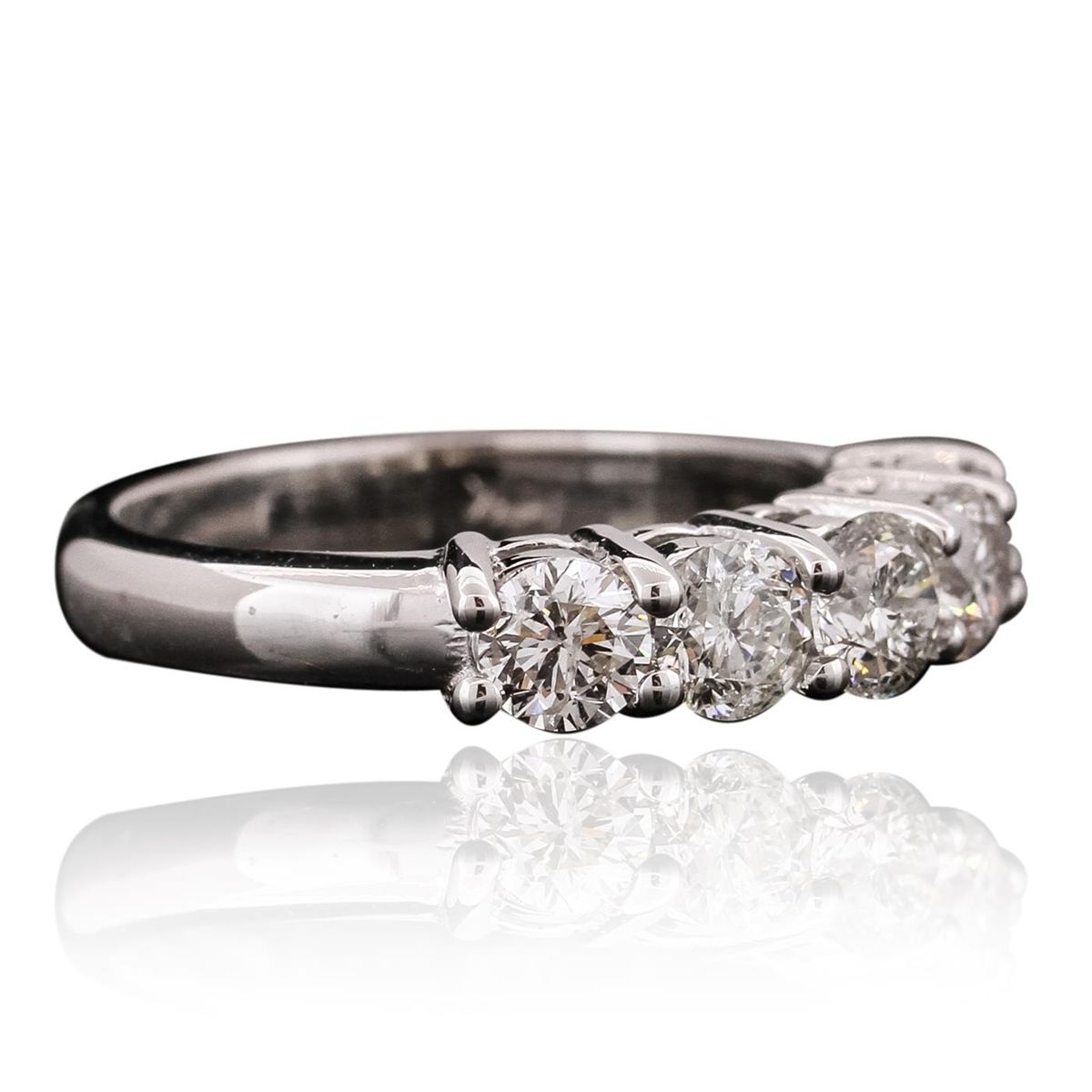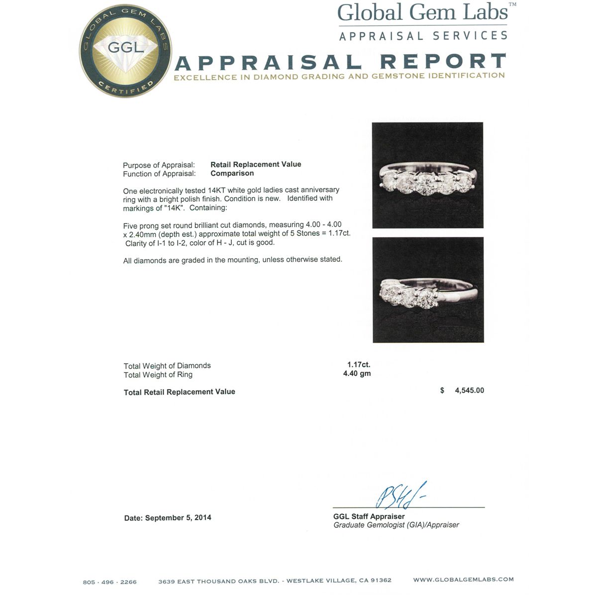 One electronically tested 14KT white gold ladies cast anniversary ring with a bright polish finish. Identified with markings of "14K". Condition is new. Containing: Five prong set round brilliant cut diamonds, measuring 4.00 - 4.00 x 2.40mm (depth est.) approximate total weight of 5 Stones = 1.17ct. Clarity: I-1 to I-2. Color: H - J, Cut is Good. All diamonds are graded in the mounting, unless otherwise stated. Total Weight of Diamonds 1.17ct. Total Weight of Ring 4.40 grams. GGL Appraised at $4,545.00.