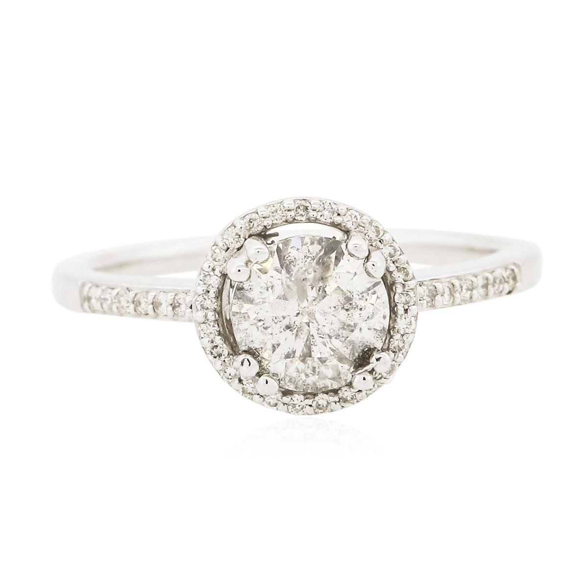 One electronically tested 14KT white gold Ladies combination cast & assembled engagement ring with a bright polish finish. Condition is new. Identified with markings of "14K". Containing: One prong set round brilliant cut diamond, measuring 6.35 - 6.33 x 4.00mm (depth est.) approximate weight of 1.04ct. Clarity: I-2. Color: G, Cut is Good. Thirty-Seven prong set round brilliant cut diamonds, measuring 1.00 - 1.00 x 0.60mm (depth est.) approximate. Total Weight of 37 Stones = 0.13ct. Clarity: SI-1 to SI-2. Color: G - H, Cut is Good. EGL USA GEM ID# US 911348417D. All diamonds are graded in the mounting, unless otherwise stated. Total Weight of Diamonds 1.17ct. Total Weight of Engagement Ring 3.00 grams. GGL Appraised at $10,775.00.