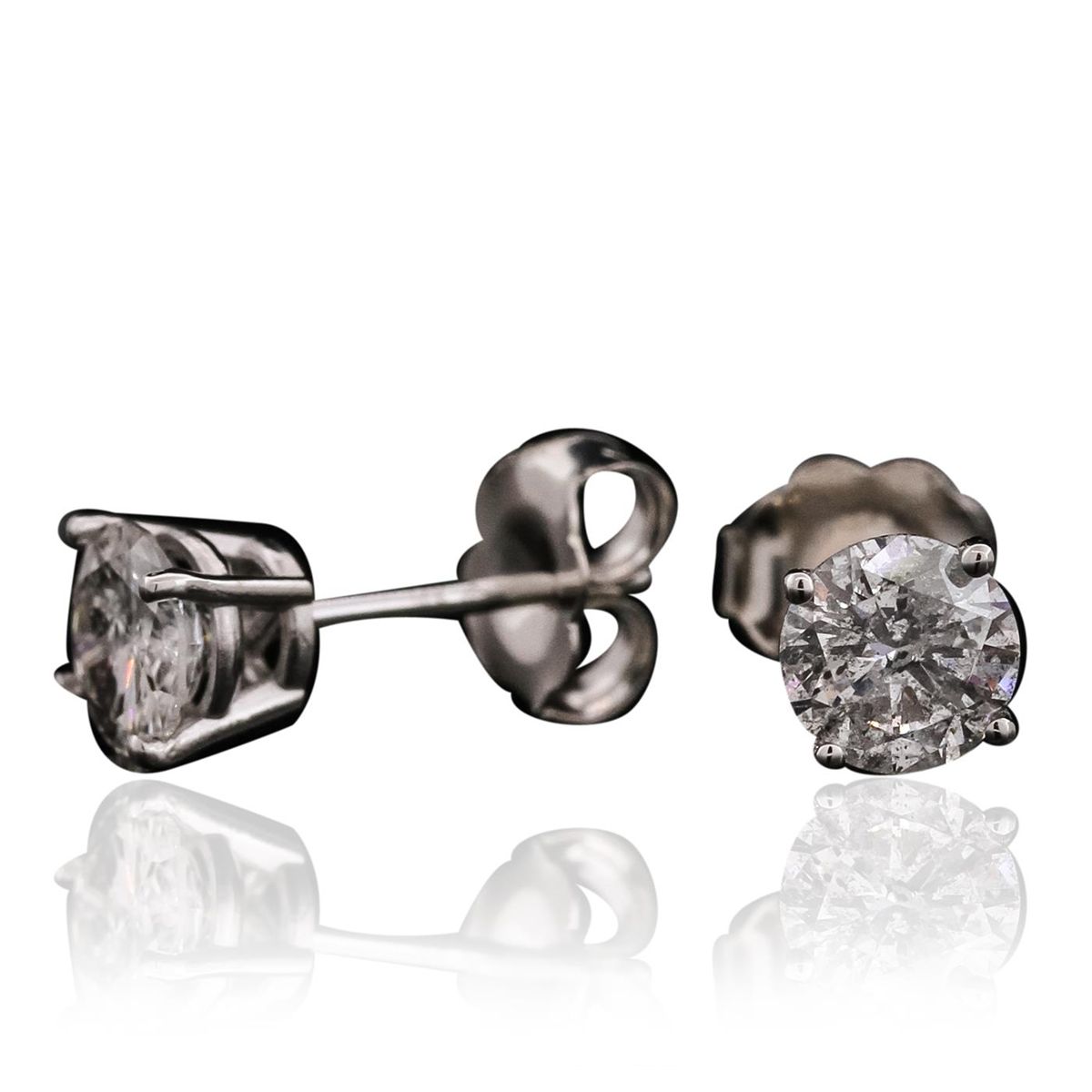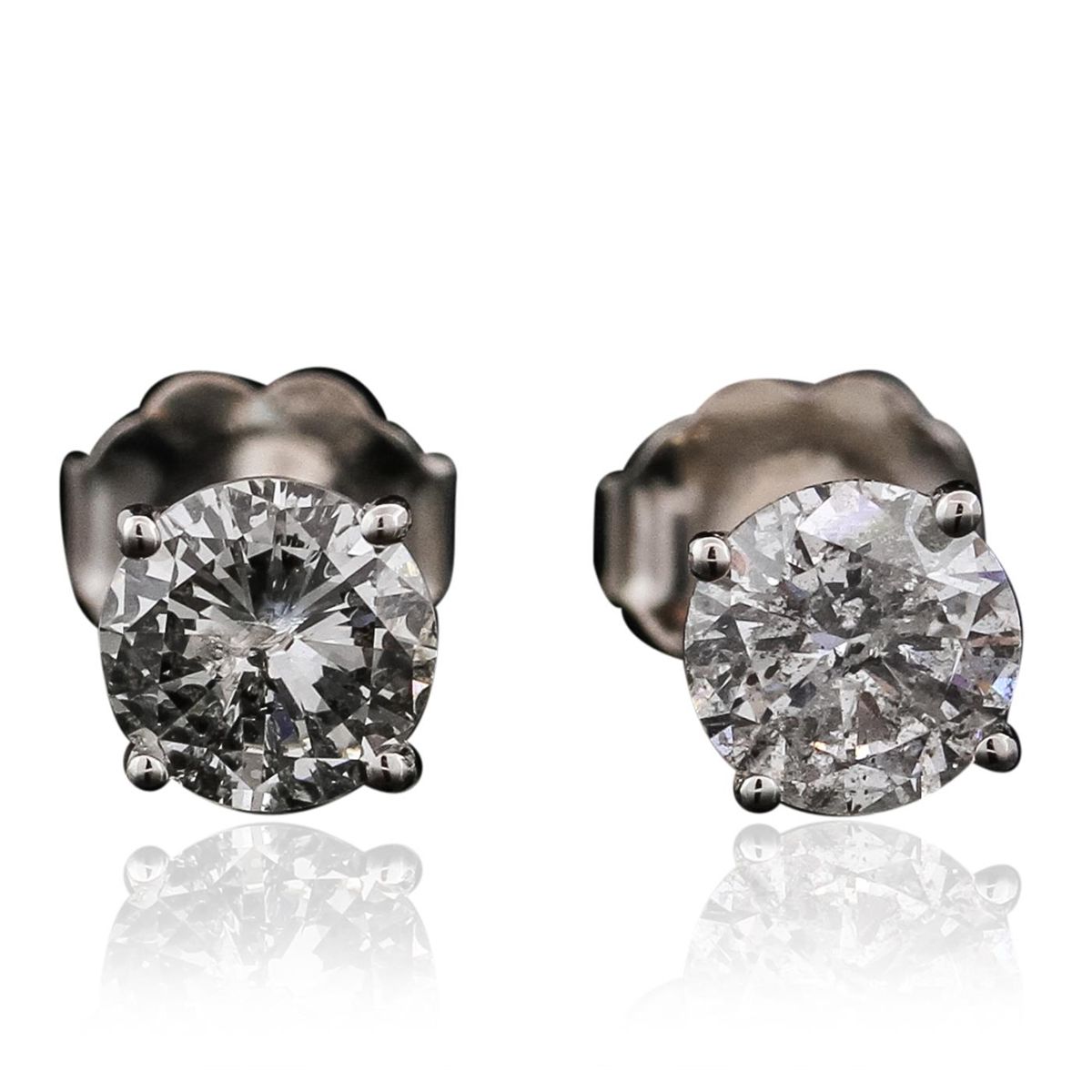 One pair electronically tested 14KT white gold cast & assembled diamond solitaire earrings with standard backs. Bright polish finish. Identified with markings of "14K". Condition is new, good workmanship. Containing: One prong set round brilliant cut diamond, measuring 5.20 - 5.15 x 3.10mm (depth est.) approximate weight of 0.60ct with a faint blue fluorescence. Graded in the setting. Clarity: I-1. Color: H. Depth 59.9%. Table 65.6%. One prong set round brilliant cut diamond, measuring 5.20 - 5.15 x 2.90mm (depth est.) approximate weight of 0.57ct. Graded in the setting. Clarity: I-1. Color: J. Depth 56.0%. Table 71.4%. Total Weight of Diamonds 1.17ct. Total Weight of Earrings 0.91 grams. AIG Appraised at $5,745.00.