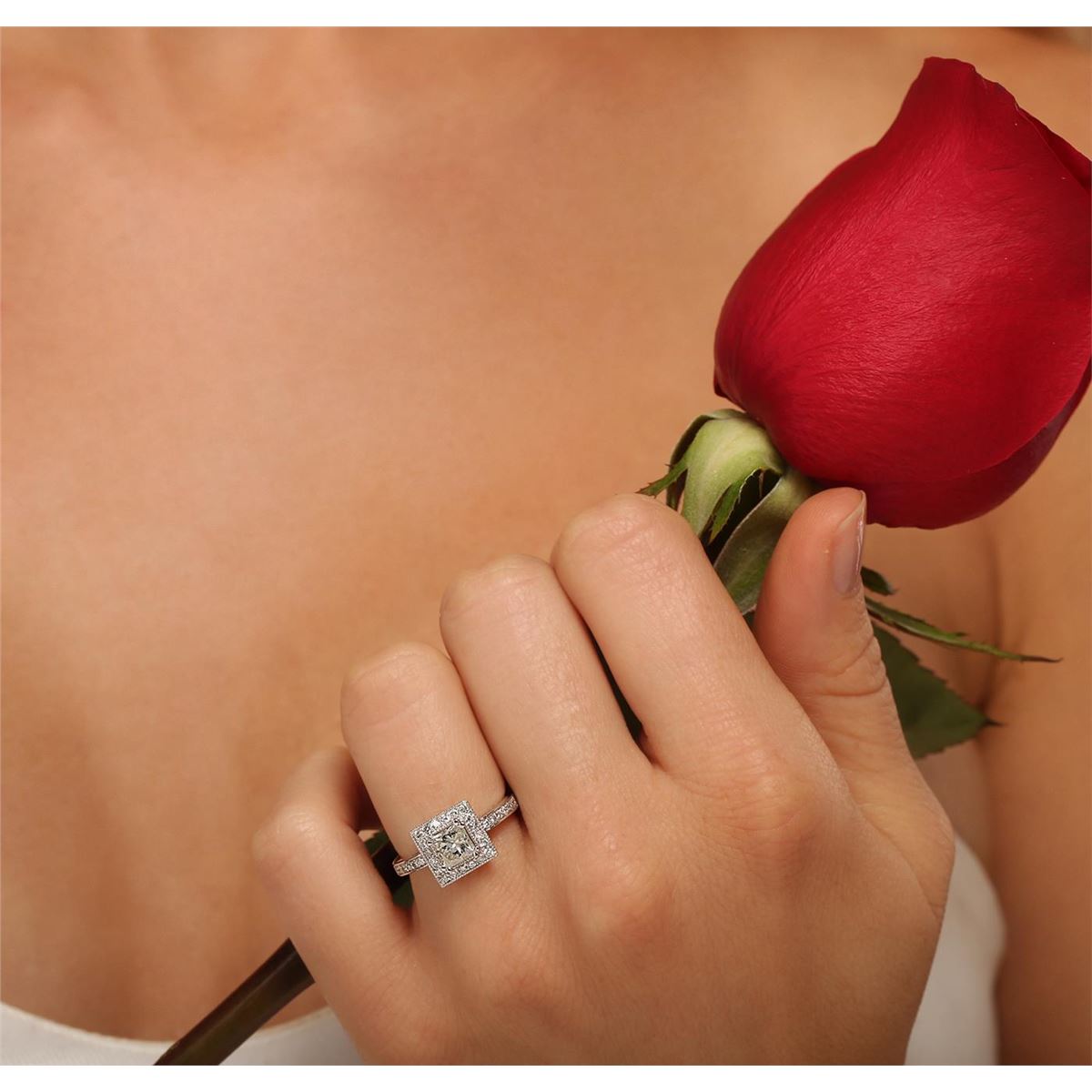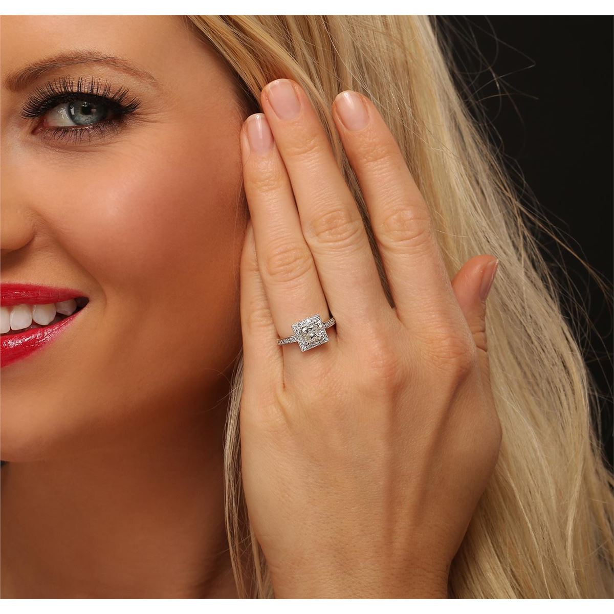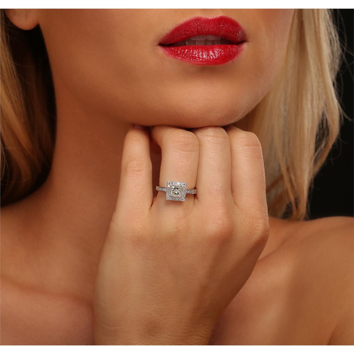 One electronically tested 14KT white gold ladies combination cast & assembled engagement ring with a bright polish finish. Condition is new. Identified with markings of "K14". Containing: One prong set radiant shaped cut diamond, measuring 5.16 x 5.32 x 4.08mm (depth est.) approximate weight of 0.92ct. Clarity: I-2. Color: J, Cut is Good. Thirty-Two prong set round brilliant cut diamonds, measuring 1.30 - 1.30 x 0.78mm (depth est.) approximate total weight of 32 Stones = 0.26ct. Clarity: SI-2 to I-1. Color: I - J, Cut is Good. All diamonds are graded in the mounting, unless otherwise stated. Total Weight of Diamonds 1.17ct. Total Weight of Engagement Ring 3.40 grams. GGL Appraised at $5,390.00.