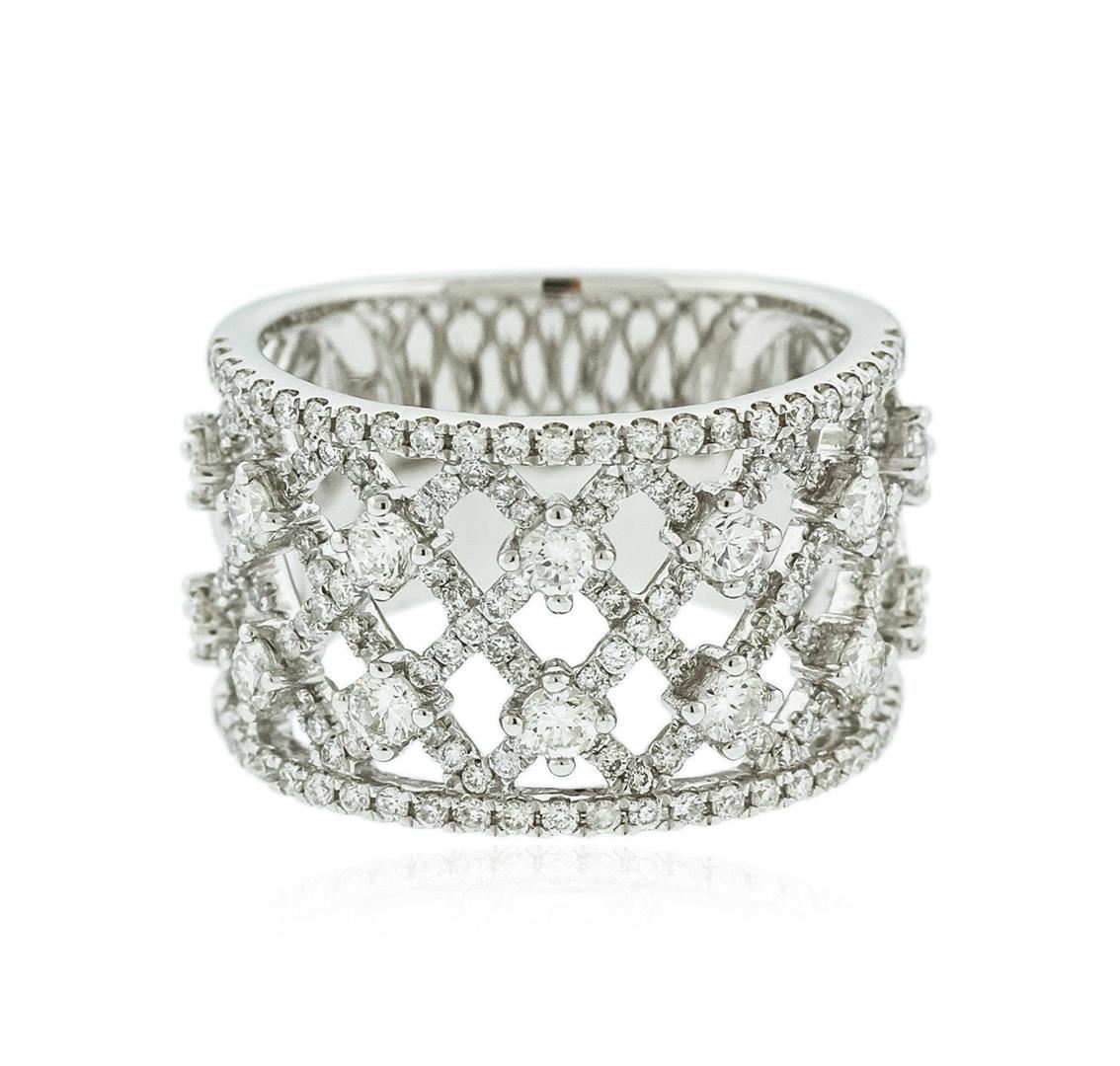 One electronically tested 14KT white gold ladies cast diamond ring with a tapered shank with a bright polish finish. Identified with markings of "14K". Condition is new. Containing: Fourteen prong set round brilliant cut diamonds, measuring 2.00 - 2.00 x 1.20mm (depth est.) approximate total weight of 14 Stones = 0.41ct. Clarity: VS-2 to SI-1. Color: I - J, Cut is Good. One Hundred Sixty prong set round brilliant cut diamonds, measuring 1.10 - 1.10 x 0.66mm (depth est.) approximate total weight of 160 Stones = 0.77ct. Clarity: SI-2 to I-1. Color: H - I, Cut is Good. All diamonds are graded in the mounting, unless otherwise stated. Total Weight of Diamonds 1.18ct. Total Weight of Ring 7.30 grams. GGL Appraised at $4,725.00.