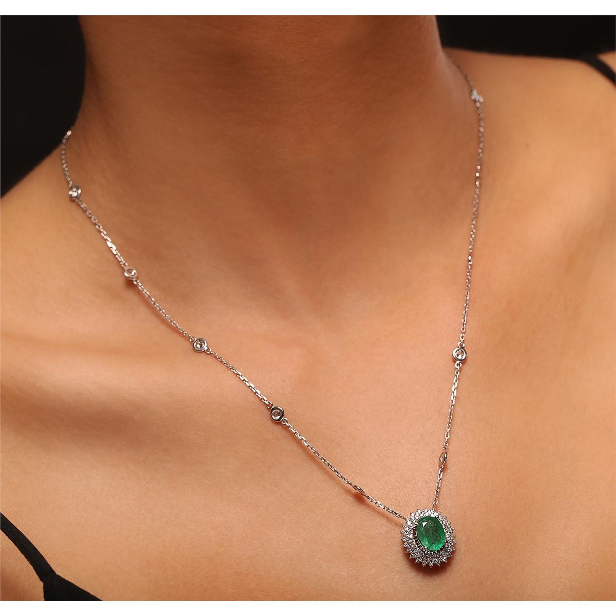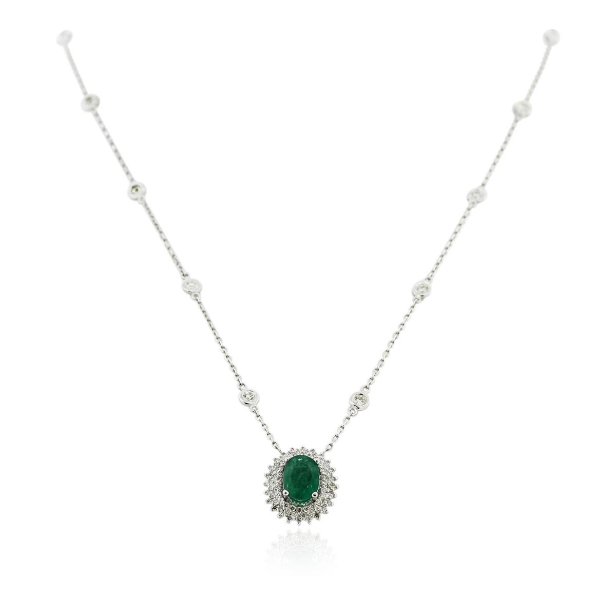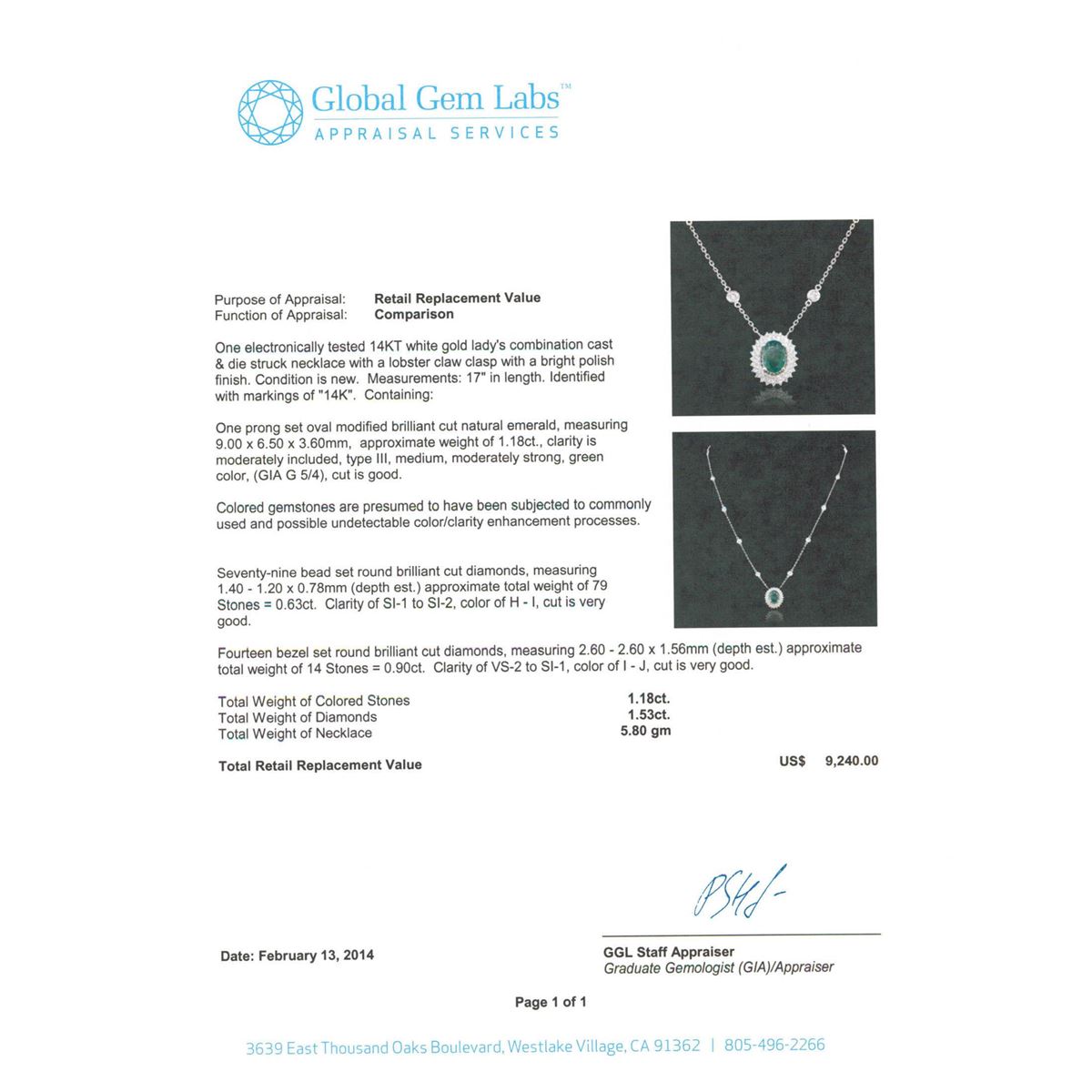 One electronically tested 14KT White Gold Ladies combination cast & die struck necklace with a lobster claw clasp with a bright polish finish. Condition is new. Measurements: 17" in length. Identified with markings of "14K". Containing: One prong set oval modified brilliant cut natural emerald, measuring 9.00 x 6.50 x 3.60mm, approximate weight of 1.18ct., clarity is moderately included, type III, medium, moderately strong, green color, (GIA G 5/4), cut is good. Colored gemstones are presumed to have been subjected to commonly used and possible undetectable color/clarity enhancement processes. Seventy-Nine bead set round brilliant cut diamonds, measuring 1.40 - 1.20 x 0.78mm (depth est.) approximate total weight of 79 Stones = 0.63ct. Clarity of SI-1 to SI-2, Color of H - I, Cut is Very Good. Fourteen bezel set round brilliant cut diamonds, measuring 2.60 - 2.60 x 1.56mm (depth est.) approximate total weight of 14 Stones = 0.90ct. Clarity of VS-2 to SI-1, Color of I - J, Cut is Very Good. Total Weight of Colored Stones 1.18ct. Total Weight of Diamonds 1.53ct. Total Weight of Necklace 5.80gm. GGL Appraised at $9,240.00.