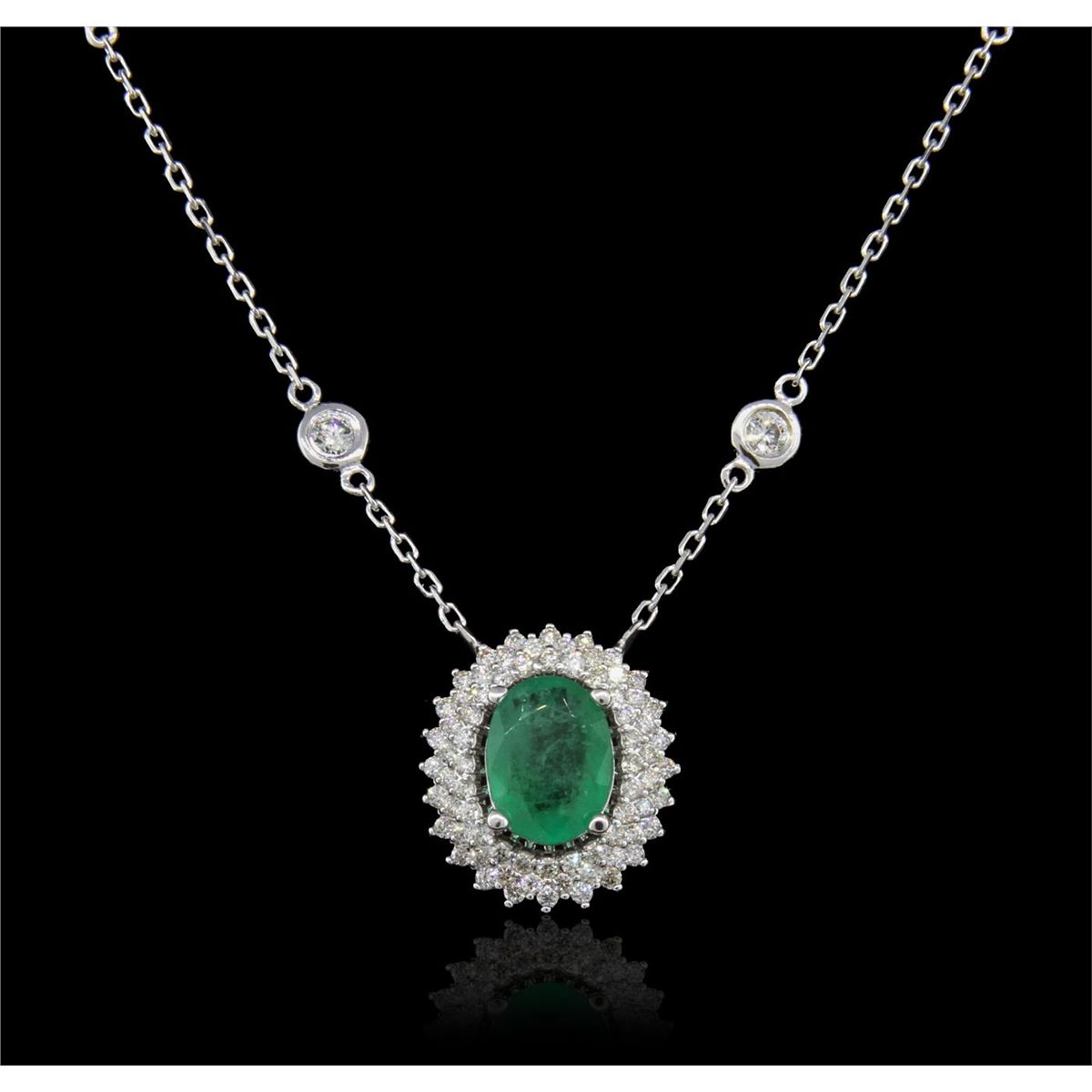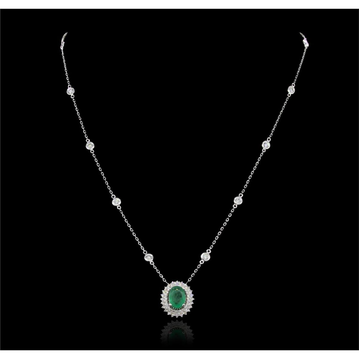 One electronically tested 14KT White Gold Ladies combination cast & die struck necklace with a lobster claw clasp with a bright polish finish. Condition is new. Measurements: 17" in length. Identified with markings of "14K". Containing: One prong set oval modified brilliant cut natural emerald, measuring 9.00 x 6.50 x 3.60mm, approximate weight of 1.18ct., clarity is moderately included, type III, medium, moderately strong, green color, (GIA G 5/4), cut is good. Colored gemstones are presumed to have been subjected to commonly used and possible undetectable color/clarity enhancement processes. Seventy-Nine bead set round brilliant cut diamonds, measuring 1.40 - 1.20 x 0.78mm (depth est.) approximate total weight of 79 Stones = 0.63ct. Clarity of SI-1 to SI-2, Color of H - I, Cut is Very Good. Fourteen bezel set round brilliant cut diamonds, measuring 2.60 - 2.60 x 1.56mm (depth est.) approximate total weight of 14 Stones = 0.90ct. Clarity of VS-2 to SI-1, Color of I - J, Cut is Very Good. Total Weight of Colored Stones 1.18ct. Total Weight of Diamonds 1.53ct. Total Weight of Necklace 5.80gm. GGL Appraised at $9,240.00.