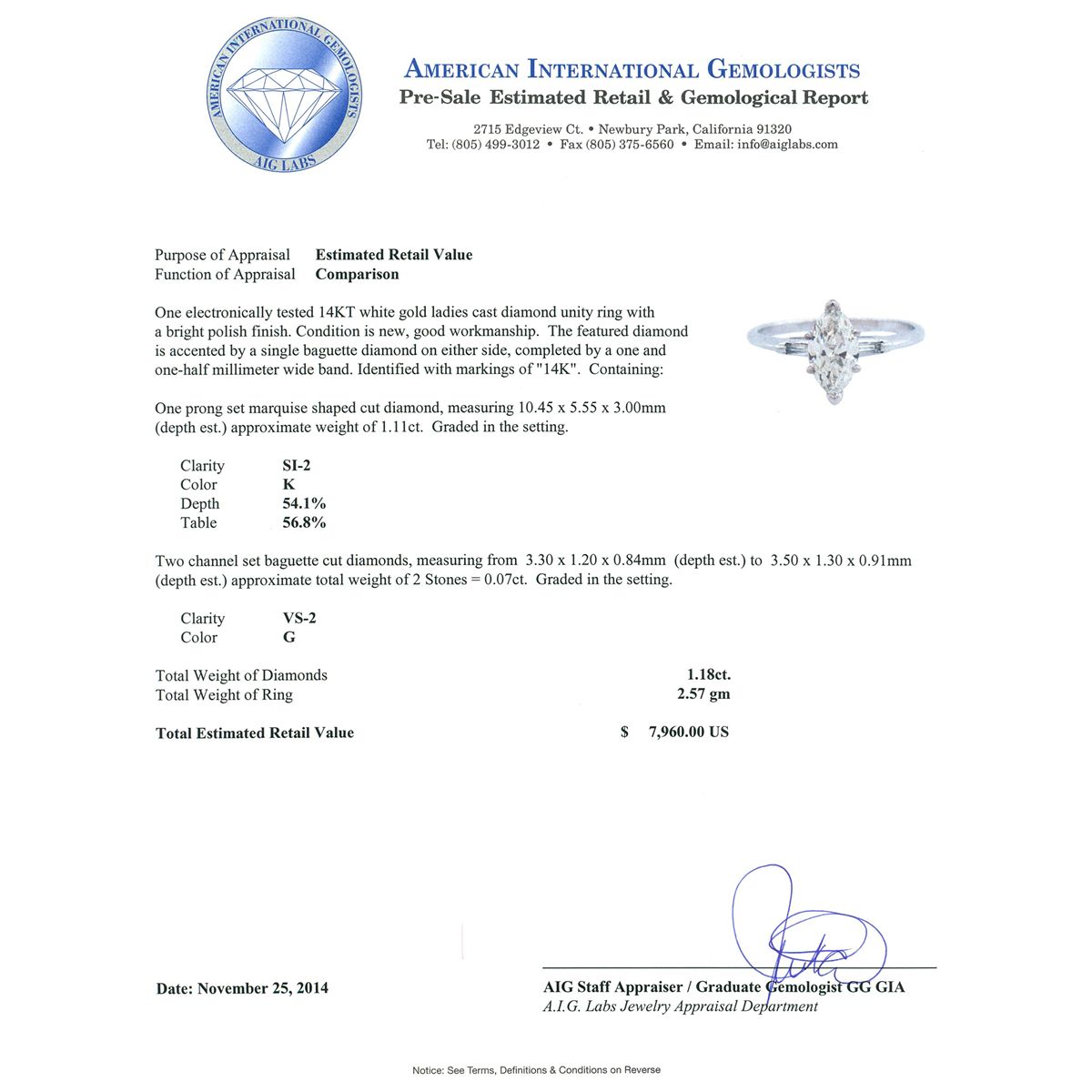 One electronically tested 14KT white gold ladies cast diamond unity ring with a bright polish finish. The featured diamond is accented by a single baguette diamond on either side, completed by a one and one-half millimeter wide band. Identified with markings of "14K". Condition is new, good workmanship. Containing: One prong set marquise shaped cut diamond, measuring 10.45 x 5.55 x 3.00mm (depth est.) approximate weight of 1.11ct. Graded in the setting. Clarity: SI-2. Color: K. Depth 54.1%. Table 56.8%. Two channel set baguette cut diamonds, measuring from 3.30 x 1.20 x 0.84mm (depth est.) to 3.50 x 1.30 x 0.91mm (depth est.) approximate total weight of 2 Stones = 0.07ct. Graded in the setting. Clarity: VS-2. Color: G. Total Weight of Diamonds 1.18ct. Total Weight of Ring 2.57 grams. AIG Appraised at $7,960.00.