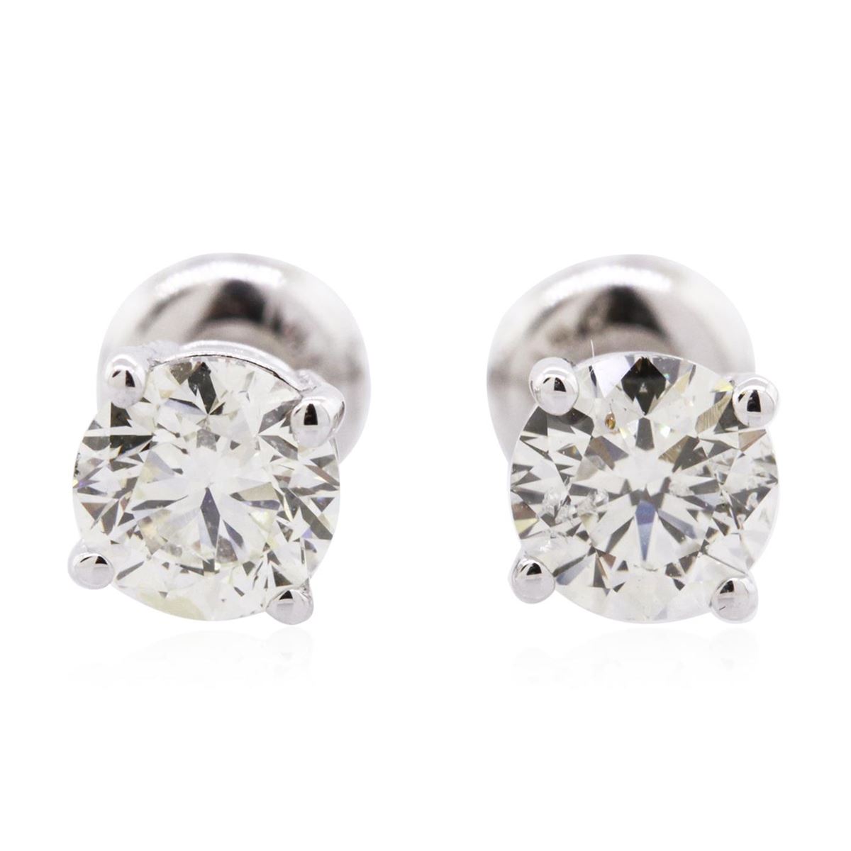 One pair electronically tested 14KT white gold cast & assembled diamond solitaire earrings with screw backs. Bright polish finish. Condition is new, good workmanship. Containing: One prong set round brilliant cut diamond, measuring 5.01 - 5.00 x 3.20mm (depth est.), 3.00% GTCF approximate weight of 0.60ct with a faint blue fluorescence. Graded in the setting. Clarity: I-1. Color: 63.9%. Table 59.9%. One prong set round brilliant cut diamond, measuring 5.00 - 4.90 x 3.20mm (depth est.), 3.00% GTCF approximate weight of 0.59ct with a medium blue fluorescence. Graded in the setting. Clarity: I-1. Color: 64.7%. Table 60.6%. Total Weight of Diamonds 1.19ct. Total Weight of Earrings 0.95 grams. AIG Appraised at $4,265.00.