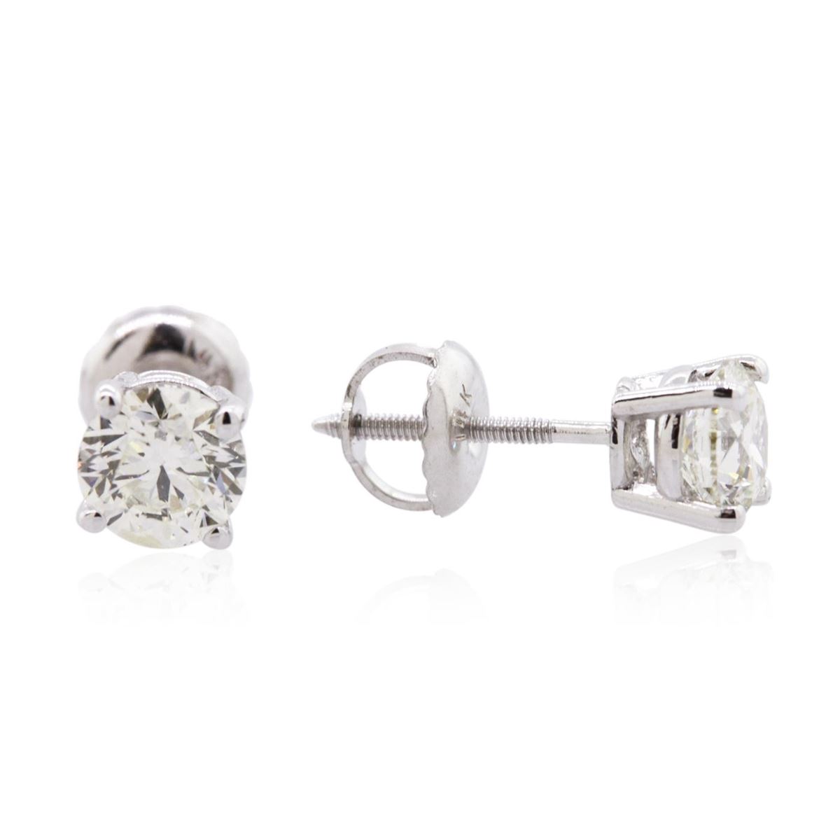 One pair electronically tested 14KT white gold cast & assembled diamond solitaire earrings with screw backs. Bright polish finish. Condition is new, good workmanship. Containing: One prong set round brilliant cut diamond, measuring 5.01 - 5.00 x 3.20mm (depth est.), 3.00% GTCF approximate weight of 0.60ct with a faint blue fluorescence. Graded in the setting. Clarity: I-1. Color: 63.9%. Table 59.9%. One prong set round brilliant cut diamond, measuring 5.00 - 4.90 x 3.20mm (depth est.), 3.00% GTCF approximate weight of 0.59ct with a medium blue fluorescence. Graded in the setting. Clarity: I-1. Color: 64.7%. Table 60.6%. Total Weight of Diamonds 1.19ct. Total Weight of Earrings 0.95 grams. AIG Appraised at $4,265.00.