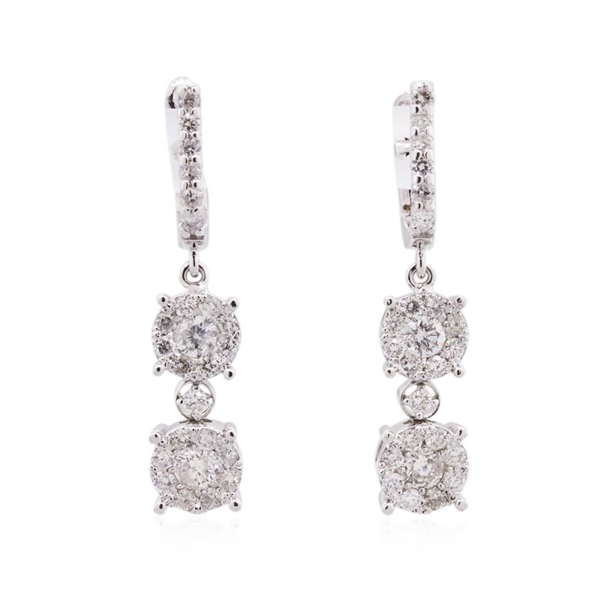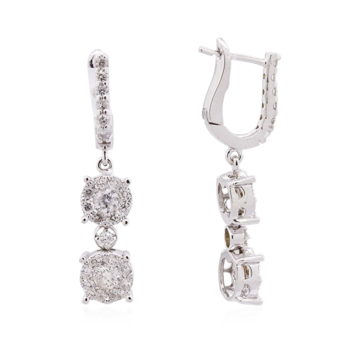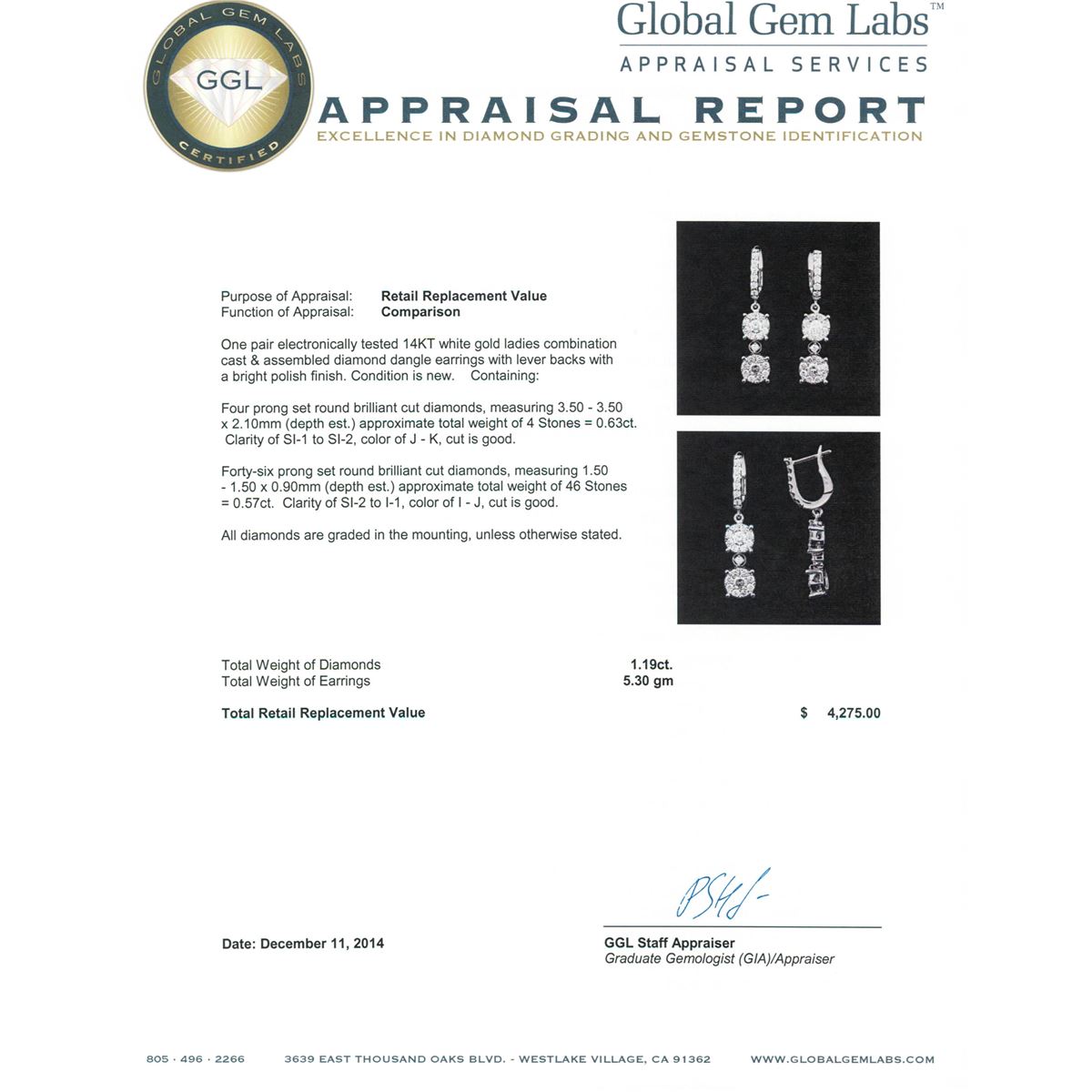 One pair electronically tested 14KT white gold ladies combination cast & assembled diamond dangle earrings with lever backs with a bright polish finish. Condition is new. Containing: Four prong set round brilliant cut diamonds, measuring 3.50 - 3.50 x 2.10mm (depth est.) approximate total weight of 4 Stones = 0.63ct. Clarity: SI-1 to SI-2. Color: J - K, Cut is Good. Forty-Six prong set round brilliant cut diamonds, measuring 1.50 - 1.50 x 0.90mm (depth est.) approximate total weight of 46 Stones = 0.57ct. Clarity: SI-2 to I-1. Color: I - J, Cut is Good. All diamonds are graded in the mounting, unless otherwise stated. Total Weight of Diamonds 1.19ct. Total Weight of Earrings 5.30 grams. GGL Appraised at $4,275.00.