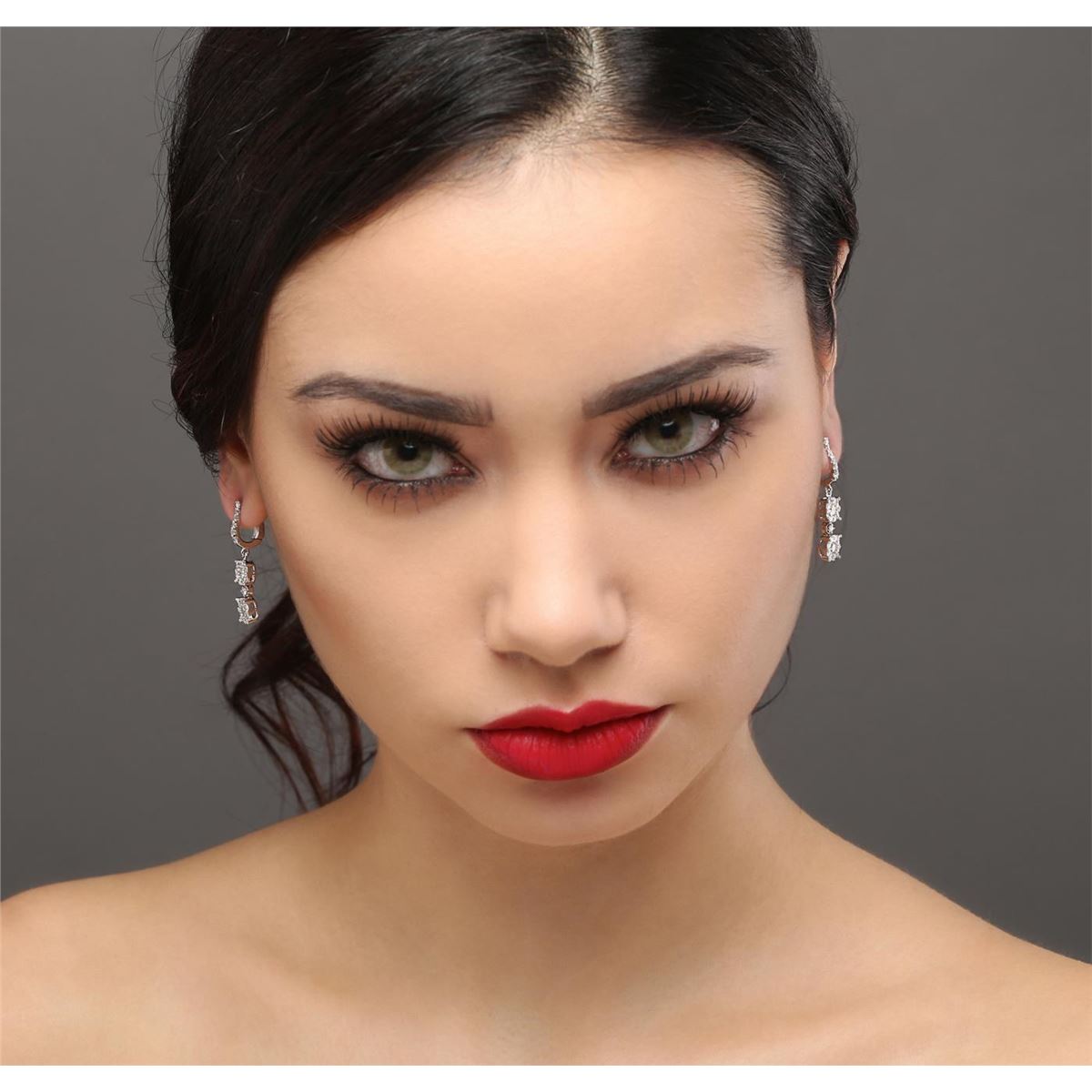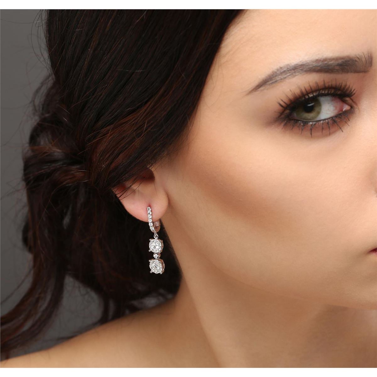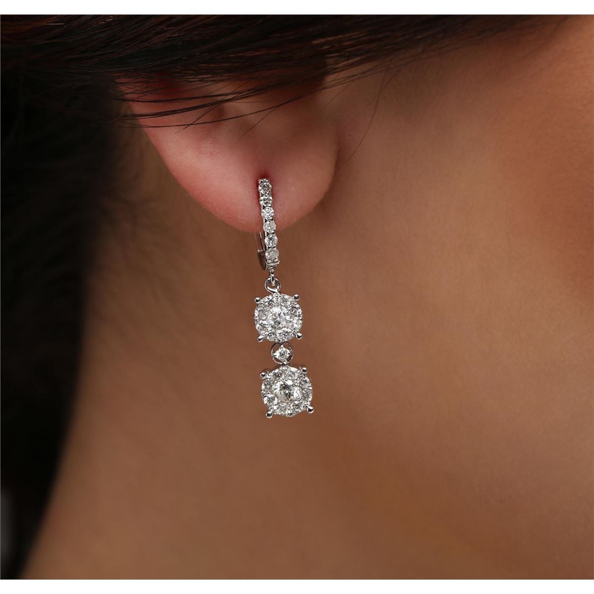 One pair electronically tested 14KT white gold ladies combination cast & assembled diamond dangle earrings with lever backs with a bright polish finish. Condition is new. Containing: Four prong set round brilliant cut diamonds, measuring 3.50 - 3.50 x 2.10mm (depth est.) approximate total weight of 4 Stones = 0.63ct. Clarity: SI-1 to SI-2. Color: J - K, Cut is Good. Forty-Six prong set round brilliant cut diamonds, measuring 1.50 - 1.50 x 0.90mm (depth est.) approximate total weight of 46 Stones = 0.57ct. Clarity: SI-2 to I-1. Color: I - J, Cut is Good. All diamonds are graded in the mounting, unless otherwise stated. Total Weight of Diamonds 1.19ct. Total Weight of Earrings 5.30 grams. GGL Appraised at $4,275.00.