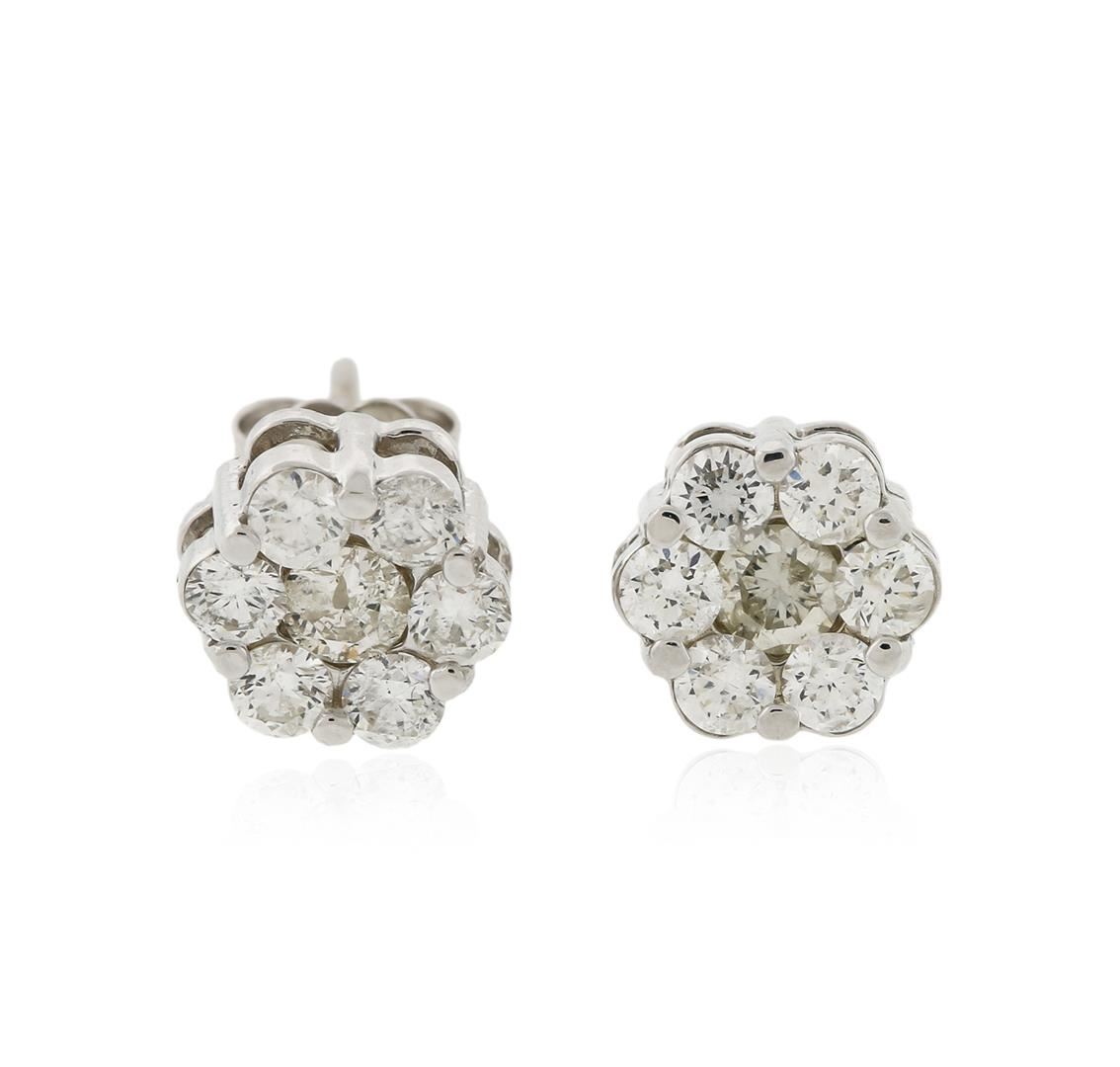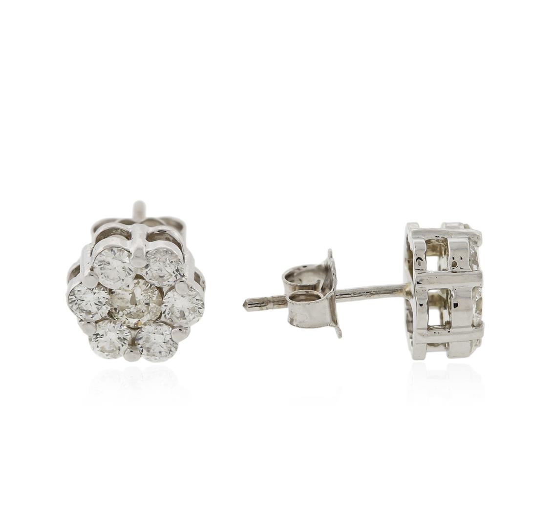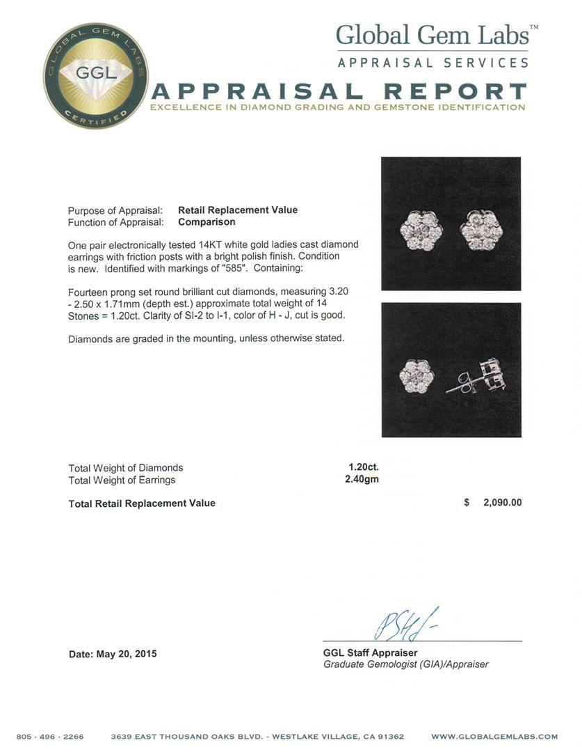One pair electronically tested 14KT white gold ladies cast diamond earrings with friction posts with a bright polish finish. Identified with markings of "585". Condition is new. Containing: Fourteen prong set round brilliant cut diamonds, measuring 3.20 - 2.50 x 1.71mm (depth est.) approximate total weight of 14 Stones = 1.20ct. Clarity: SI-2 to I-1. Color: H - J, Cut is Good. Diamonds are graded in the mounting, unless otherwise stated. Total Weight of Diamonds 1.20ct. Total Weight of Earrings 2.40 grams. GGL Appraised at $2,090.00.