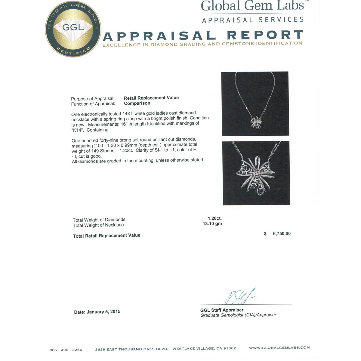 One electronically tested 14KT white gold ladies cast diamond necklace with a spring ring clasp with a bright polish finish. Measurements: 16" in length Identified with markings of "K14". Condition is new. Containing: One Hundred Forty-Nine prong set round brilliant cut diamonds, measuring 2.00 - 1.30 x 0.99mm (depth est.) approximate total weight of 149 Stones = 1.20ct. Clarity: SI-1 to I-1. Color: H - I, Cut is Good. All diamonds are graded in the mounting, unless otherwise stated. Total Weight of Diamonds 1.20ct. Total Weight of Necklace 13.10 grams. GGL Appraised at $6,750.00.