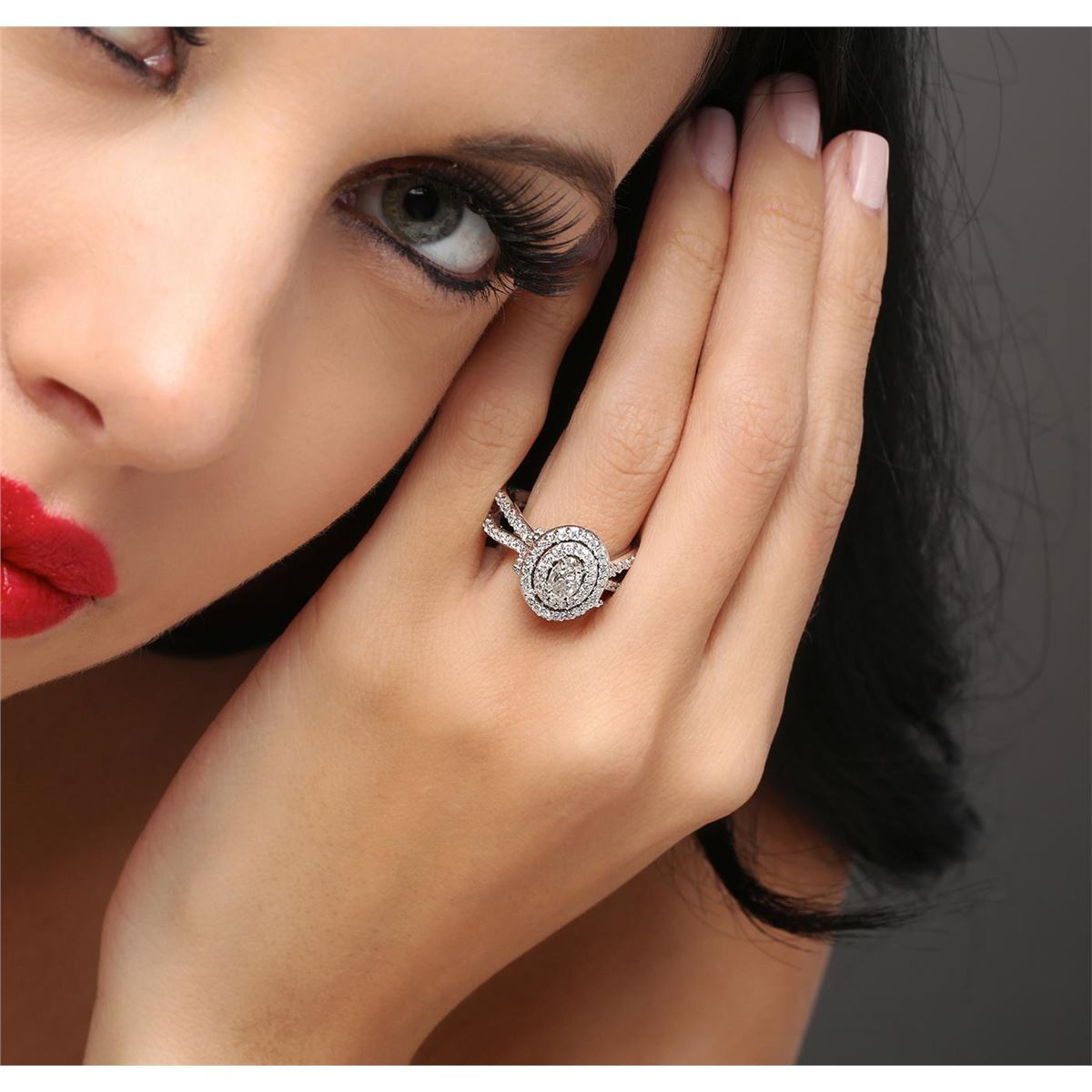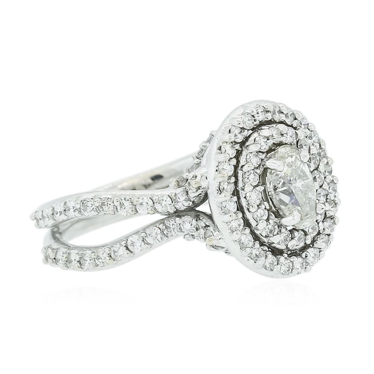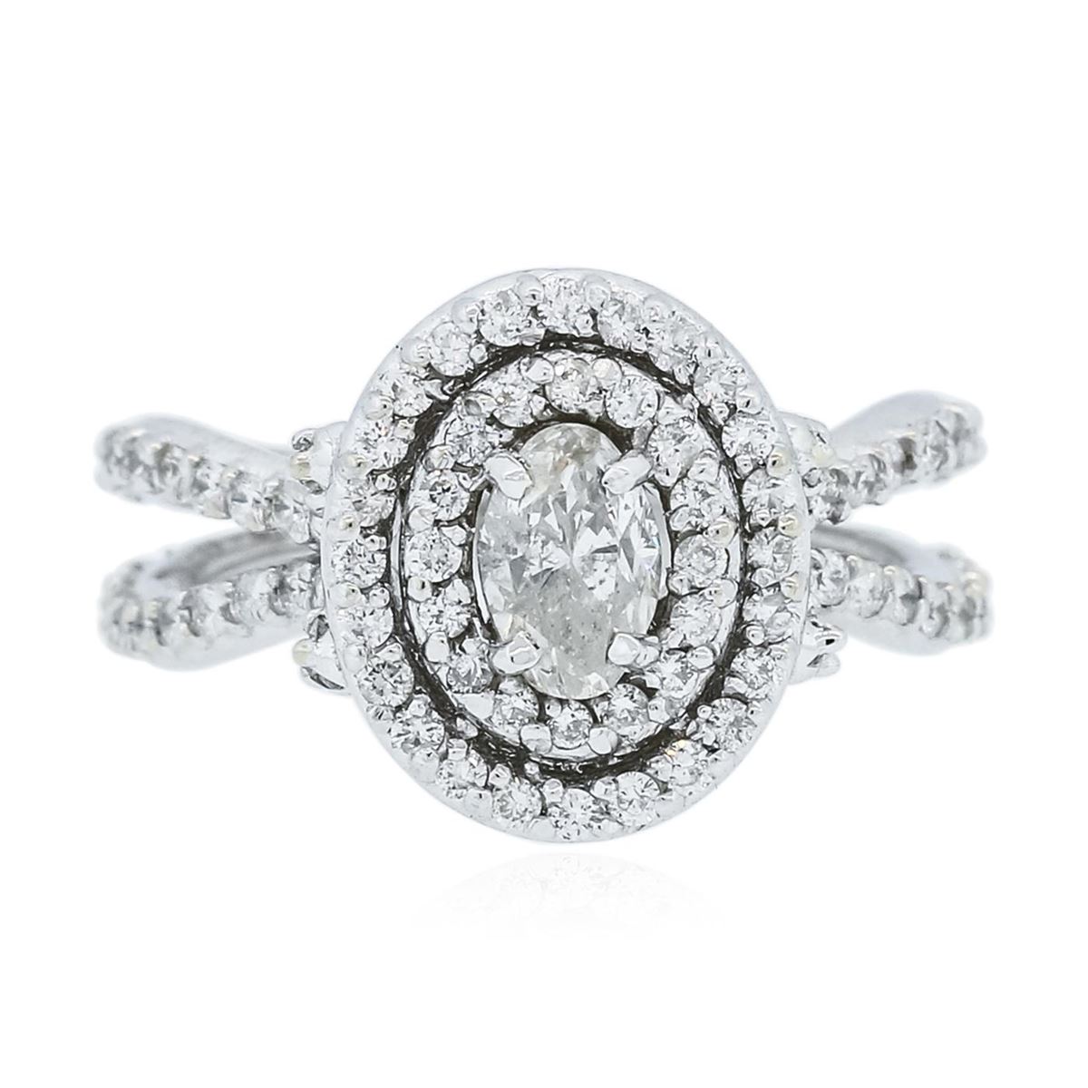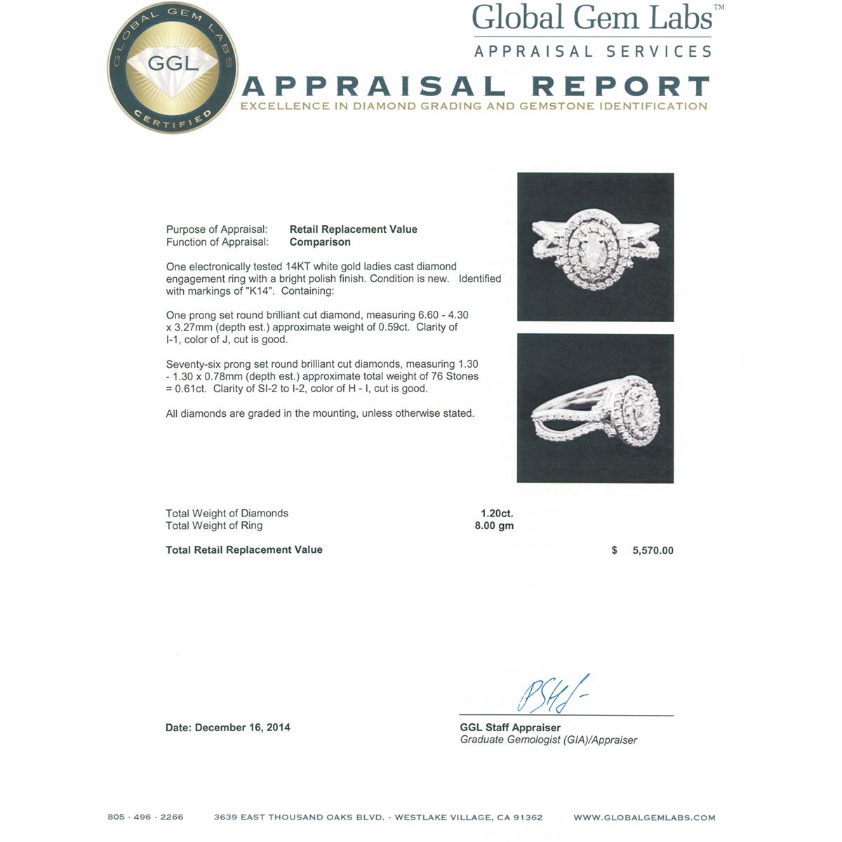 One electronically tested 14KT white gold ladies cast diamond engagement ring with a bright polish finish. Identified with markings of "K14". Condition is new. Containing: One prong set round brilliant cut diamond, measuring 6.60 - 4.30 x 3.27mm (depth est.) approximate weight of 0.59ct. Clarity: I-1. Color: J, Cut is Good. Seventy-Six prong set round brilliant cut diamonds, measuring 1.30 - 1.30 x 0.78mm (depth est.) approximate total weight of 76 Stones = 0.61ct. Clarity: SI-2 to I-2. Color: H - I, Cut is Good. All diamonds are graded in the mounting, unless otherwise stated. Total Weight of Diamonds 1.20ct. Total Weight of Ring 8.00 grams. GGL Appraised at $5,570.00.