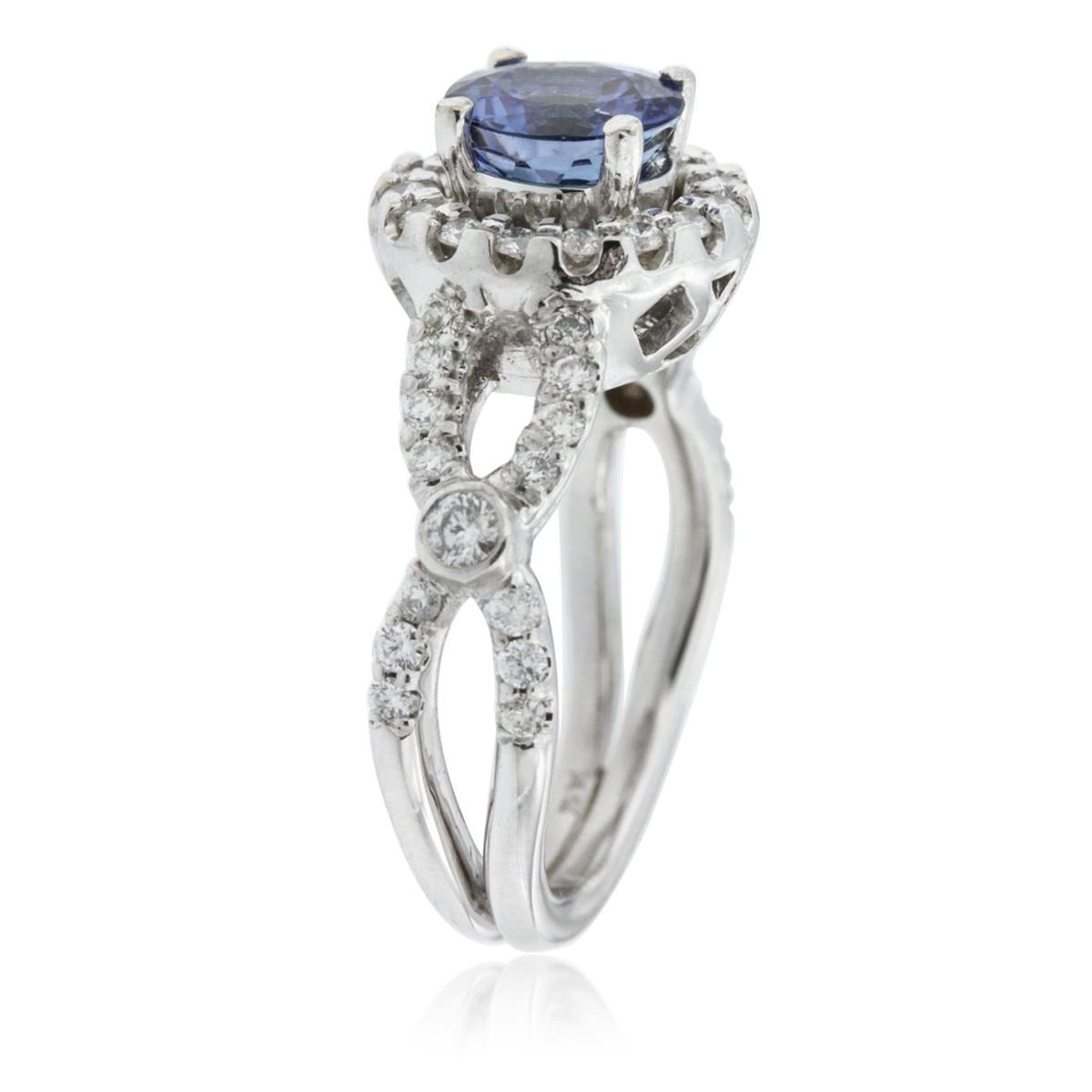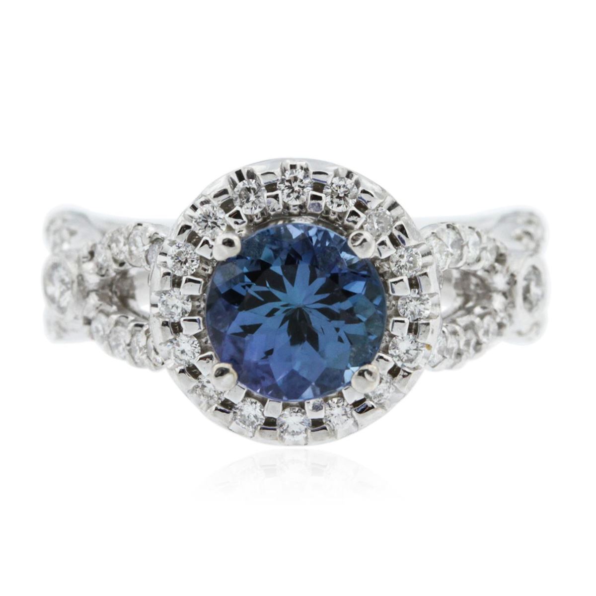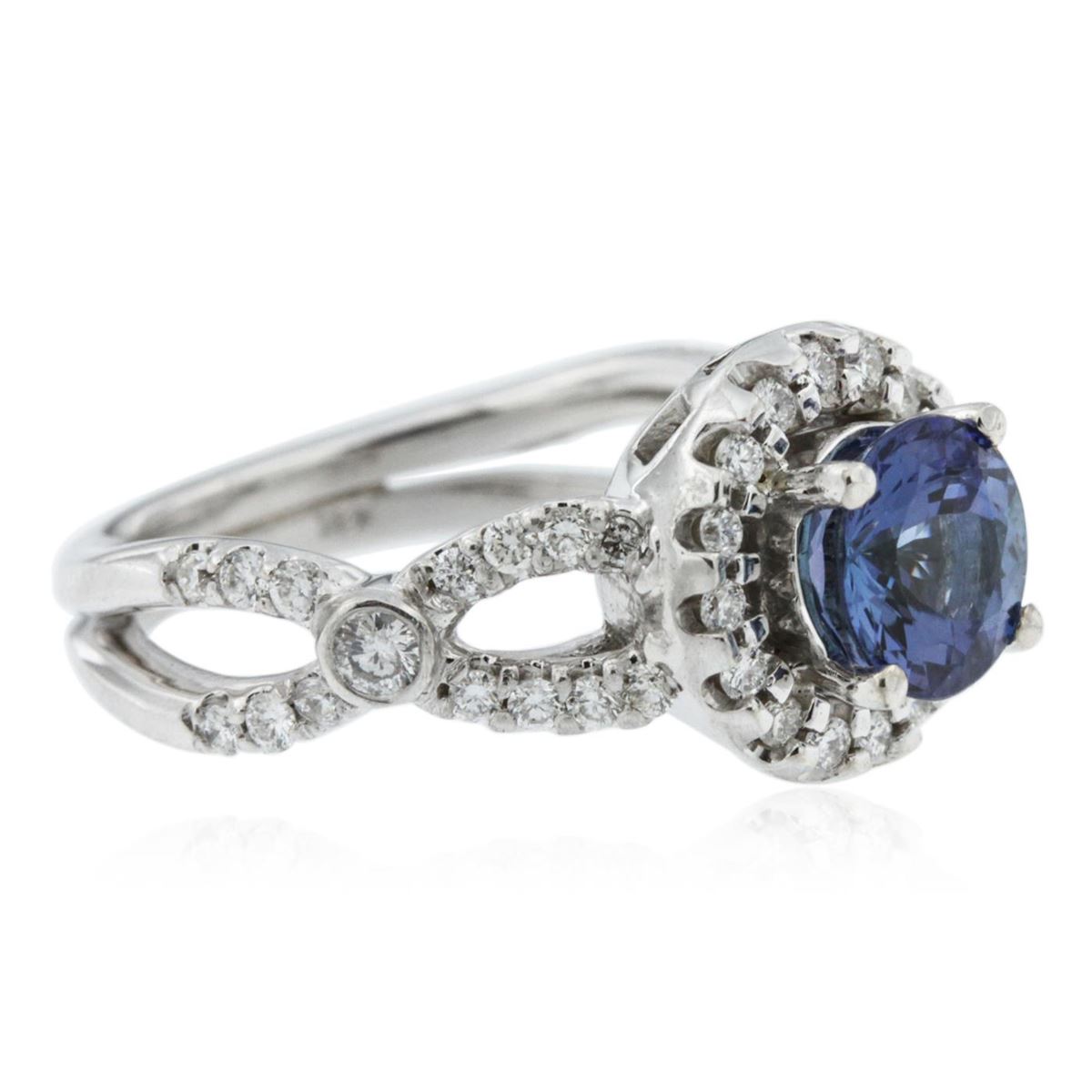 One electronically tested 14KT white gold ladies cast tanzanite and diamond ring with a bright polish finish. Identified with markings of "14KT". Condition is new. Containing: One prong set round modified brilliant cut natural tanzanite, measuring 6.50 - 6.50 x 4.23 mm, approximate weight of 1.20ct., clarity is eye clean, type I, medium, grayish, violet color, (GIA V 5/1), cut is very good. Forty-Six prong set round brilliant cut diamonds, measuring 1.30 - 1.30 x 0.78mm (depth est.) approximate total weight of 46 Stones = 0.37ct. Clarity: SI-2 to I-1. Color: I - J, Cut is Good. Colored gemstones are presumed to have been subjected to commonly used enhancement processes. All diamonds and colored gemstones are graded in the mounting, unless otherwise stated. Total Weight of Colored Stones 1.20ct. Total Weight of Diamonds 0.37ct. Total Weight of Ring 6.10 grams. GGL Appraised at $3,710.00.