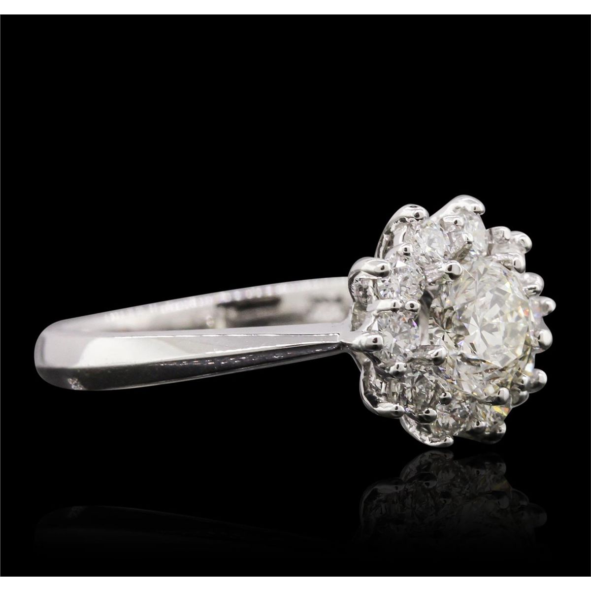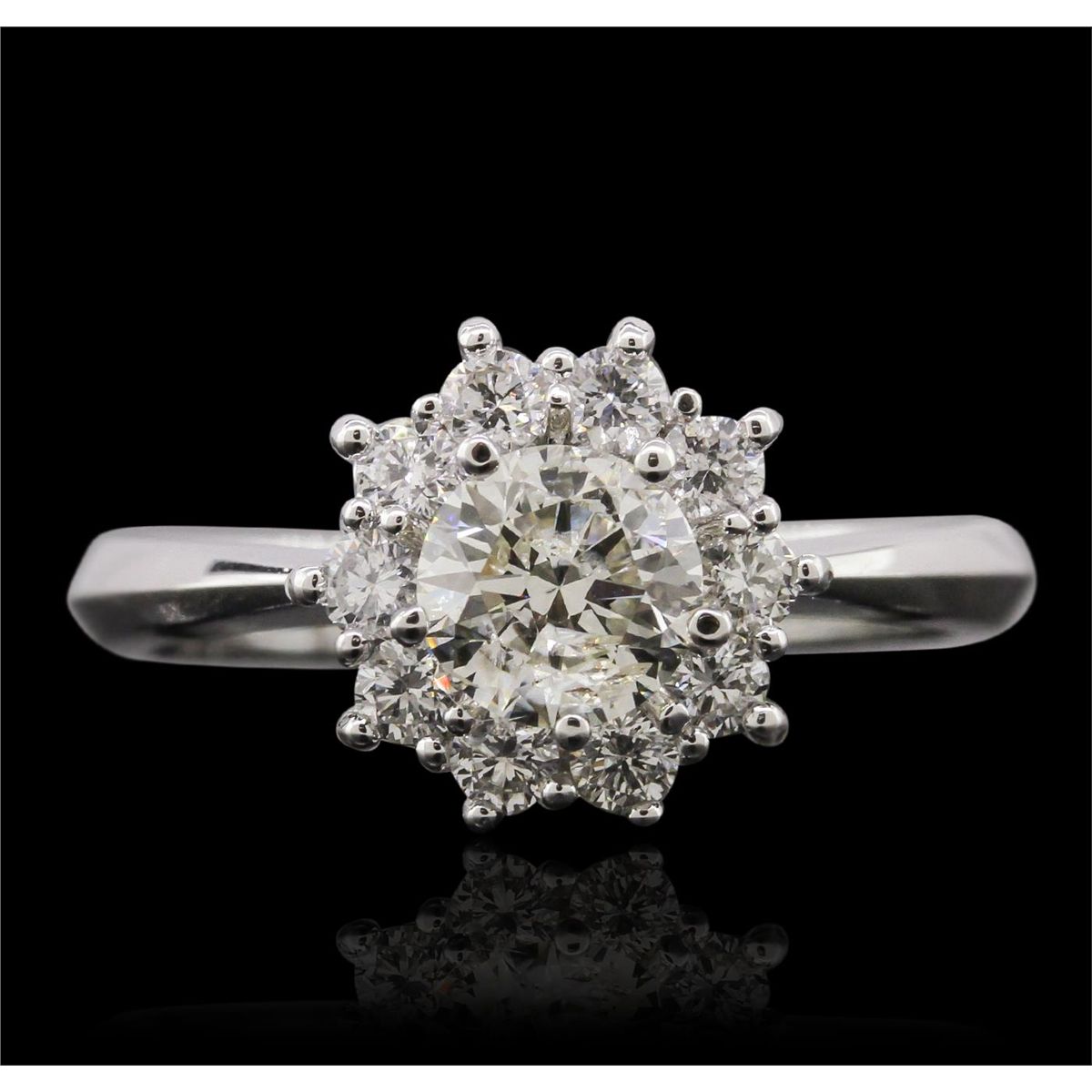 One electronically tested 14KT white gold ladies cast diamond floral ring with a bright polish finish. Condition is new, good workmanship. The featured diamond is set within a diamond bezel, completed by a two and one-half millimeter wide band. Identified with markings of "14K". Containing: One prong set round brilliant cut diamond, measuring 5.50 - 5.50 x 3.50mm approximate weight of 0.74ct. Graded in the setting. Clarity: I-1 . Color: 63.6%. Table 60.0%. Ten prong set round brilliant cut diamonds, measuring 2.20 - 2.10 x 1.29mm (depth est.) approximate. Total Weight of 10 Stones = 0.46ct. Graded in the setting. Clarity: SI-2 to I-1 . Color: G - I. Total Weight of Diamonds 1.20ct.. Total Weight of Ring 3.30 grams. AIG Appraised at $7,700.00.