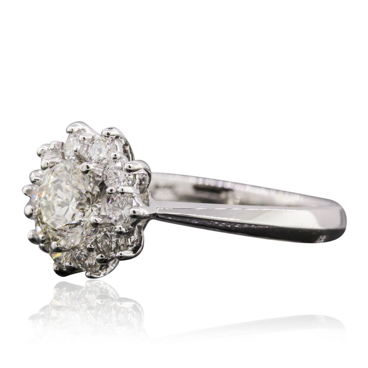 One electronically tested 14KT white gold ladies cast diamond floral ring with a bright polish finish. Condition is new, good workmanship. The featured diamond is set within a diamond bezel, completed by a two and one-half millimeter wide band. Identified with markings of "14K". Containing: One prong set round brilliant cut diamond, measuring 5.50 - 5.50 x 3.50mm approximate weight of 0.74ct. Graded in the setting. Clarity: I-1 . Color: 63.6%. Table 60.0%. Ten prong set round brilliant cut diamonds, measuring 2.20 - 2.10 x 1.29mm (depth est.) approximate. Total Weight of 10 Stones = 0.46ct. Graded in the setting. Clarity: SI-2 to I-1 . Color: G - I. Total Weight of Diamonds 1.20ct.. Total Weight of Ring 3.30 grams. AIG Appraised at $7,700.00.