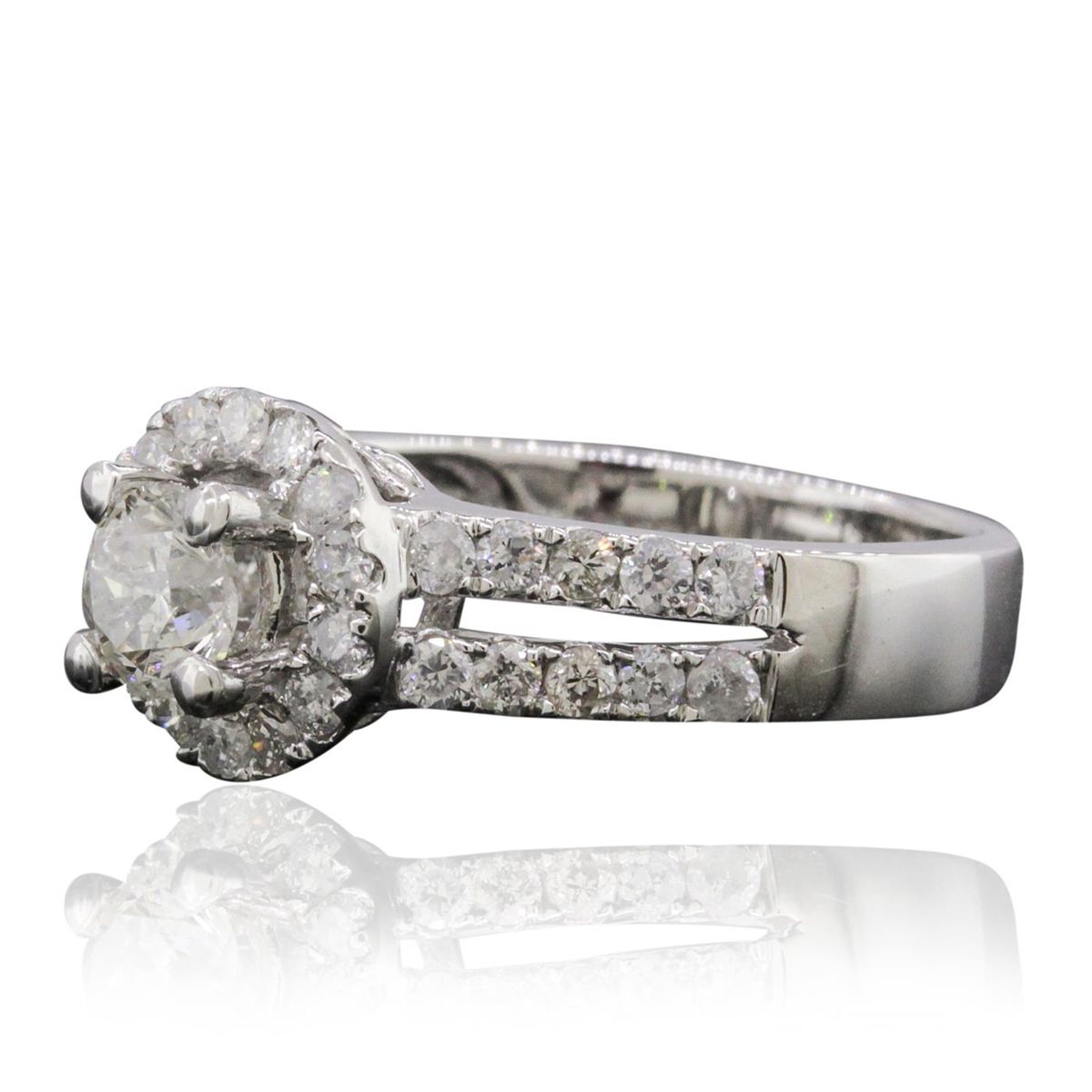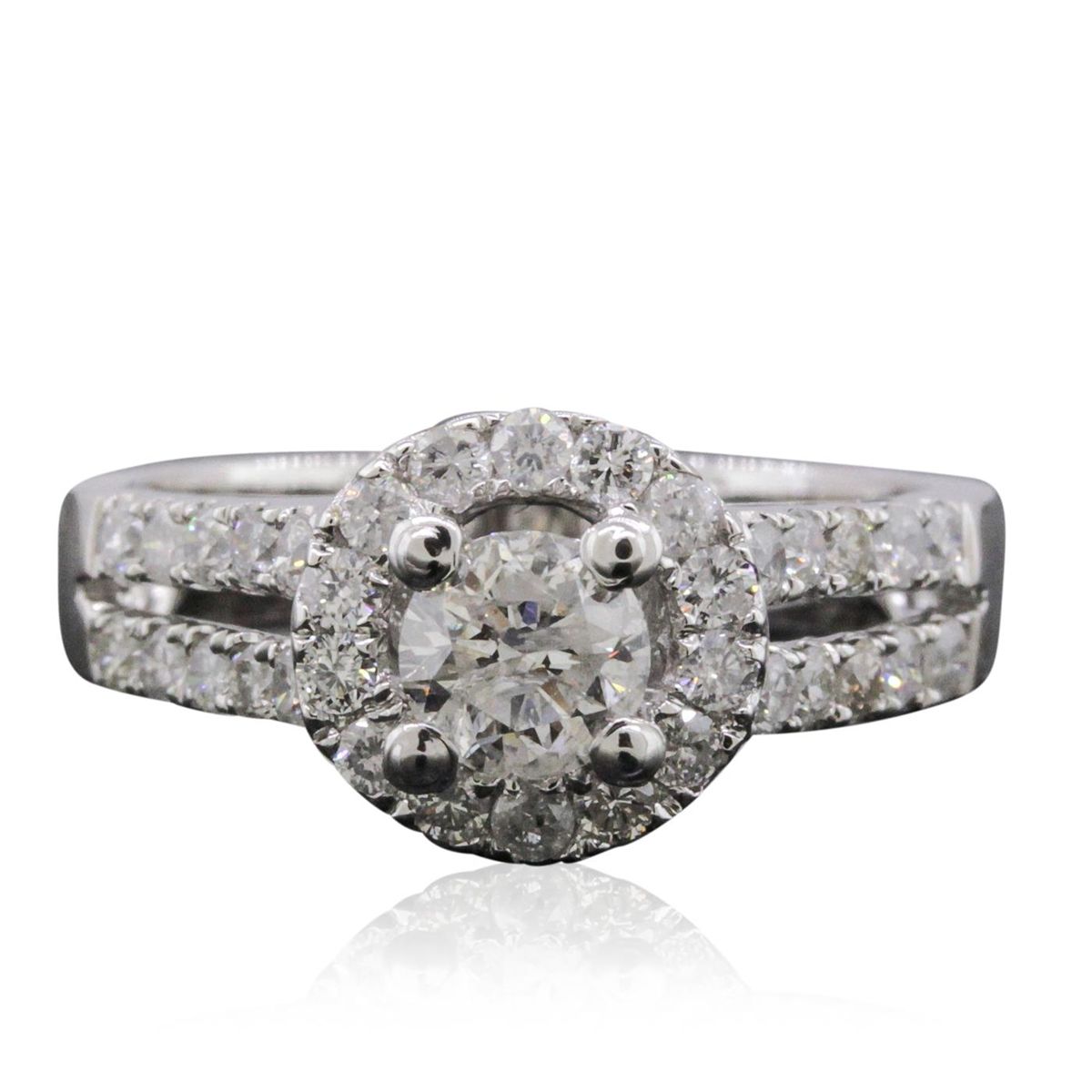 One electronically tested 14KT white gold ladies combination cast & assembled engagement ring with a split shank with a bright polish finish. Identified with markings of "14K". Condition is new. Containing: One prong set round brilliant cut diamond, measuring 5.40 - 5.20 x 3.47mm (depth est.) approximate weight of 0.60ct. Clarity: I-1. Color: J, Cut is Good. Thirty-Four prong set round brilliant cut diamonds, measuring 1.80 - 1.60 x 1.02mm (depth est.) approximate total weight of 34 Stones = 0.61ct. Clarity: I-1 to I-2. Color: I - J, Cut is Good. All diamonds are graded in the mounting, unless otherwise stated. Total Weight of Diamonds 1.20ct. Total Weight of Ring 4.60 grams. GGL Appraised at $6,255.00.