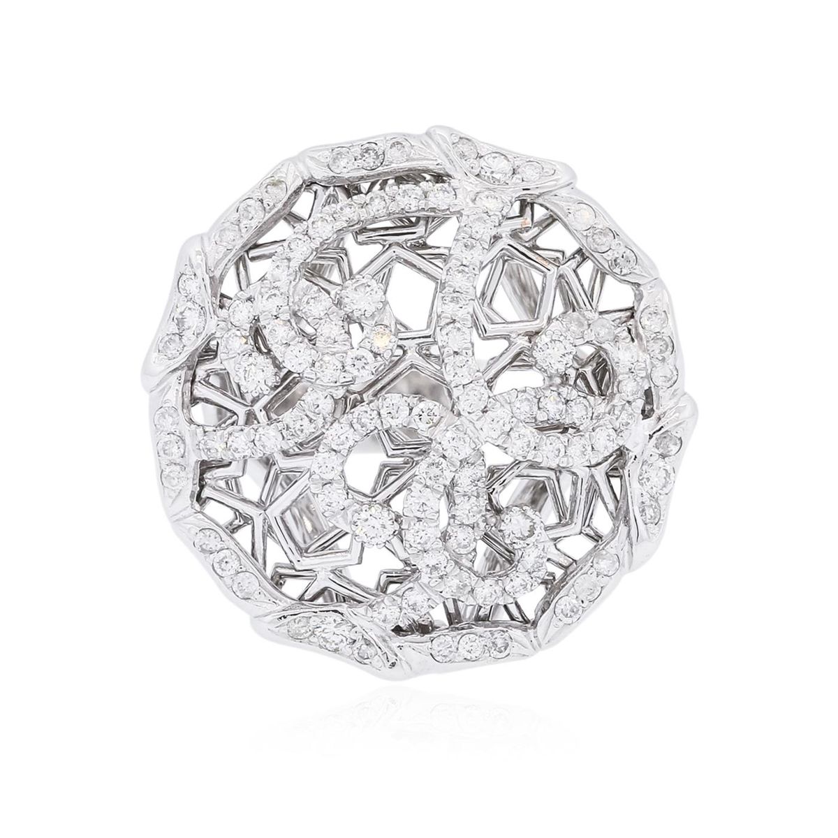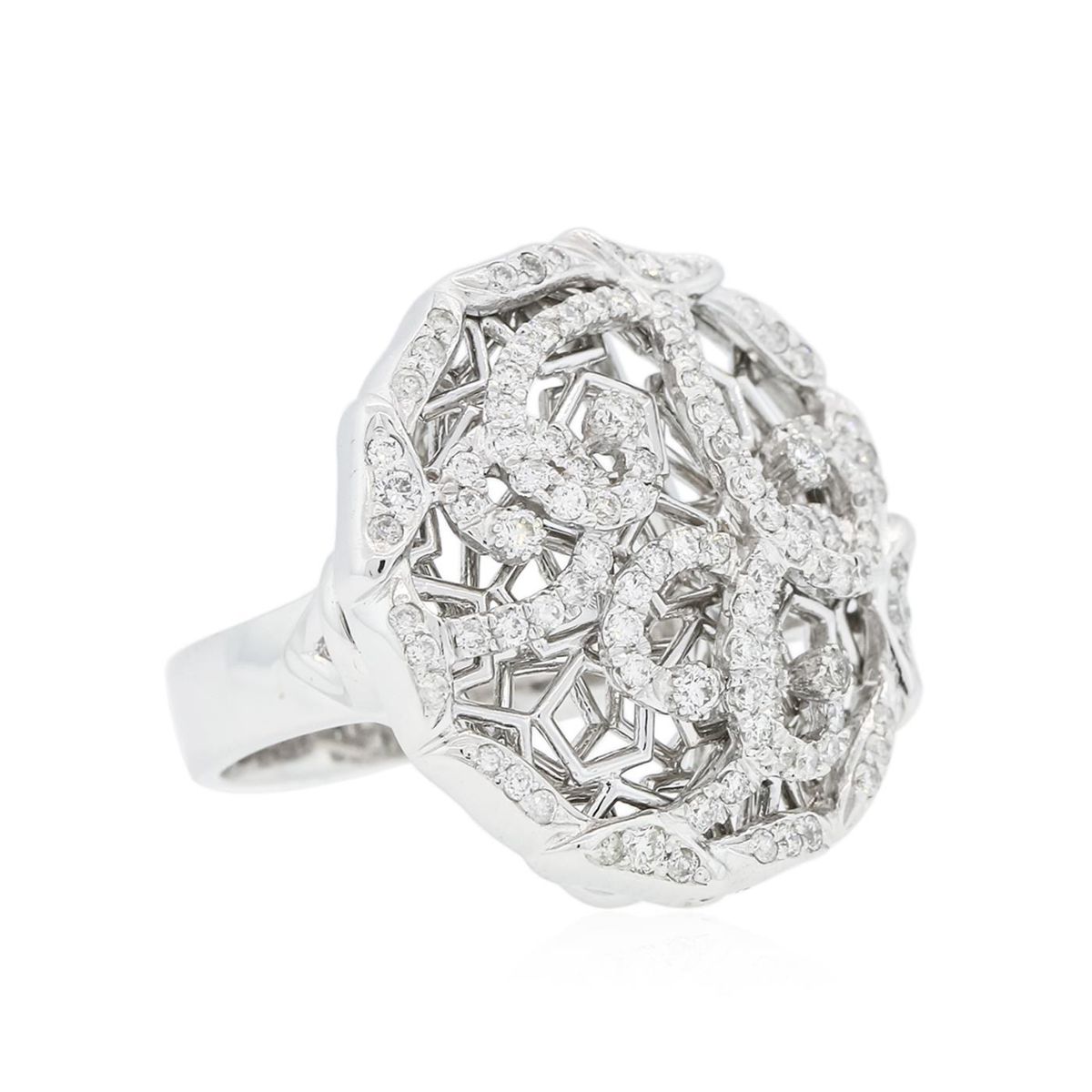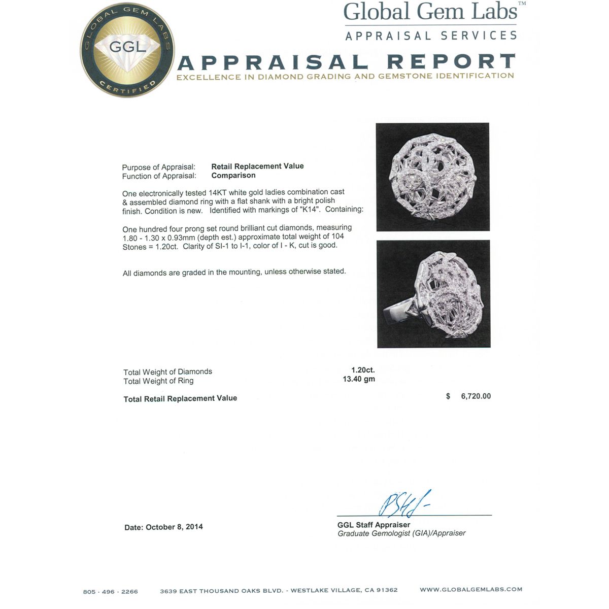 One electronically tested 14KT white gold ladies combination cast & assembled diamond ring with a flat shank with a bright polish finish. Identified with markings of "K14". Condition is new. Containing: One Hundred Four prong set round brilliant cut diamonds, measuring 1.80 - 1.30 x 0.93mm (depth est.) approximate total weight of 104 Stones = 1.20ct. Clarity: SI-1 to I-1. Color: I - K, Cut is Good. All diamonds are graded in the mounting, unless otherwise stated. Total Weight of Diamonds 1.20ct. Total Weight of Ring 13.40 grams. GGL Appraised at $6,720.00.