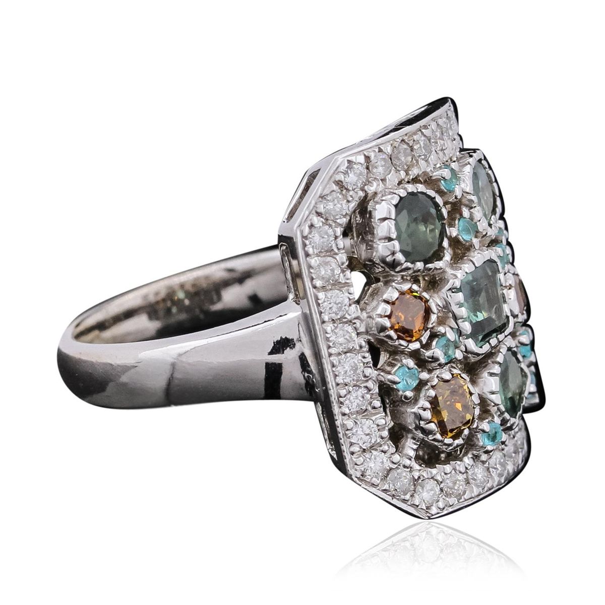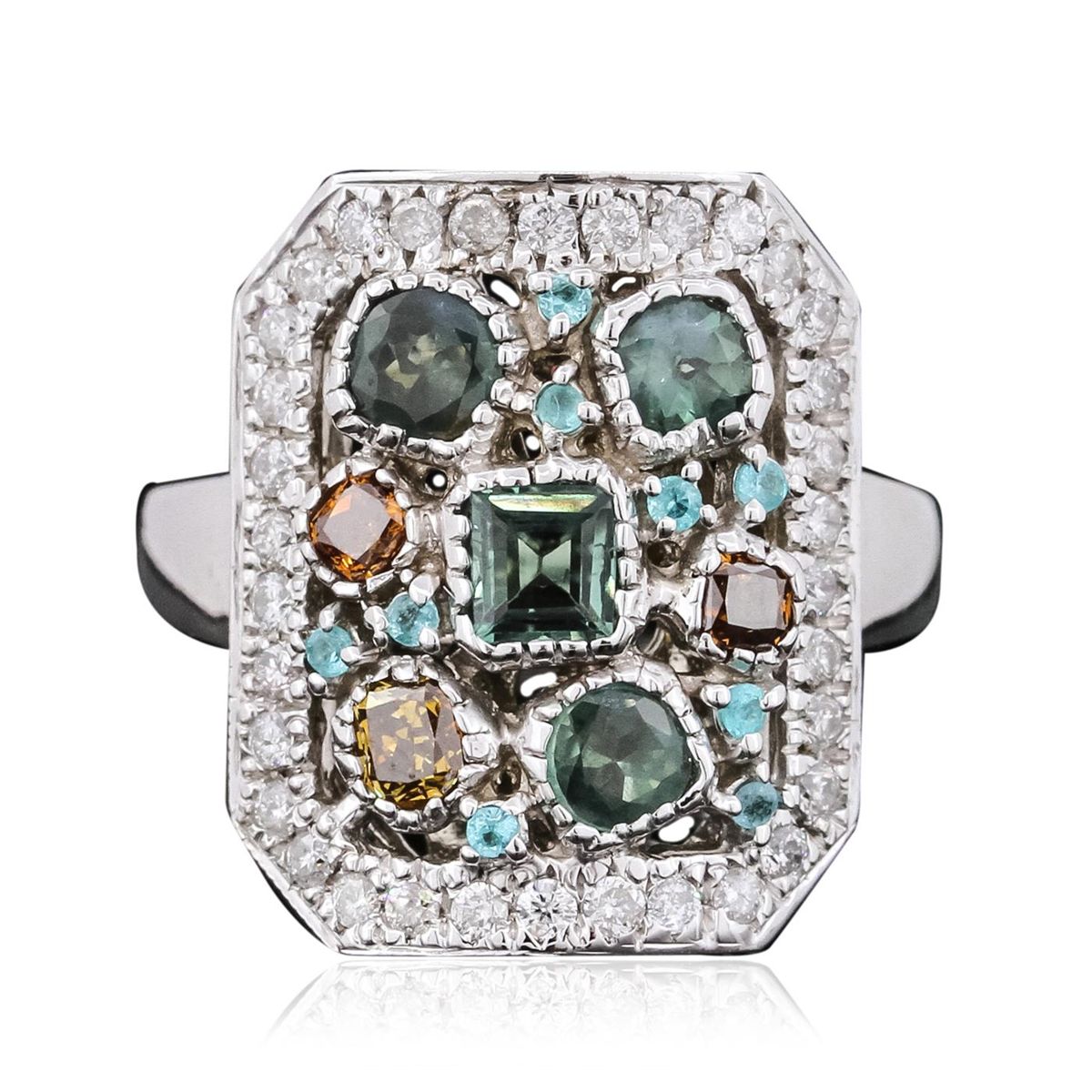 One ring featuring: 7.89 grams of 14KT white gold, alexandrite with a total weight of 1.21cts, paraiba with a total weight of 0.03cts, diamonds with a total weight of 0.79cts.