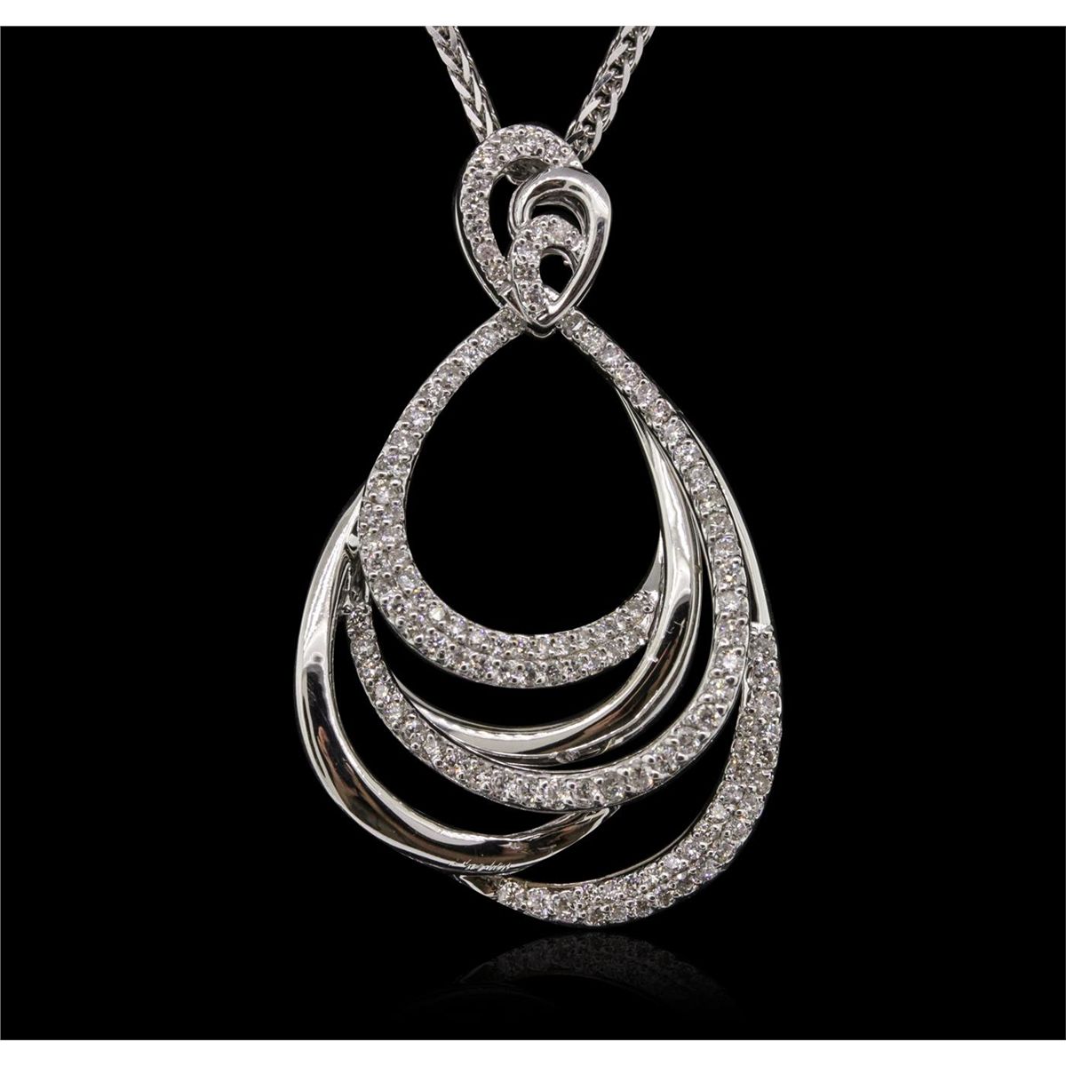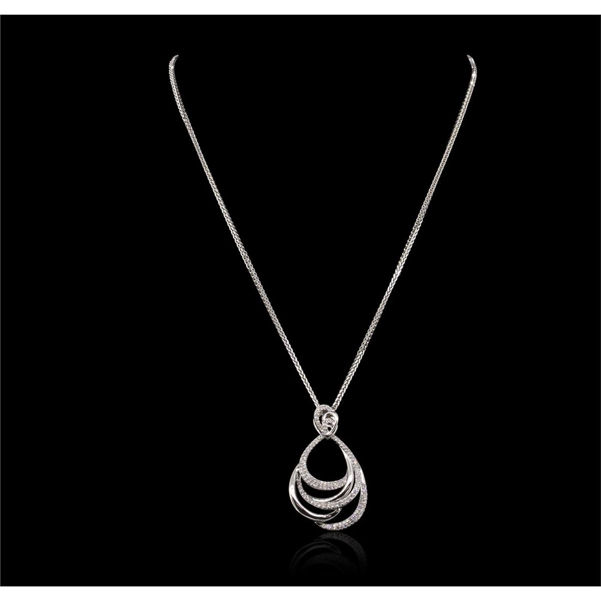 One electronically tested 14KT white gold ladies combination cast & assembled pendant & chain 17.5" long, medium cable link with a lobster claw clasp with a bright polish finish. Condition is new. Identified with markings of "585". Containing: One Hundred Twenty-One prong set round brilliant cut diamonds, measuring 1.50 - 1.30 x 0.84mm (depth est.) approximate. Total Weight of 121 Stones = 1.21ct. Clarity: SI-2 to I-2. Color: I - J, Cut is Good. All diamonds are graded in the mounting, unless otherwise stated. Total Weight of Diamonds 1.21ct. Total Weight of Pendant & Chain 11.90 grams. GGL Appraised at $7,220.00.