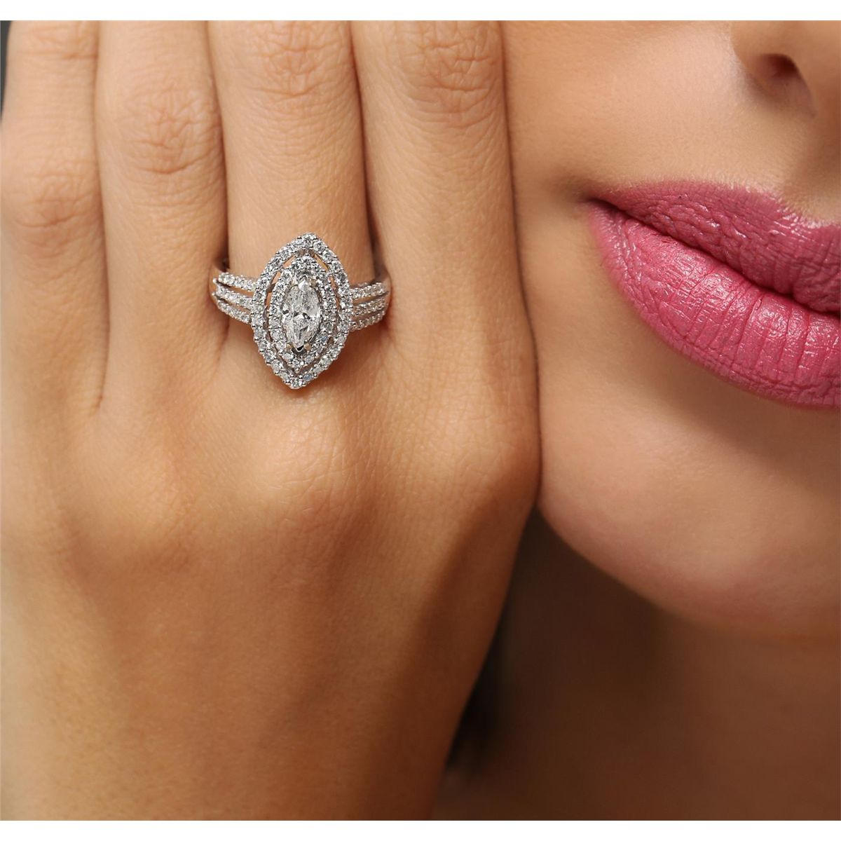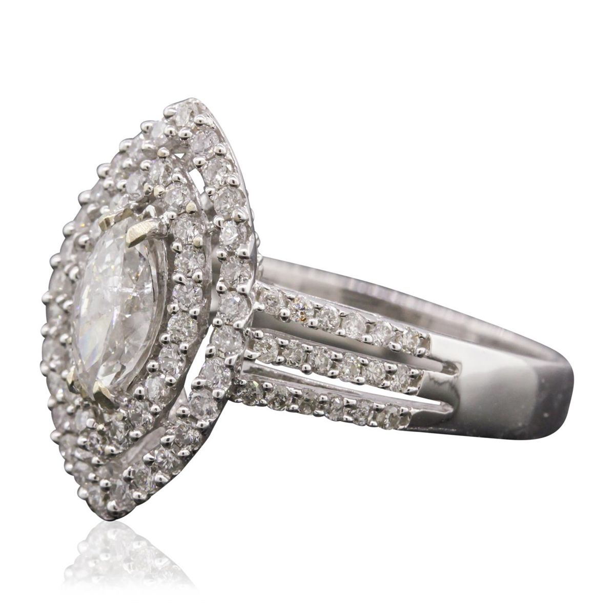 One electronically tested 14KT white gold Ladies combination cast & assembled engagement ring with a bright polish finish. Condition is new. Identified with markings of "14K". Containing: One prong set marquise shaped cut diamond, measuring 7.90 x 4.30 x 2.71mm (depth est.) approximate weight of 0.53ct. Clarity: I-2. Color: I, Cut is Good. Eighty-Four prong set round brilliant cut diamonds, measuring 1.30 - 1.30 x 0.78mm (depth est.) approximate. Total Weight of 84 Stones = 0.67ct. Clarity: I-1 to I-3. Color: H - I, Cut is Good. All grading of diamonds and colored gemstones in this piece of jewelry are graded in the mounting, unless otherwise stated. Total Weight of Diamonds 1.21ct. Total Weight of Engagement Ring 4.90 grams. GGL Appraised at $5,410.00.