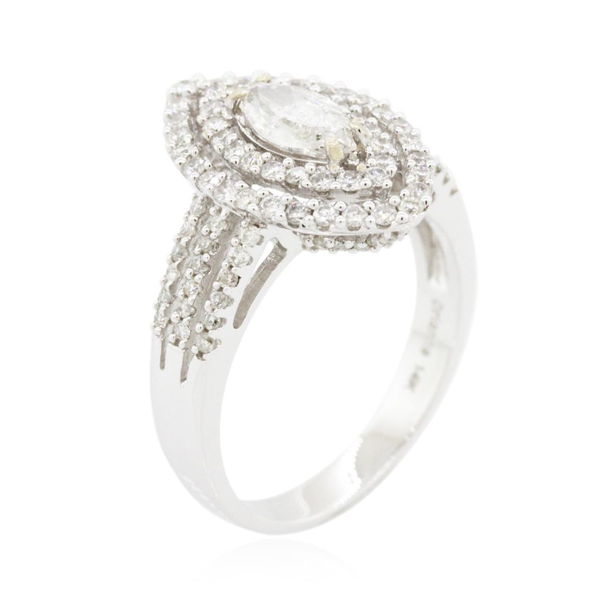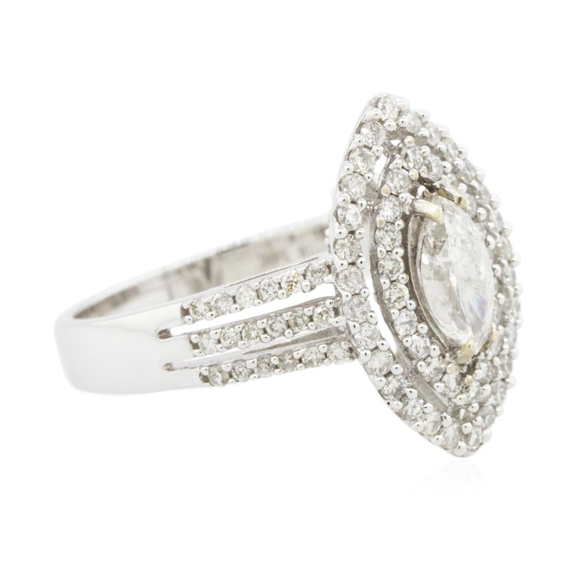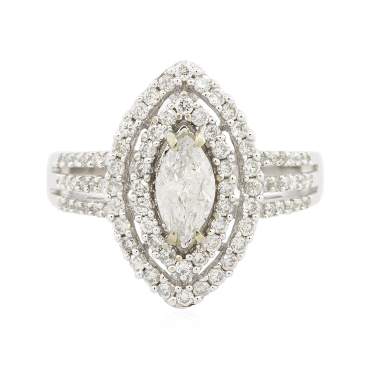 One electronically tested 14KT white gold Ladies combination cast & assembled engagement ring with a bright polish finish. Condition is new. Identified with markings of "14K". Containing: One prong set marquise shaped cut diamond, measuring 7.90 x 4.30 x 2.71mm (depth est.) approximate weight of 0.53ct. Clarity: I-2. Color: I, Cut is Good. Eighty-Four prong set round brilliant cut diamonds, measuring 1.30 - 1.30 x 0.78mm (depth est.) approximate. Total Weight of 84 Stones = 0.67ct. Clarity: I-1 to I-3. Color: H - I, Cut is Good. All grading of diamonds and colored gemstones in this piece of jewelry are graded in the mounting, unless otherwise stated. Total Weight of Diamonds 1.21ct. Total Weight of Engagement Ring 4.90 grams. GGL Appraised at $5,410.00.
