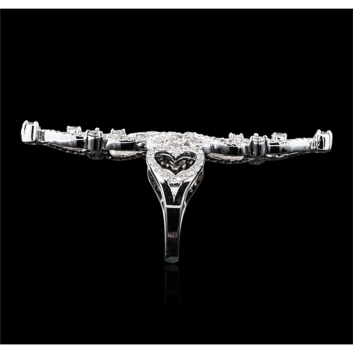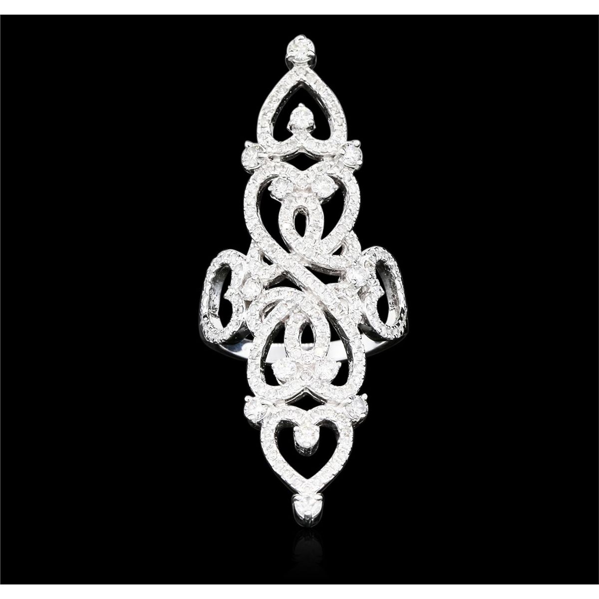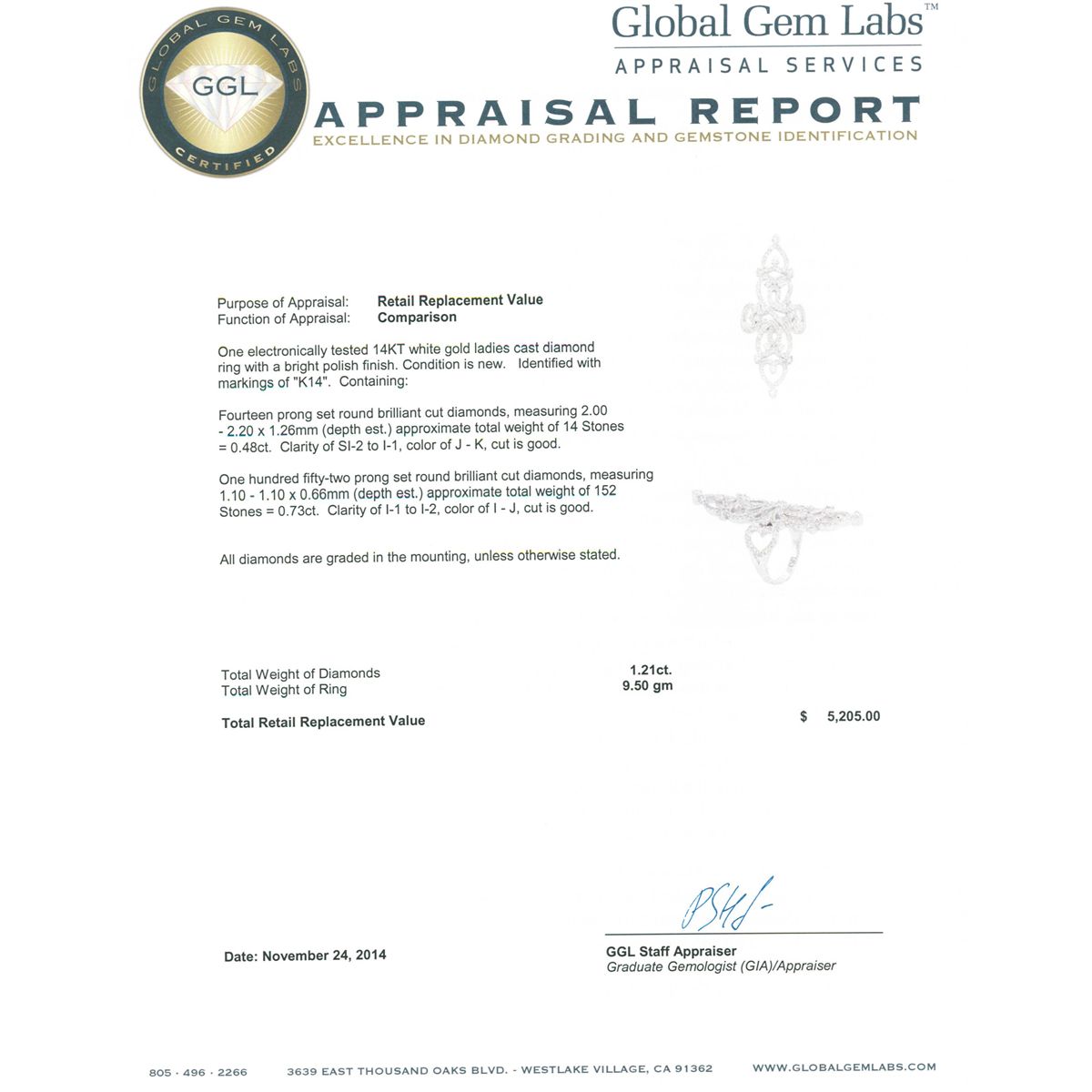 One electronically tested 14KT white gold ladies cast diamond ring with a bright polish finish. Identified with markings of "K14". Condition is new. Containing: Fourteen prong set round brilliant cut diamonds, measuring 2.00 - 2.20 x 1.26mm (depth est.) approximate total weight of 14 Stones = 0.48ct. Clarity: SI-2 to I-1. Color: J - K, Cut is Good. One Hundred Fifty-Two prong set round brilliant cut diamonds, measuring 1.10 - 1.10 x 0.66mm (depth est.) approximate total weight of 152 Stones = 0.73ct. Clarity: I-1 to I-2. Color: I - J, Cut is Good. All diamonds are graded in the mounting, unless otherwise stated. Total Weight of Diamonds 1.21ct. Total Weight of Ring 9.50 grams. GGL Appraised at $5,205.00.
