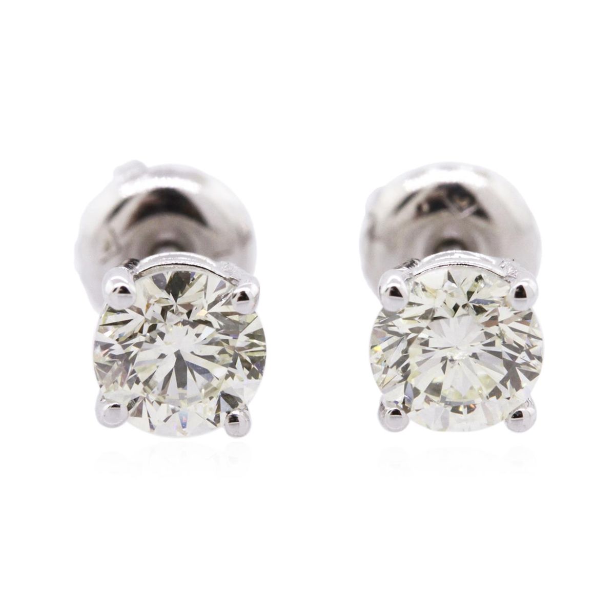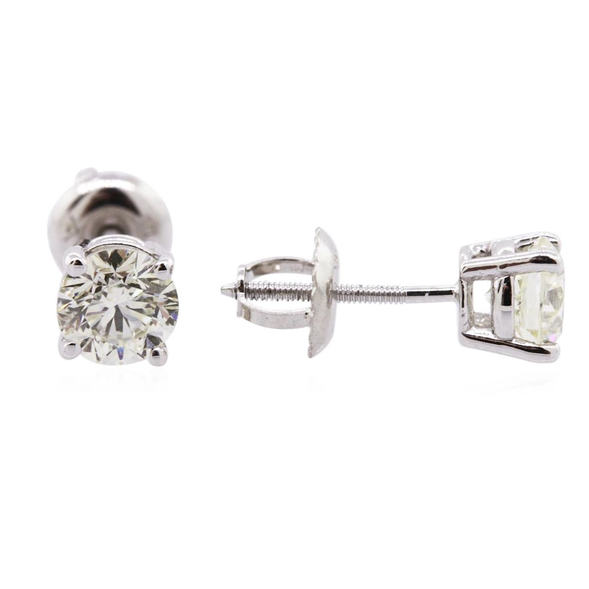 One pair electronically tested 14KT white gold cast & assembled diamond solitaire earrings with screw backs. Bright polish finish. Condition is new, good workmanship. Containing: One prong set round brilliant cut diamond, measuring 4.96 - 4.95 x 3.30mm (depth est.), 3.00% GTCF approximate weight of 0.61ct with a faint blue fluorescence. Graded in the setting. Clarity: SI-2. Depth: 66.5%. Table 58.5%. One prong set round brilliant cut diamond, measuring 4.96 - 4.95 x 3.25mm (depth est.), 3.00% GTCF approximate weight of 0.60ct with a faint blue fluorescence. Graded in the setting. Clarity: SI-2. Depth: 65.5%. Table 56.5%. Total Weight of Diamonds 1.21ct. Total Weight of Earrings 0.96 grams. AIG Appraised at $4,130.00.