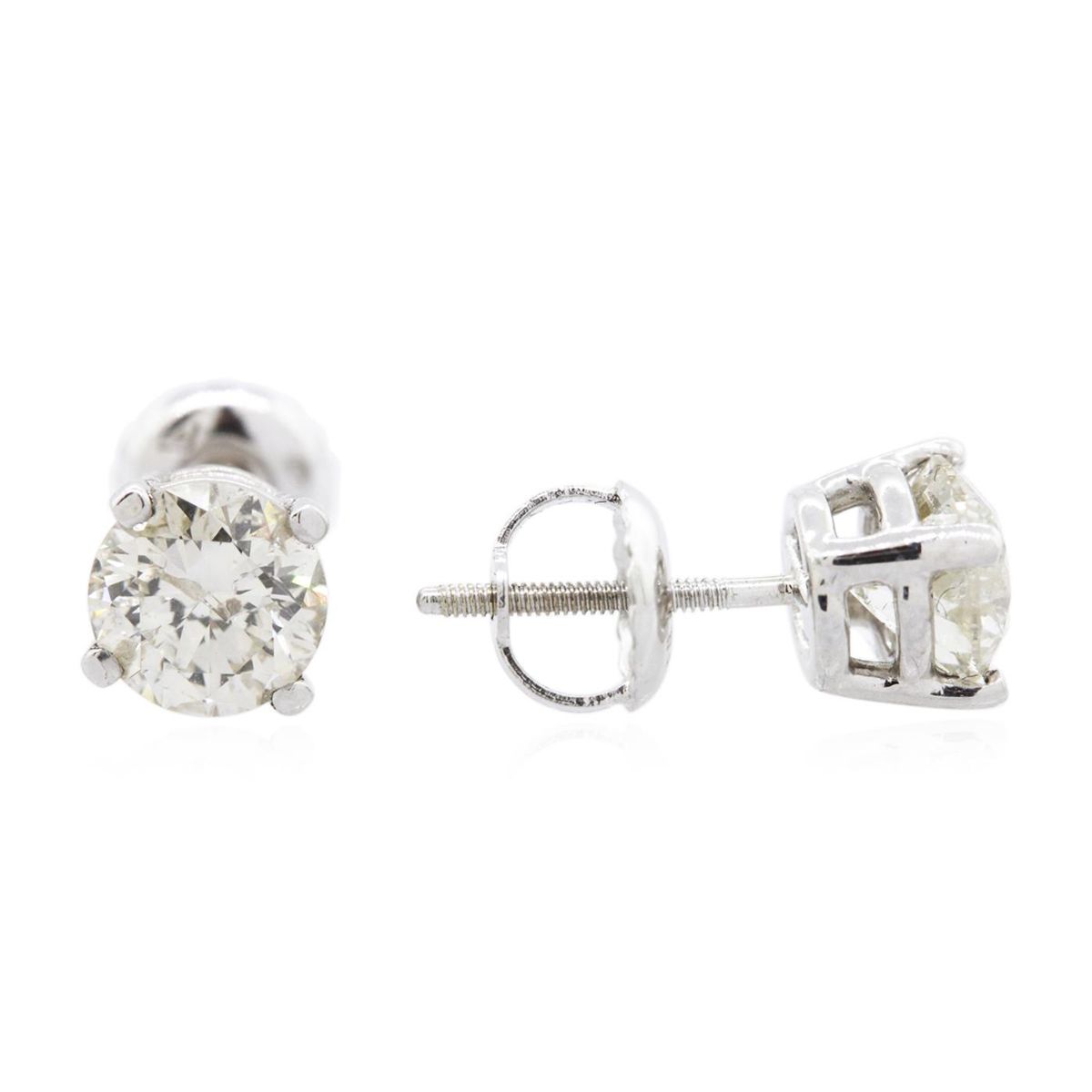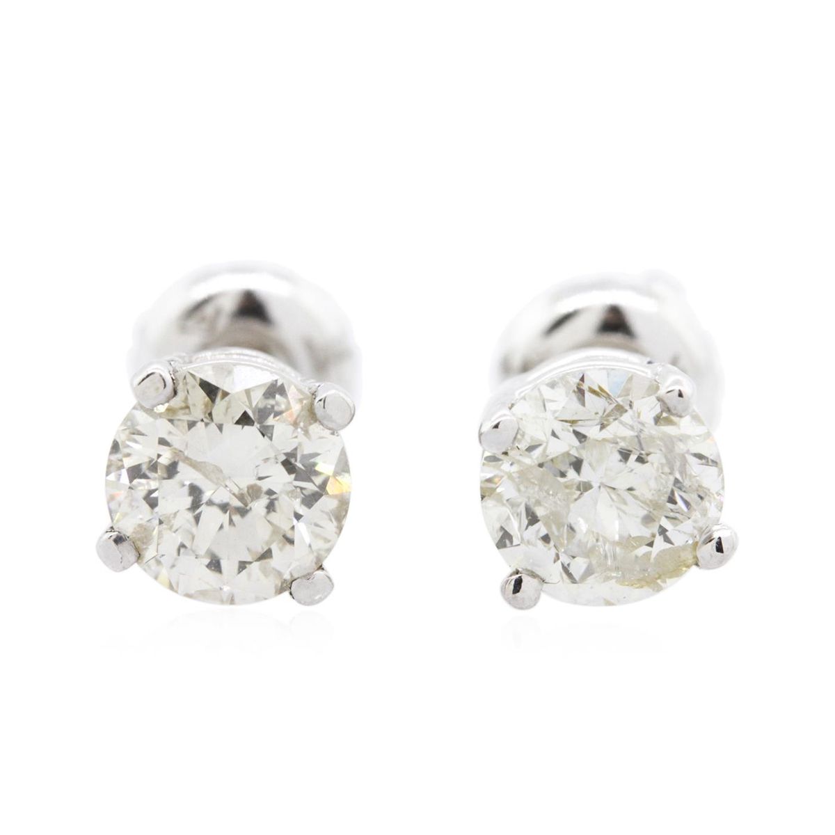 One pair electronically tested 14KT white gold ladies cast stud earrings with friction posts with a bright polish finish. Identified with markings of "14K". Condition is new. Containing: One shared prong set round brilliant cut diamond, measuring 5.54 - 5.53 x 3.31mm (depth est.) approximate weight of 0.62ct. Clarity: I-2. Color: K, Cut is Good. One prong set round brilliant cut diamond, measuring 5.43 - 5.43 x 3.28mm (depth est.) approximate weight of 0.59ct. Clarity: I-3. Color: J, Cut is Good. All diamonds are graded in the mounting, unless otherwise stated total weight of Diamonds 1.21ct. Total Weight of Earrings 1.60 grams. GGL Appraised at $4,140.00.