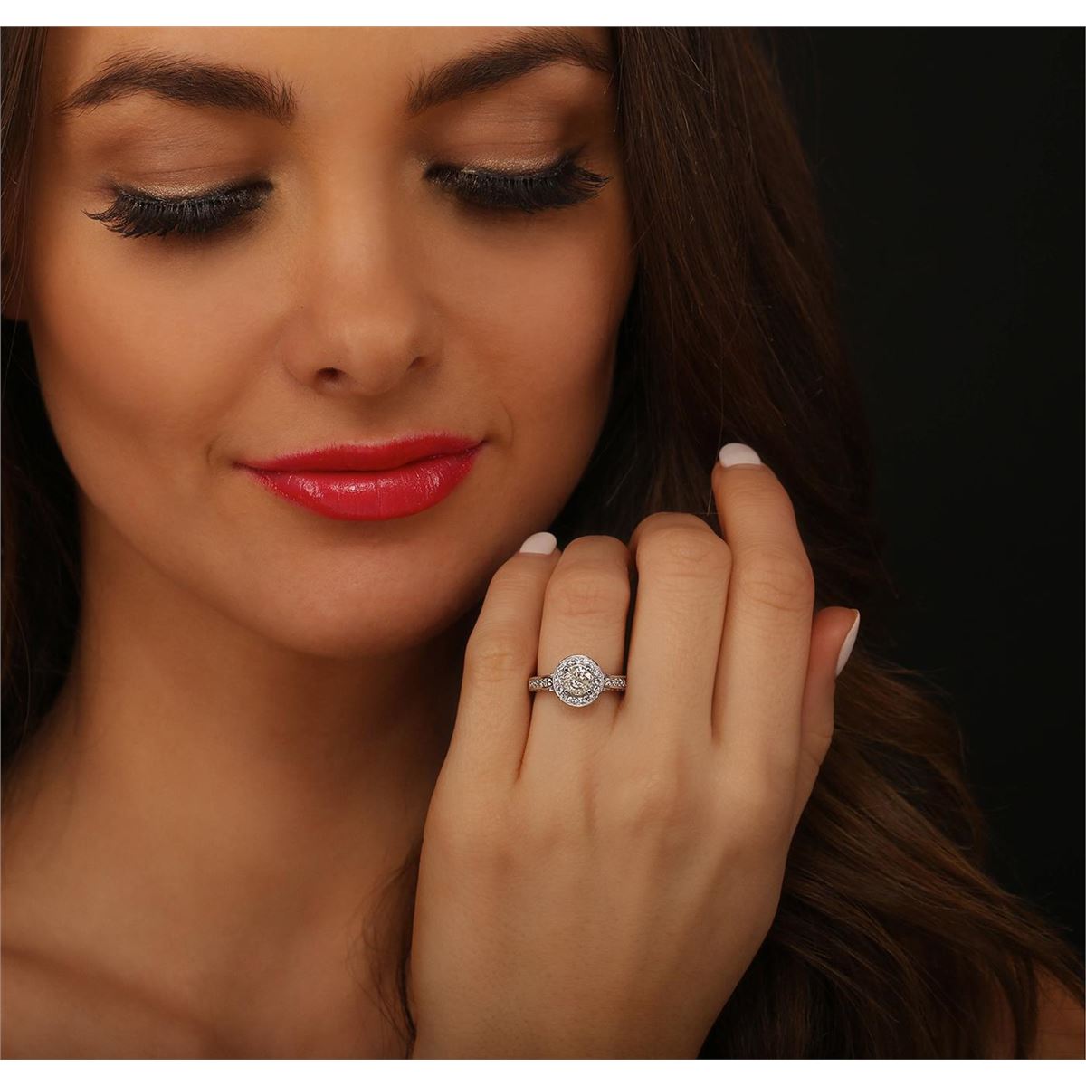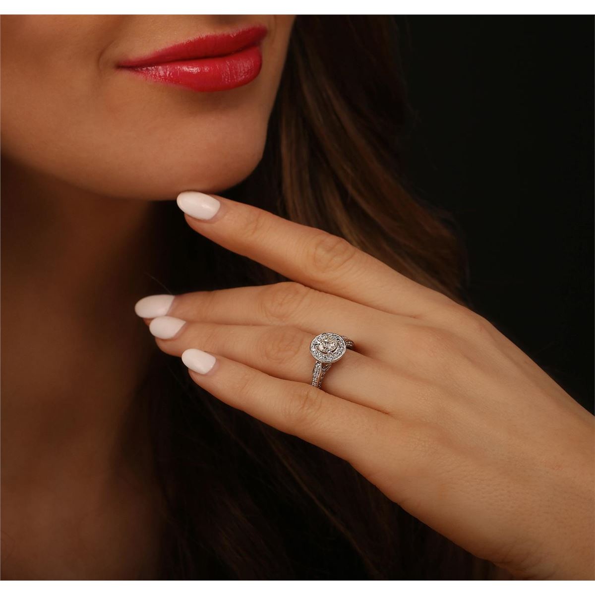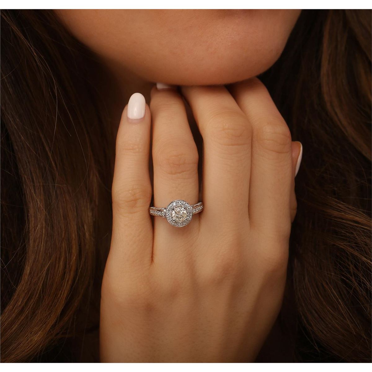 One electronically tested 14KT white gold ladies cast diamond unity ring with a bright polish finish. Condition is new, good workmanship. The featured diamond is set within a diamond bezel supported by diamond set shoulders, completed by a two millimeter wide band. Identified with markings of "14K". Containing: One prong set round brilliant cut diamond, measuring 5.60 - 5.50 x 3.25mm (depth est.) approximate weight of 0.71ct. Graded in the setting. Clarity: I-2 . Color: J Depth 58.6%. Table 64.9%. Fifty-Eight prong set round brilliant cut diamonds, measuring 1.30 - 1.20 x 0.75mm (depth est.) approximate. Total Weight of 58 Stones = 0.51ct. Graded in the setting. Clarity: VS-1 to SI-1 . Color: G - I. Total Weight of Diamonds 1.22ct.. Total Weight of Ring 3.82 grams. AIG Appraised at $6,615.00.