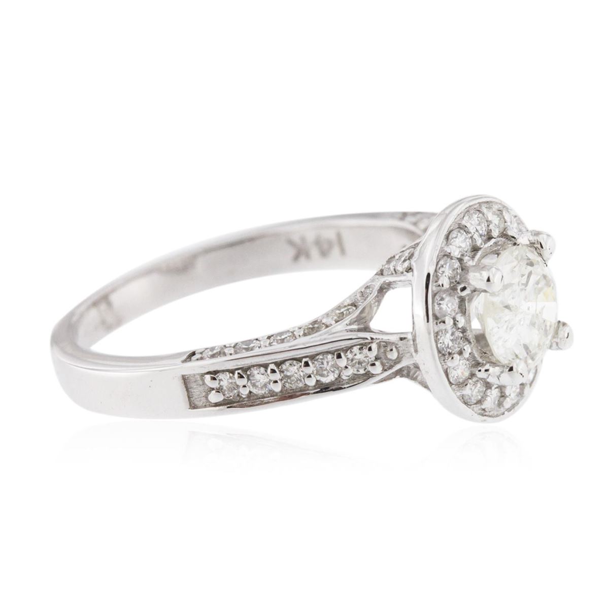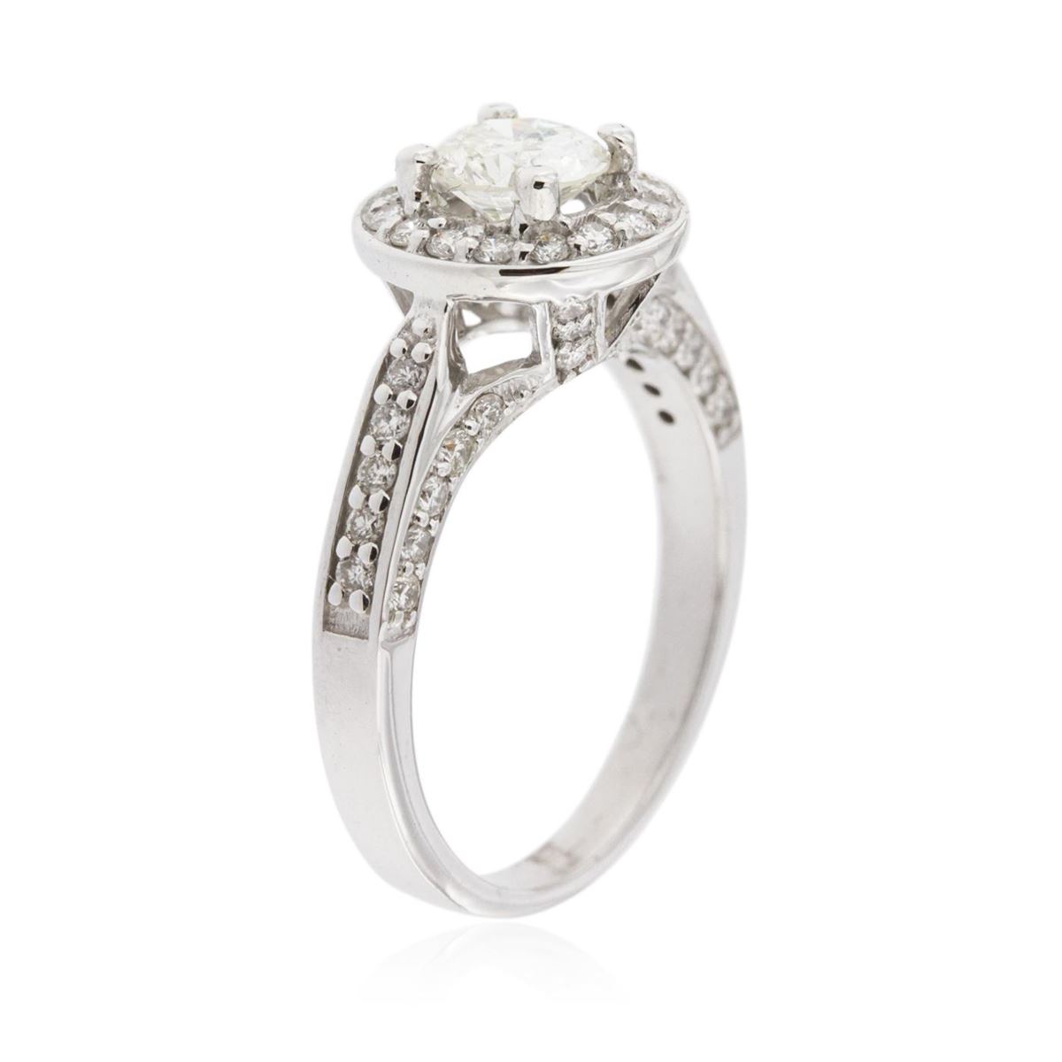 One electronically tested 14KT white gold ladies cast diamond unity ring with a bright polish finish. Condition is new, good workmanship. The featured diamond is set within a diamond bezel supported by diamond set shoulders, completed by a two millimeter wide band. Identified with markings of "14K". Containing: One prong set round brilliant cut diamond, measuring 5.60 - 5.50 x 3.25mm (depth est.) approximate weight of 0.71ct. Graded in the setting. Clarity: I-2 . Color: J Depth 58.6%. Table 64.9%. Fifty-Eight prong set round brilliant cut diamonds, measuring 1.30 - 1.20 x 0.75mm (depth est.) approximate. Total Weight of 58 Stones = 0.51ct. Graded in the setting. Clarity: VS-1 to SI-1 . Color: G - I. Total Weight of Diamonds 1.22ct.. Total Weight of Ring 3.82 grams. AIG Appraised at $6,615.00.