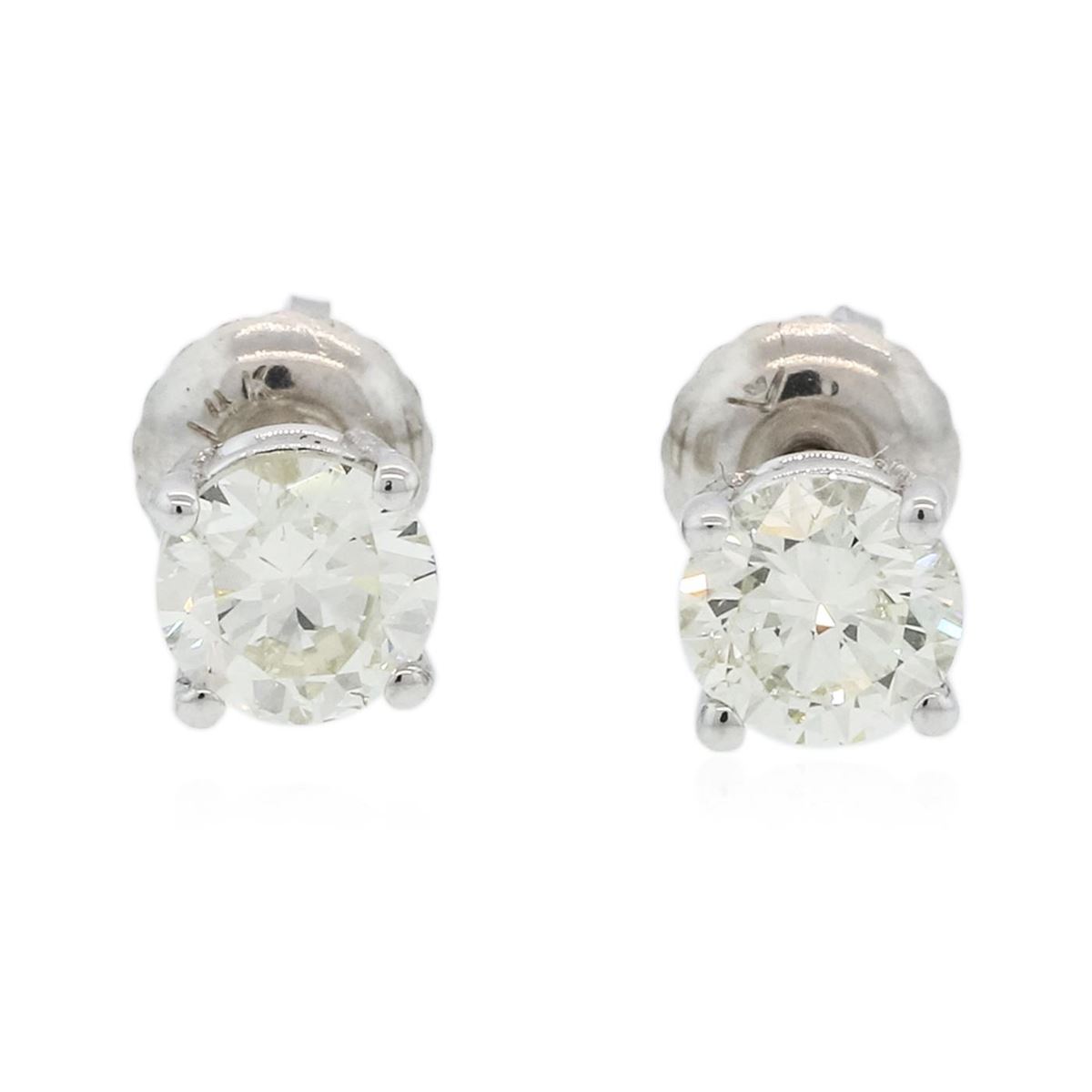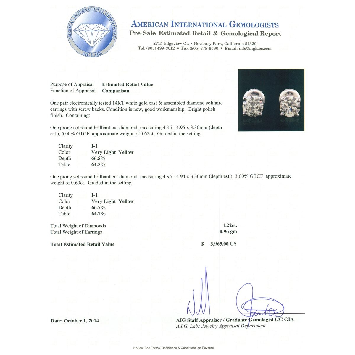 One pair electronically tested 14KT white gold cast & assembled diamond solitaire earrings with screw backs. Bright polish finish. Condition is new, good workmanship. Containing: One prong set round brilliant cut diamond, measuring 4.96 - 4.95 x 3.30mm (depth est.), 5.00% GTCF approximate weight of 0.62ct. Graded in the setting. Clarity: I-1. Depth: 66.5%. Table 64.5%. One prong set round brilliant cut diamond, measuring 4.95 - 4.94 x 3.30mm (depth est.), 3.00% GTCF approximate weight of 0.60ct. Graded in the setting. Clarity: I-1. Depth: 66.7%. Table 64.7%. Total Weight of Diamonds 1.22ct. Total Weight of Earrings 0.96 grams. AIG Appraised at $3,965.00.