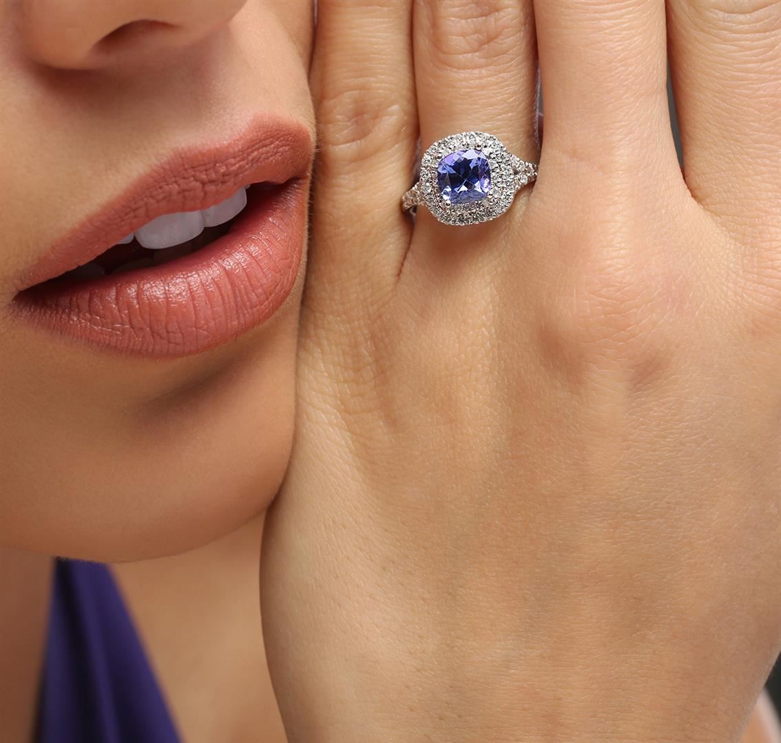 One electronically tested 14KT white gold ladies cast tanzanite and diamond ring with a bright polish finish. Identified with markings of "K14". Condition is new. Containing: One prong set square cushion modified brilliant cut natural tanzanite, measuring 6.20 x 6.20 x 4.03mm, approximate weight of 1.22ct., clarity is eye clean, type I, medium light, very slightly grayish, violet color, (GIA V 4/3), cut is good. Fifty-Nine prong set round brilliant cut diamonds, measuring 1.30 - 1.30 x 0.78mm (depth est.) approximate total weight of 59 Stones = 0.47ct. Clarity: SI-2 to I-2. Color: H - I, Cut is Good. Colored gemstones are presumed to have been subjected to commonly used enhancement processes. All diamonds and colored gemstones are graded in the mounting, unless otherwise stated. Total Weight of Colored Stones 1.22ct. Total Weight of Diamonds 0.47ct. Total Weight of Ring 4.40 grams. GGL Appraised at $3,305.00.