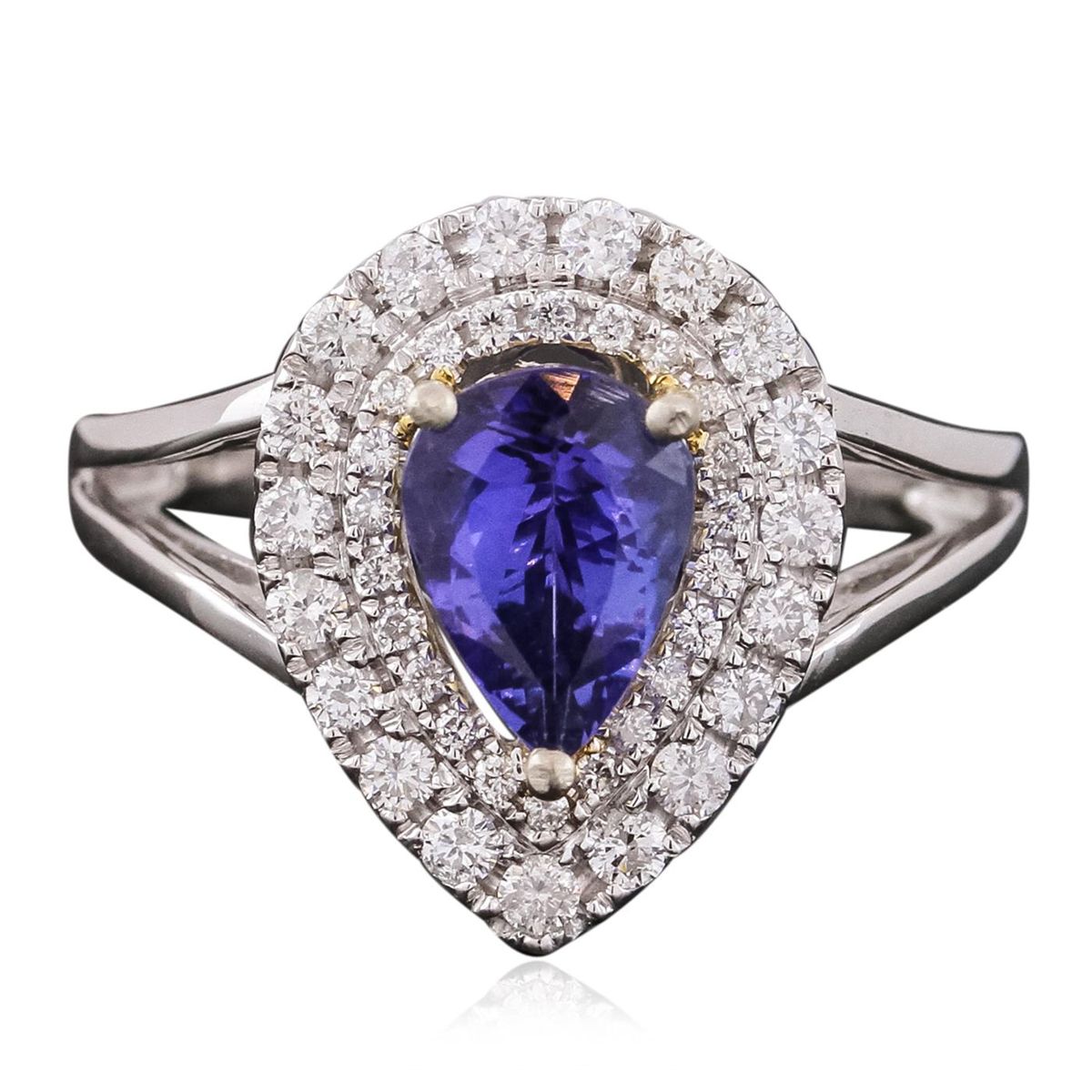 One electronically tested 14KT white gold ladies cast tanzanite and diamond ring with a bright polish finish. The featured tanzanite is set within a tiered diamond bezel supported by split shoulders, completed by a two and one-half millimeter wide band. Identified with markings of "14K". Condition is new, good workmanship. Containing: One prong set pear brilliant cut natural tanzanite, measuring 8.60 x 6.25 x 3.20mm, 6% bulge factor, approximate weight of 1.22ct., clarity is eye clean, type I, medium dark, very slightly grayish, violetish blue color, (GIA vB 6/3), cut is good. Transmitting light with no distortion, transparent. Graded in the setting. Tanzanite is a very rare gemstone that is only found in the country of Tanzania. Originally discovered in 1967. Tiffany & Company, named the stone Tanzanite. It is found in the Usumburu Mountains that border the Umba Valley of northern Tanzania. Tanzanite occurs in gray, brown, violet, blue, reddish-purple, & green. The gem is interesting because of its exceptional pleochroism. Rotated in different directions a tanzanite will exhibit multiple changes of color. Tanzanite has a low tolerance to ultrasonic cleaning, and should not be cleaned using this method. Nineteen prong set round brilliant cut diamonds, measuring 1.80 - 1.70 x 1.05mm (depth est.) approximate total weight of 19 Stones = 0.47ct. Graded in the setting. Clarity: SI-1 to I-1. Color: G - I Twenty-Two prong set round brilliant cut diamonds, measuring 1.10 - 1.00 x 0.63mm (depth est.) approximate total weight of 22 Stones = 0.19ct. Graded in the setting. Clarity: SI-1 to I-1. Color: G - I. Total Weight of Colored Stones 1.22ct. Total Weight of Diamonds 0.66ct. Total Weight of Ring 5.03 grams. AIG Appraised at $5,300.00.