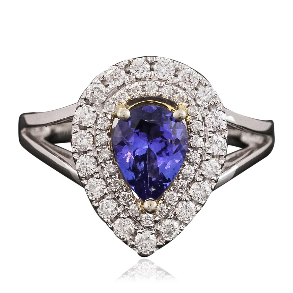 One electronically tested 14KT white gold ladies cast tanzanite and diamond ring. The featured tanzanite is set within two tiered diamond bezels supported by split shoulders, completed by a two and one-half millimeter wide band. Bright polish finish with yellow gold accents. Identified with markings of "14K". Condition is new, good workmanship. Containing: One prong set pear brilliant cut natural tanzanite, measuring 8.00 x 6.00 x 3.50mm, 8% bulge factor, approximate weight of 1.22ct., clarity is eye clean, type I, medium dark, very slightly grayish, violetish blue color, (GIA vB 6/3), cut is good. Transmitting light with no distortion, transparent. Graded in the setting. Tanzanite is a very rare gemstone that is only found in the country of Tanzania. Originally discovered in 1967. Tiffany & Company, named the stone Tanzanite. It is found in the Usumburu Mountains that border the Umba Valley of northern Tanzania. Tanzanite occurs in gray, brown, violet, blue, reddish-purple, & green. The gem is interesting because of its exceptional pleochroism. Rotated in different directions a tanzanite will exhibit multiple changes of color. Tanzanite has a low tolerance to ultrasonic cleaning, and should not be cleaned using this method. Nineteen prong set round brilliant cut diamonds, measuring 1.80 - 1.70 x 1.05mm (depth est.) approximate total weight of 19 Stones = 0.47ct. Graded in the setting. Clarity: SI-1 to I-1. Color: G - I Twenty-Two prong set round brilliant cut diamonds, measuring 1.20 - 1.10 x 0.69mm (depth est.) approximate total weight of 22 Stones = 0.22ct. Graded in the setting. Clarity: SI-1 to I-1. Color: G - I. Total Weight of Colored Stones 1.22ct. Total Weight of Diamonds 0.69ct. Total Weight of Ring 5.08 grams. AIG Appraised at $5,375.00.