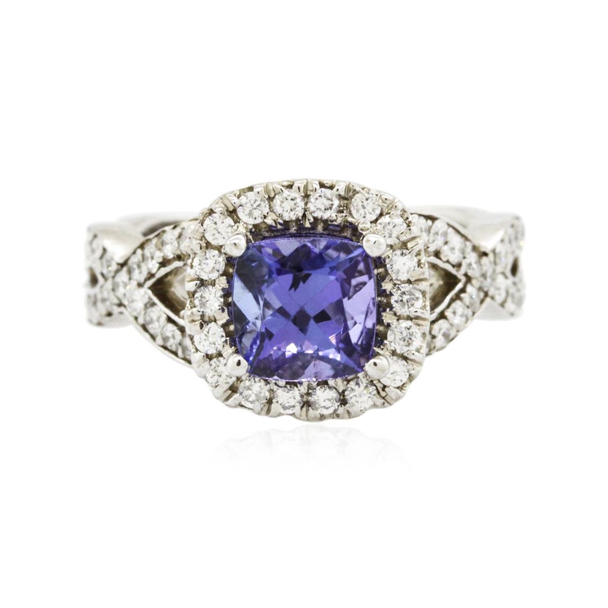 One electronically tested 14KT white gold ladies cast tanzanite and diamond ring with a bright polish finish. Identified with markings of "14K". Condition is new. Containing: One prong set square cushion modified brilliant cut natural tanzanite, measuring 6.20 x 6.20 x 4.03mm, approximate weight of 1.22ct., clarity is eye clean, type I, medium light, very slightly grayish, violet color, (GIA V 4/3), cut is good. Fifty-Four prong set round brilliant cut diamonds, measuring 1.50 - 1.50 x 0.90mm (depth est.) approximate total weight of 54 Stones = 0.66ct. Clarity: SI-2 to I-1. Color: I - J, Cut is Good. Colored gemstones are presumed to have been subjected to commonly used enhancement processes. All diamonds and colored gemstones are graded in the mounting, unless otherwise stated. Total Weight of Colored Stones 1.22ct. Total Weight of Diamonds 0.66ct. Total Weight of Ring 6.50 grams. GGL Appraised at $4,460.00.