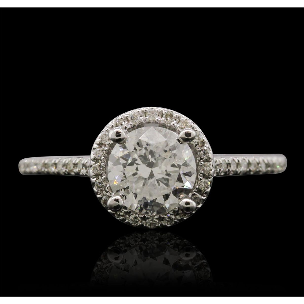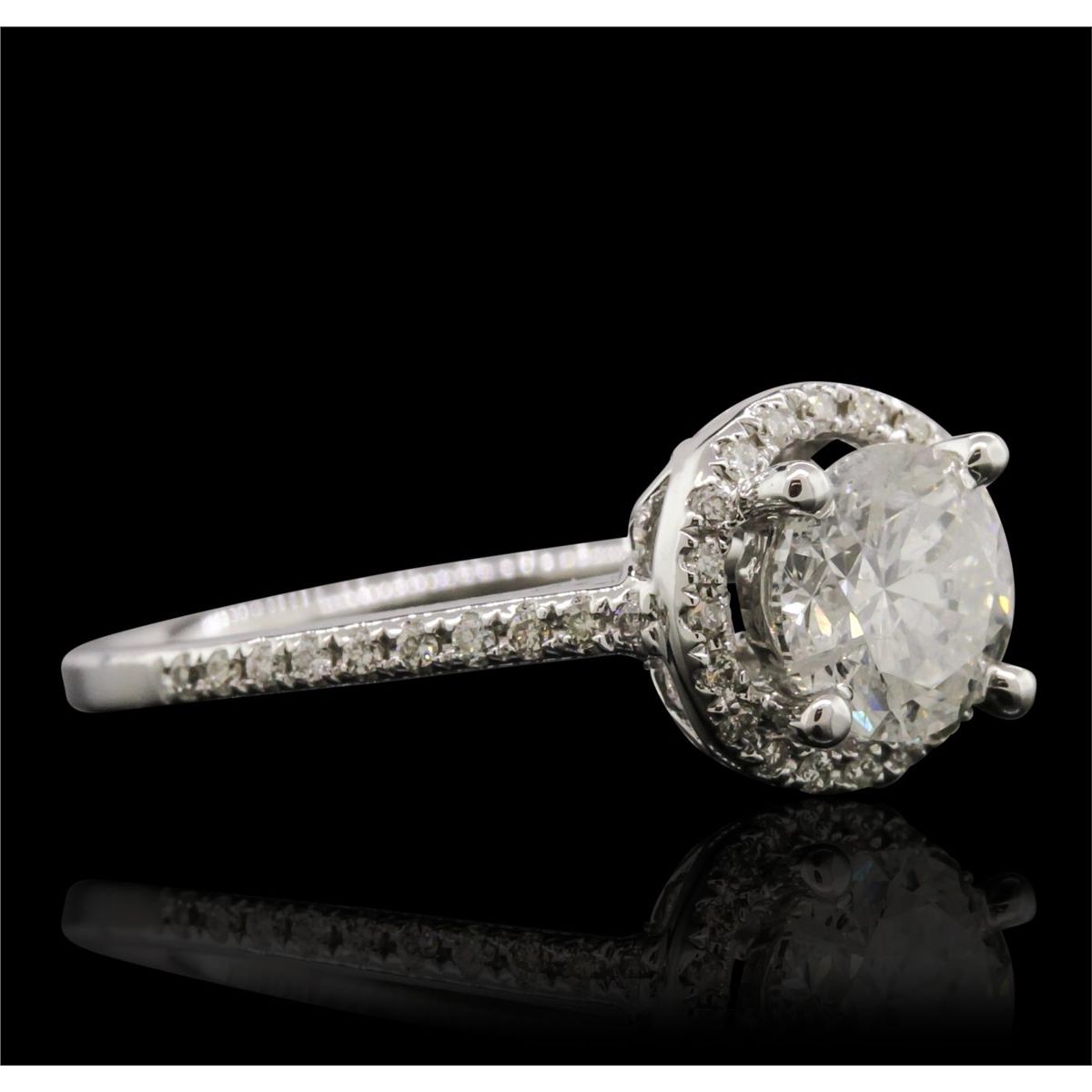 One electronically tested 14KT white gold Ladies combination cast & assembled engagement ring with a bright polish finish. Condition is new. Identified with markings of "14K". Containing: One prong set round brilliant cut diamond, measuring 6.34 - 6.32 x 4.00mm (depth est.) approximate weight of 1.08ct. Clarity: I-1. Color: F, Cut is Good. Forty prong set round brilliant cut diamonds, measuring 1.10 - 1.10 x 0.66mm (depth est.) approximate. Total Weight of 40 Stones = 0.14ct. Clarity: SI-1 to SI-3. Color: E - F, Cut is Good. EGL USA GEM ID# US 911348408D. All diamonds are graded in the mounting, unless otherwise stated. Total Weight of Diamonds 1.22ct. Total Weight of Engagement Ring 2.70 grams. GGLAppraised at $19,650.00.