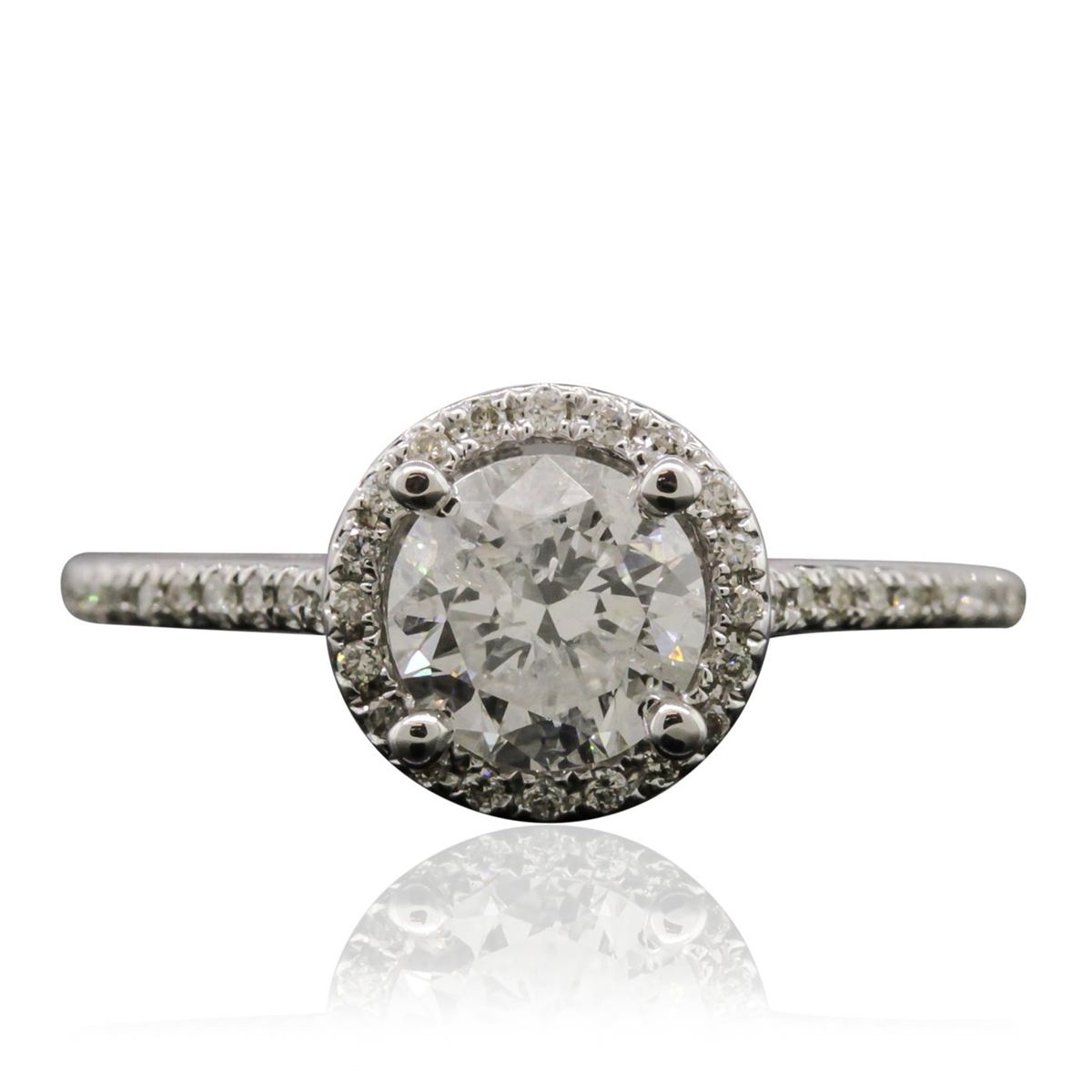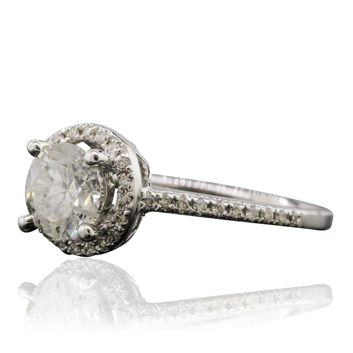 One electronically tested 14KT white gold Ladies combination cast & assembled engagement ring with a bright polish finish. Condition is new. Identified with markings of "14K". Containing: One prong set round brilliant cut diamond, measuring 6.34 - 6.32 x 4.00mm (depth est.) approximate weight of 1.08ct. Clarity: I-1. Color: F, Cut is Good. Forty prong set round brilliant cut diamonds, measuring 1.10 - 1.10 x 0.66mm (depth est.) approximate. Total Weight of 40 Stones = 0.14ct. Clarity: SI-1 to SI-3. Color: E - F, Cut is Good. EGL USA GEM ID# US 911348408D. All diamonds are graded in the mounting, unless otherwise stated. Total Weight of Diamonds 1.22ct. Total Weight of Engagement Ring 2.70 grams. GGL Appraised at $19,650.00.