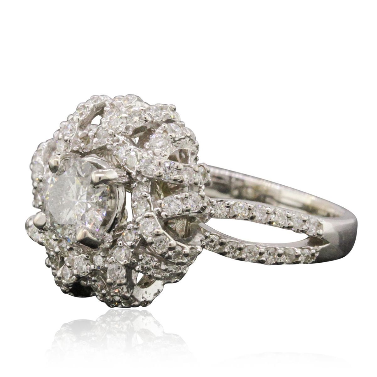 One electronically tested 14KT white gold ladies combination cast & assembled engagement ring with a bright polish finish. Condition is new. Identified with markings of "K14". Containing: One prong set round brilliant cut diamond, measuring 5.70 - 5.27 x 3.54mm (depth est.) approximate weight of 0.65ct. Clarity: I-2. Color: J, Cut is Good. One Hundred Eighteen prong set round brilliant cut diamonds, measuring 1.10 - 1.10 x 0.66mm (depth est.) approximate. Total Weight of 118 Stones = 0.57ct. Clarity: SI-2 to I-2. Color: I - J, Cut is Good. All diamonds are graded in the mounting, unless otherwise stated. Total Weight of Diamonds 1.22ct. Total Weight of Ring 6.20 grams. GGL Appraised at $6,395.00.