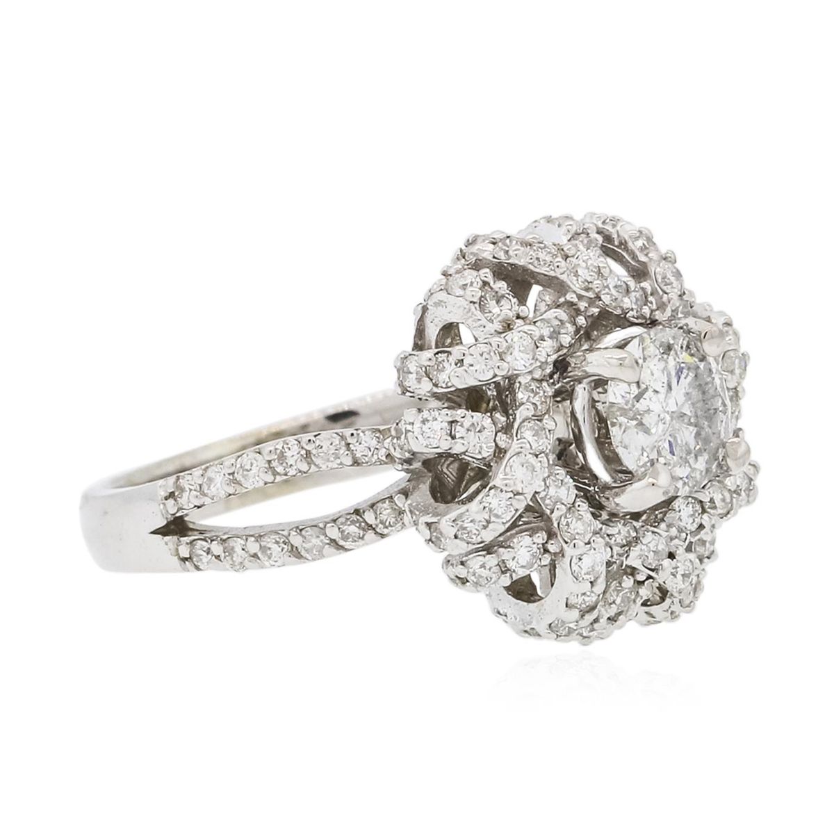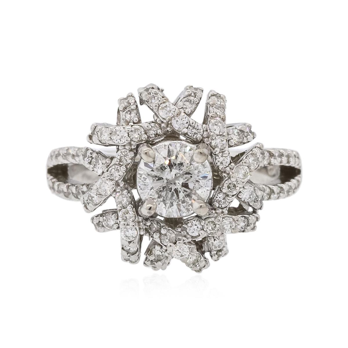 One electronically tested 14KT white gold ladies combination cast & assembled engagement ring with a bright polish finish. Condition is new. Identified with markings of "K14". Containing: One prong set round brilliant cut diamond, measuring 5.70 - 5.27 x 3.54mm (depth est.) approximate weight of 0.65ct. Clarity: I-2. Color: J, Cut is Good. One Hundred Eighteen prong set round brilliant cut diamonds, measuring 1.10 - 1.10 x 0.66mm (depth est.) approximate. Total Weight of 118 Stones = 0.57ct. Clarity: SI-2 to I-2. Color: I - J, Cut is Good. All diamonds are graded in the mounting, unless otherwise stated. Total Weight of Diamonds 1.22ct. Total Weight of Ring 6.20 grams. GGL Appraised at $6,395.00.