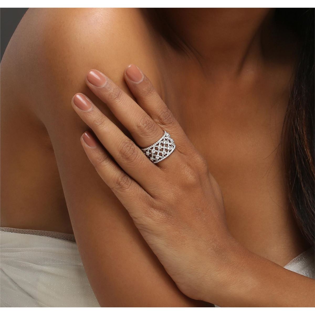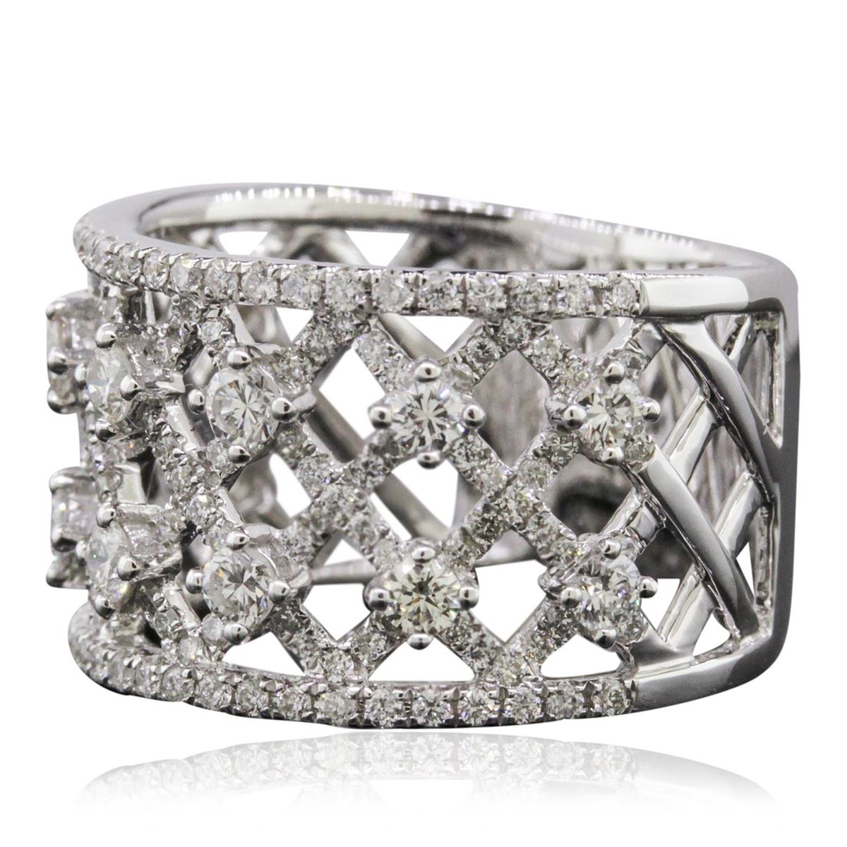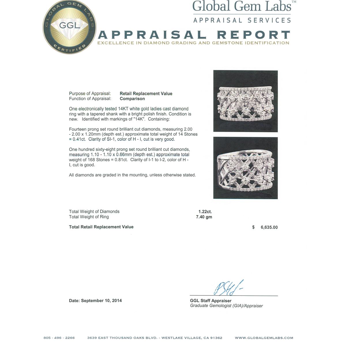 One electronically tested 14KT white gold ladies cast diamond ring with a tapered shank with a bright polish finish. Identified with markings of "14K". Condition is new. Containing: Fourteen prong set round brilliant cut diamonds, measuring 2.00 - 2.00 x 1.20mm (depth est.) approximate total weight of 14 Stones = 0.41ct. Clarity: SI-1. Color: H - I, Cut is Very Good. One Hundred Sixty-Eight prong set round brilliant cut diamonds, measuring 1.10 - 1.10 x 0.66mm (depth est.) approximate total weight of 168 Stones = 0.81ct. Clarity: I-1 to I-2. Color: H - I, Cut is Good. All diamonds are graded in the mounting, unless otherwise stated. Total Weight of Diamonds 1.22ct. Total Weight of Ring 7.40 grams. GGL Appraised at $6,635.00.
