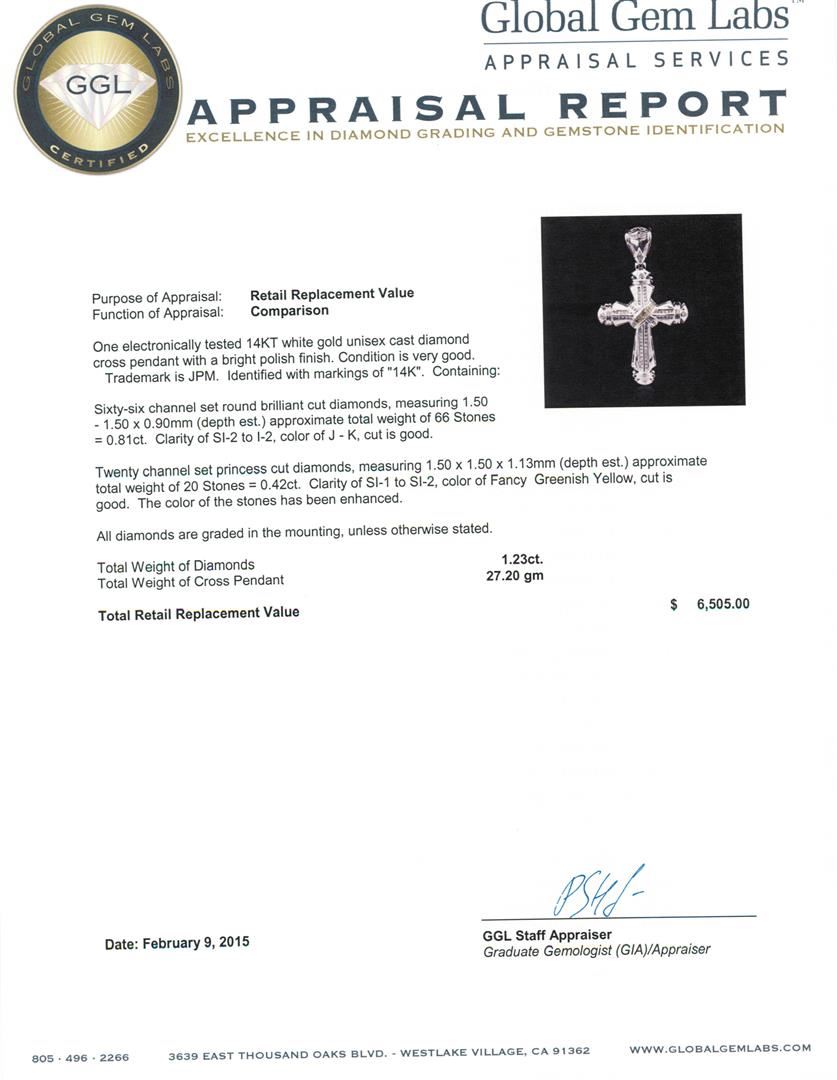 One electronically tested 14KT white gold unisex cast diamond cross pendant with a bright polish finish. Trademark is JPM. Identified with markings of "14K". Condition is very good. Containing: Sixty-Six channel set round brilliant cut diamonds, measuring 1.50 - 1.50 x 0.90mm (depth est.) approximate total weight of 66 Stones = 0.81ct. Clarity: SI-2 to I-2. Color: J - K, Cut is Good. Twenty channel set princess cut diamonds, measuring 1.50 x 1.50 x 1.13mm (depth est.) approximate total weight of 20 Stones = 0.42ct. Clarity: SI-1 to SI-2, Color is Fancy Greenish Yellow, Cut is Good. The color of the stones has been enhanced. All diamonds are graded in the mounting, unless otherwise stated. Total Weight of Diamonds 1.23ct. Total Weight of Cross Pendant 27.20 grams. GGL Appraised at $6,505.00.