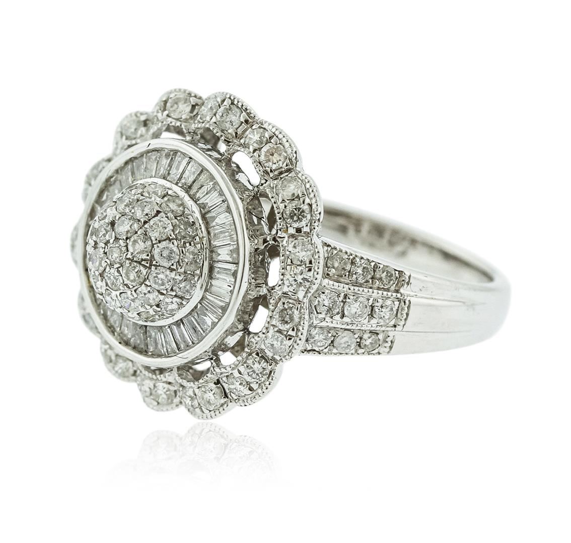 One ring featuring: 14KT white gold weighing 6.33 grams containing 109 baguette cut/round diamonds with a total weight of 0.74ct.