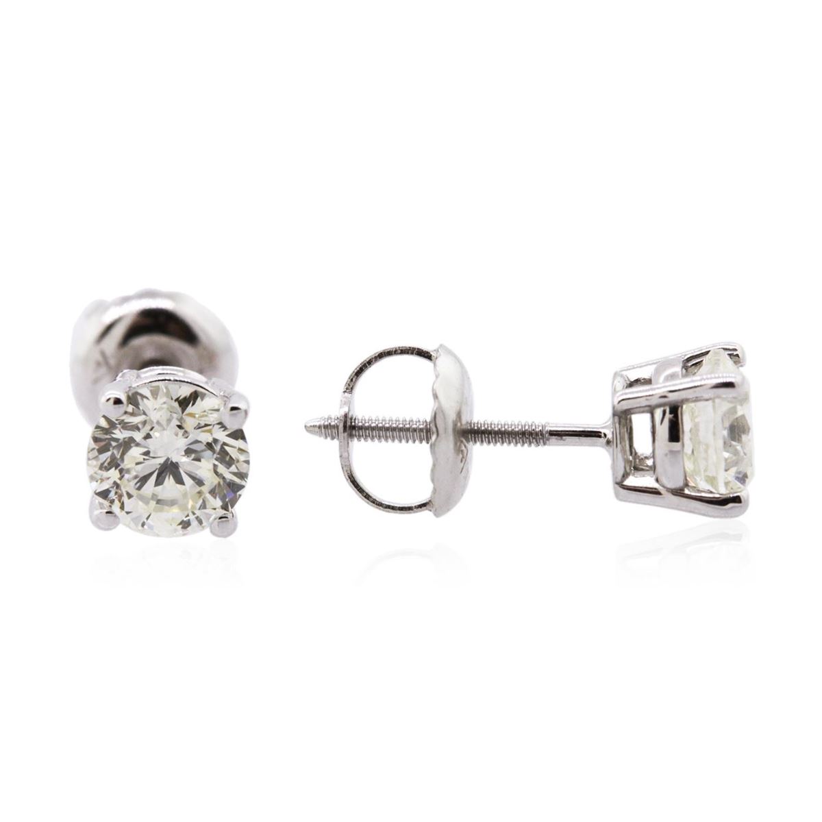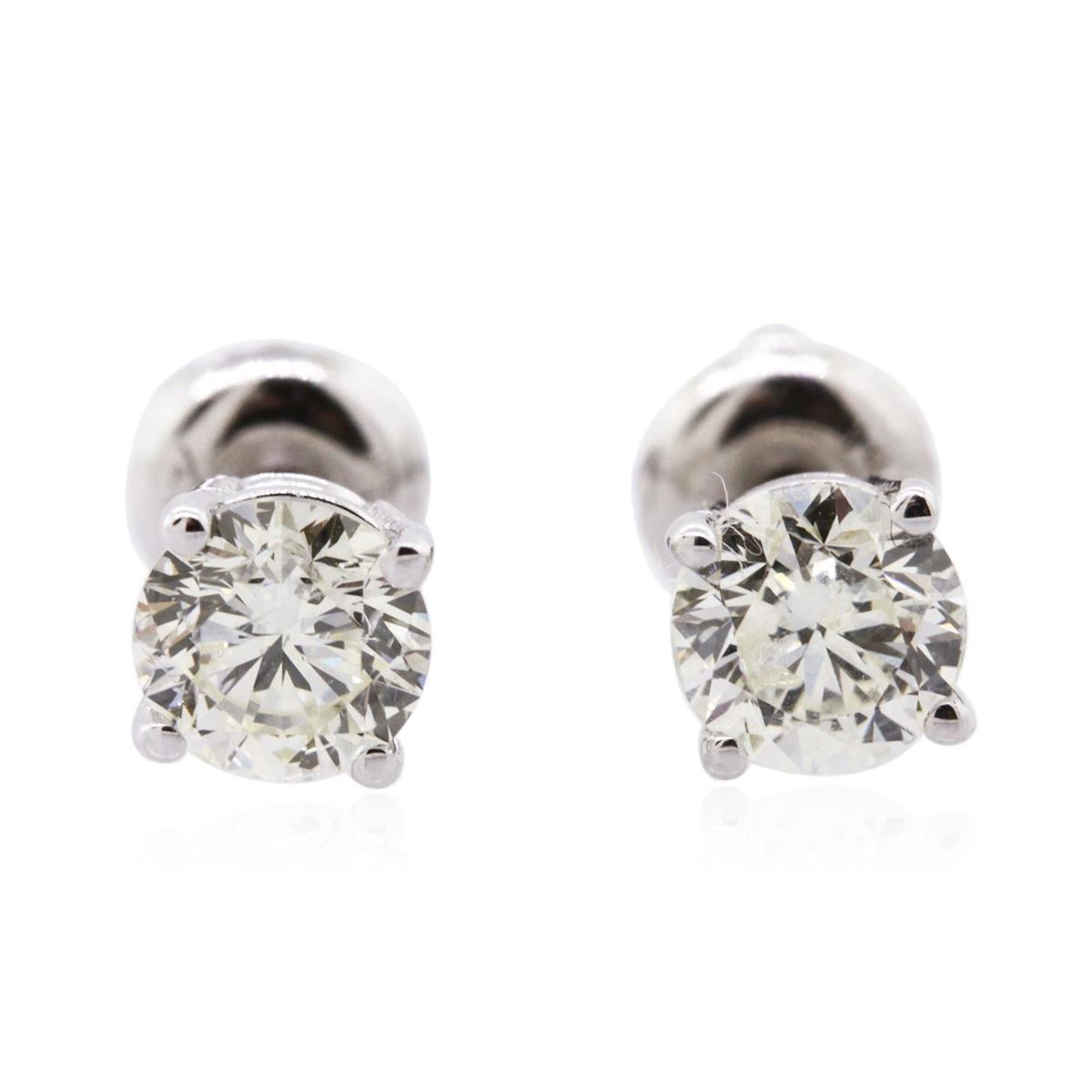 One pair electronically tested 14KT white gold cast & assembled diamond solitaire earrings with screw backs. Bright polish finish. Condition is new, good workmanship. Containing: One prong set round brilliant cut diamond, measuring 5.01 - 5.00 x 3.35mm (depth est.), 4.00% GTCF approximate weight of 0.63ct with a faint blue fluorescence. Graded in the setting. Clarity: I-1. Depth: 66.9%. Table 59.9%. One prong set round brilliant cut diamond, measuring 5.00 - 4.90 x 3.30mm (depth est.), 3.00% GTCF approximate weight of 0.60ct with a medium strong blue fluorescence. Graded in the setting. Clarity: SI-2. Depth: 66.7%. Table 62.6%. Total Weight of Diamonds 1.23ct. Total Weight of Earrings 0.96 grams. AIG Appraised at $4,195.00.