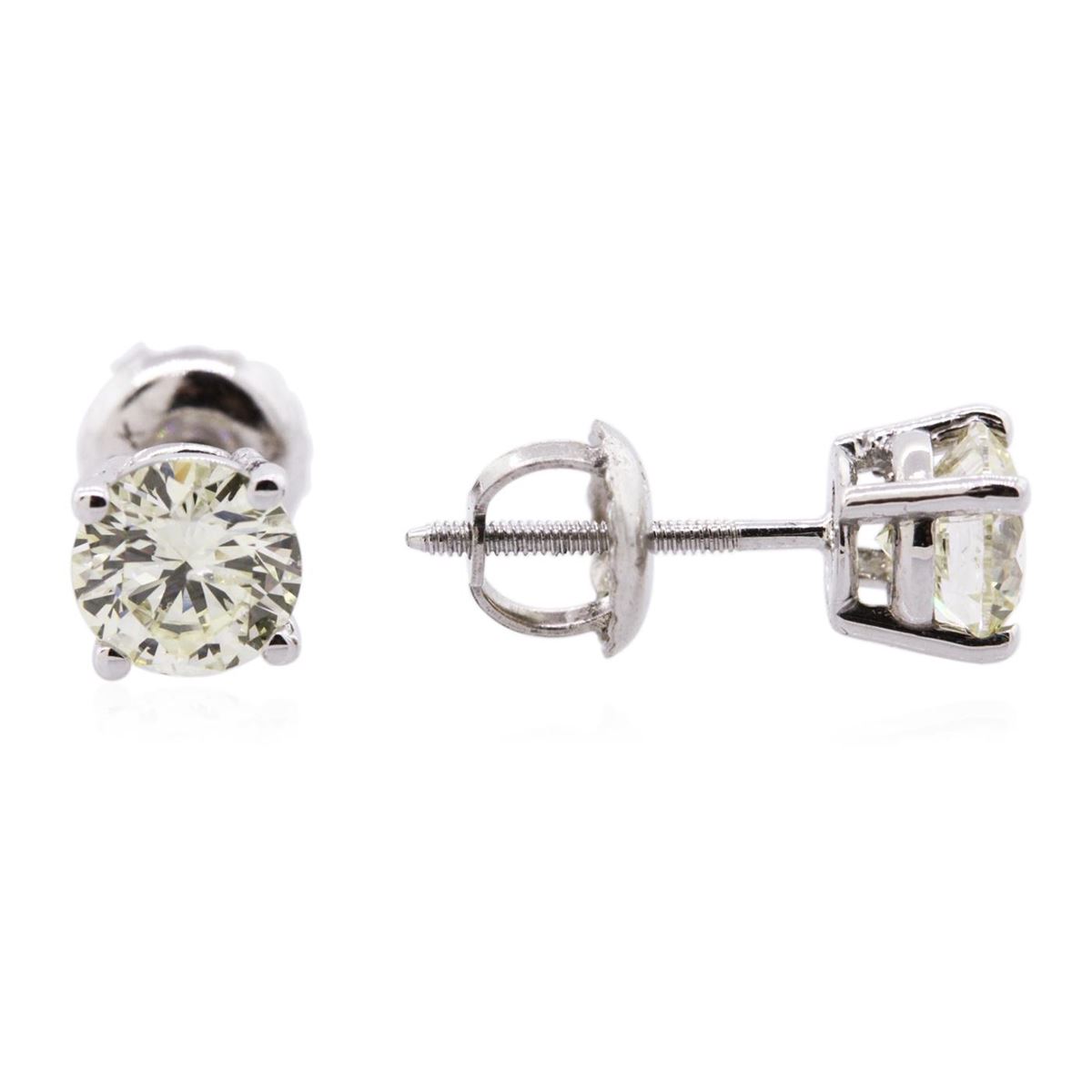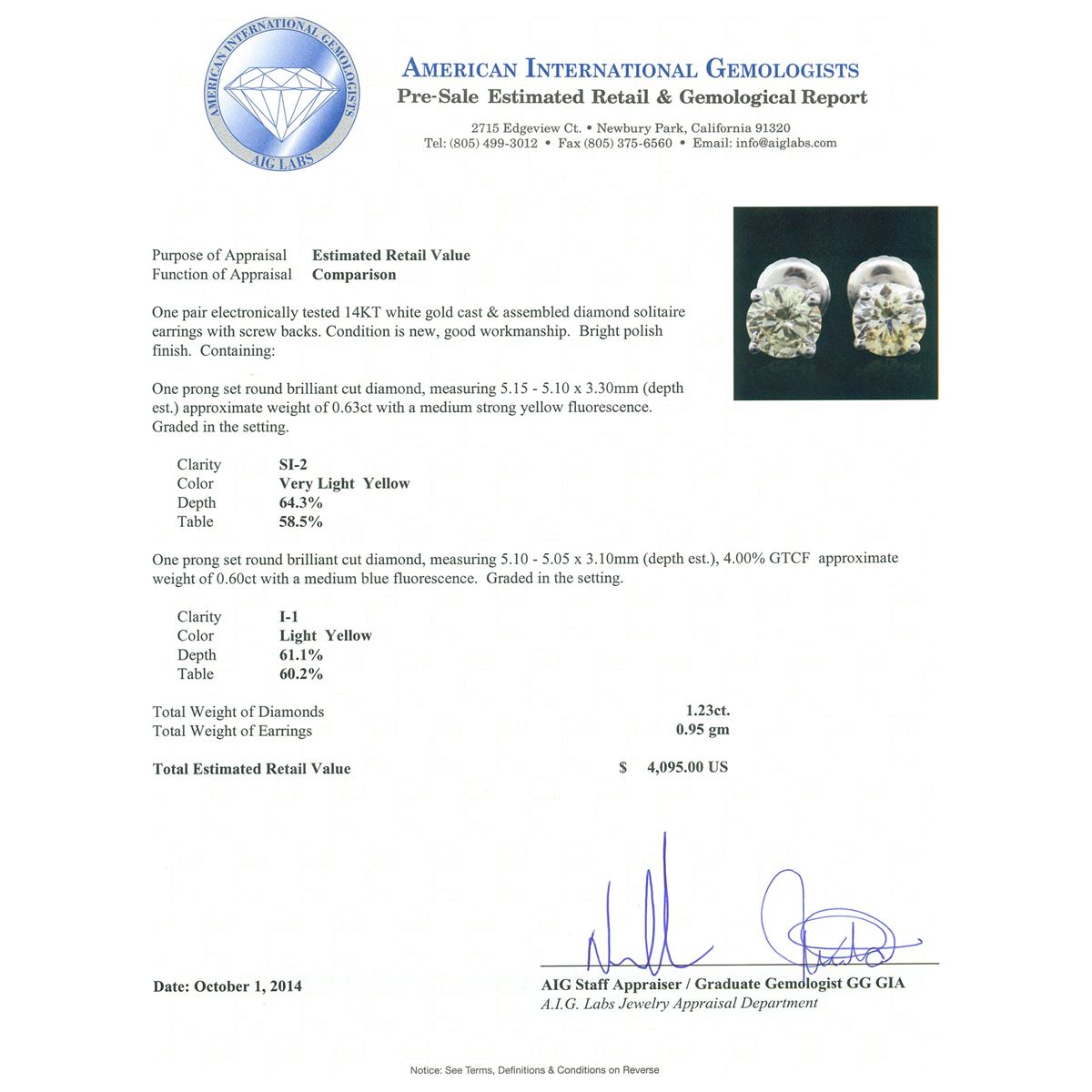 One pair electronically tested 14KT white gold cast & assembled diamond solitaire earrings with screw backs. Bright polish finish. Condition is new, good workmanship. Containing: One prong set round brilliant cut diamond, measuring 5.15 - 5.10 x 3.30mm (depth est.) approximate weight of 0.63ct with a medium strong yellow fluorescence. Graded in the setting. Clarity: SI-2. Depth: 64.3%. Table 58.5%. One prong set round brilliant cut diamond, measuring 5.10 - 5.05 x 3.10mm (depth est.), 4.00% GTCF approximate weight of 0.60ct with a medium blue fluorescence. Graded in the setting. Clarity: I-1. Depth: 61.1%. Table 60.2%. Total Weight of Diamonds 1.23ct. Total Weight of Earrings 0.95 grams. AIG Appraised at $4,095.00.