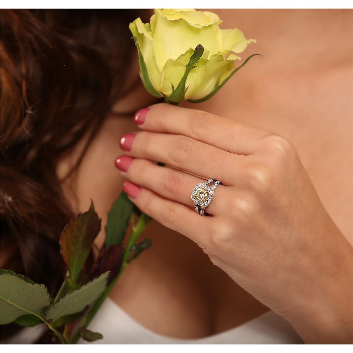 One electronically tested 14KT white gold ladies cast diamond unity ring. The featured diamond is set within a diamond bezel supported by diamond set split shoulders, completed by a two and one-half millimeter wide band. Bright polish finish with yellow gold accents and milgrain detailing. Identified with markings of "14K". Condition is new, good workmanship. Containing: One prong set cut corner rectangular modified brilliant shaped cut diamond, measuring 6.07 x 5.54 x 4.52mm exact weight 1.23ct with a medium blue fluorescence. Diamond Grading Report attached. Graded loose for color prior to setting in the GIA Laboratory, Report #2141800694. Clarity SI -2. Color Light Yellow. Depth 81.6%. Table 66.8%. Fifty-Four prong set round brilliant cut diamonds, measuring 1.80 - 1.50 x 0.99mm (depth est.) approximate total weight of 54 Stones = 0.73ct. Graded in the setting. Clarity VS-2 to SI-2. Color F - H. Total Weight of Diamonds 1.96 ct. Total Weight of Ring 6.14gm. AIG Appraised at $11,310.00.