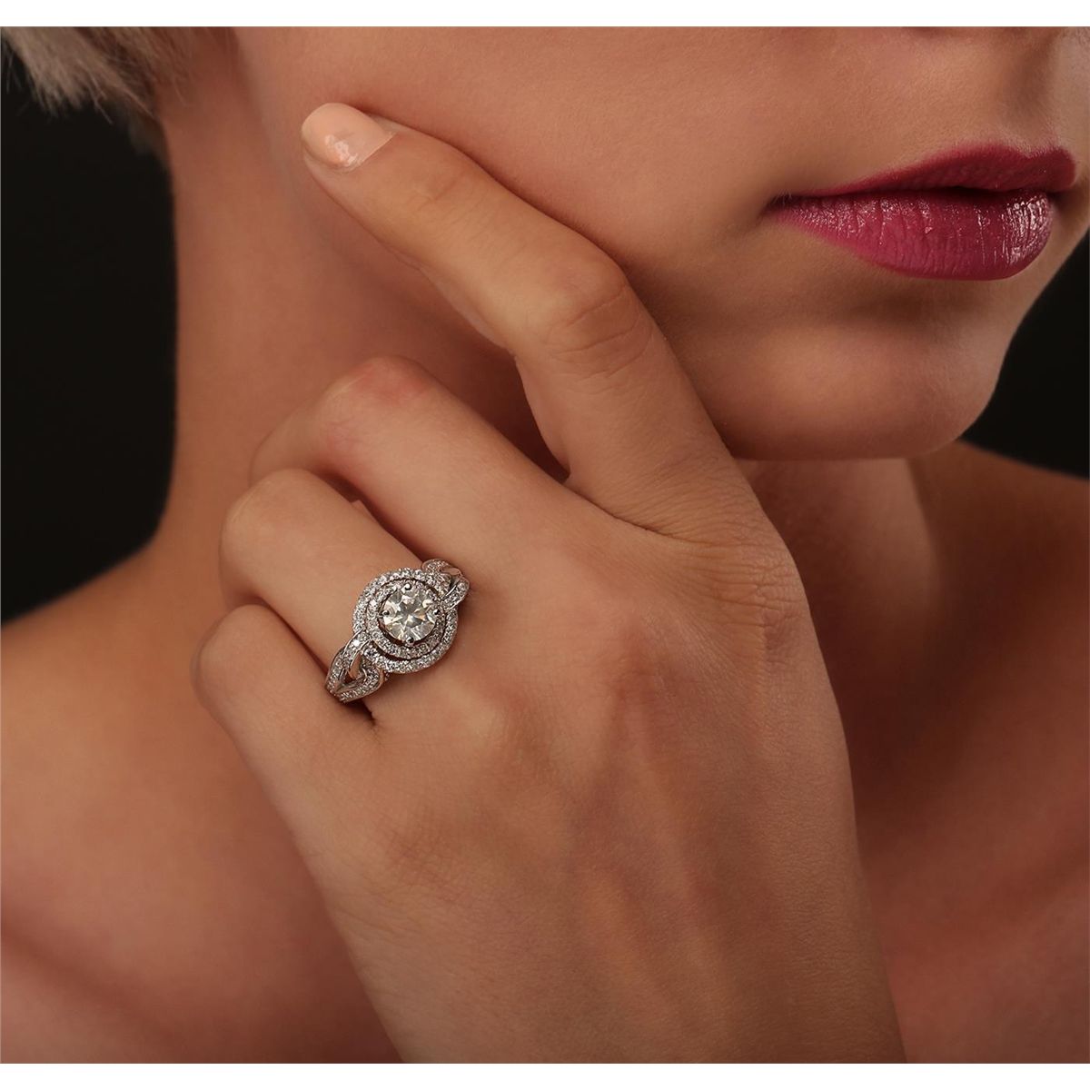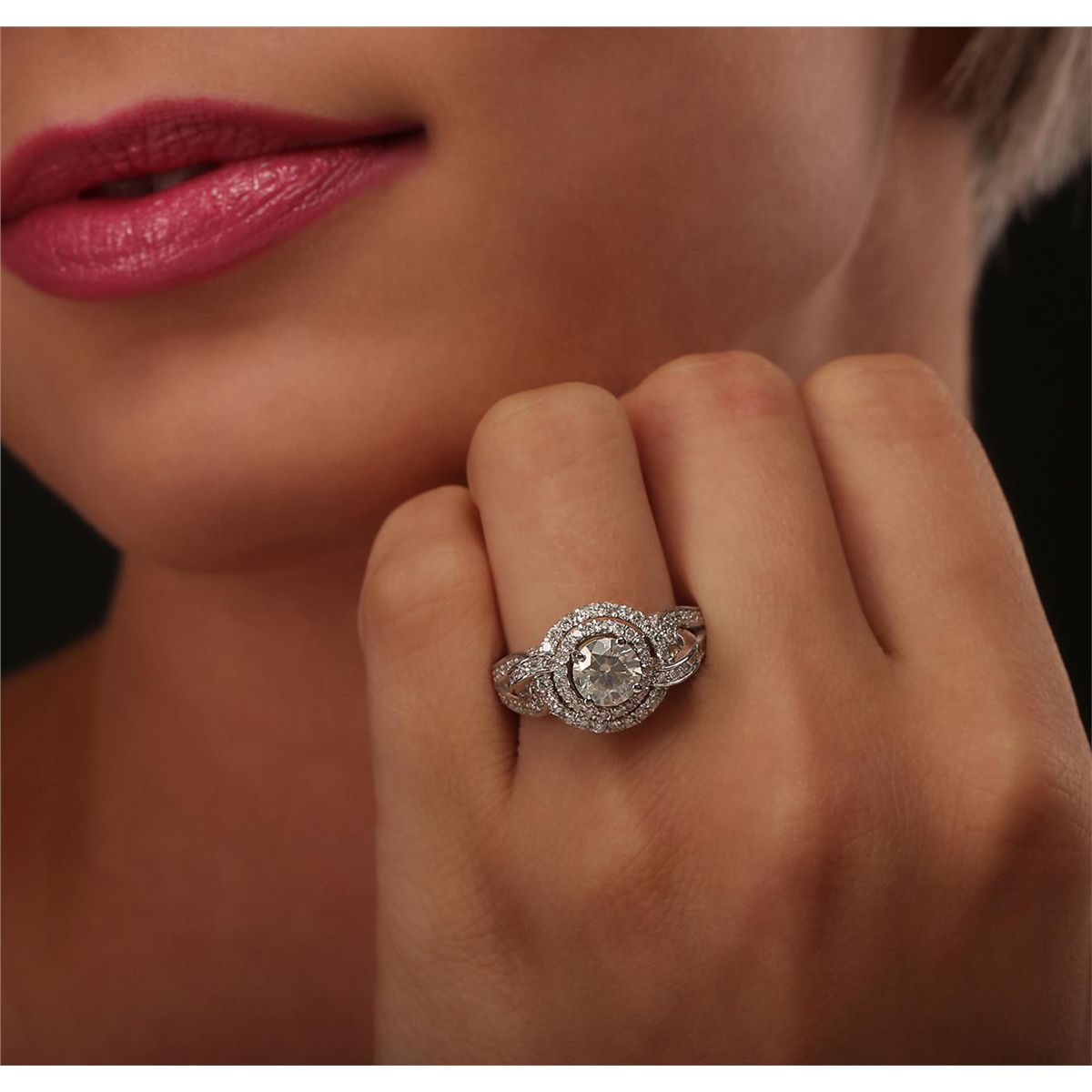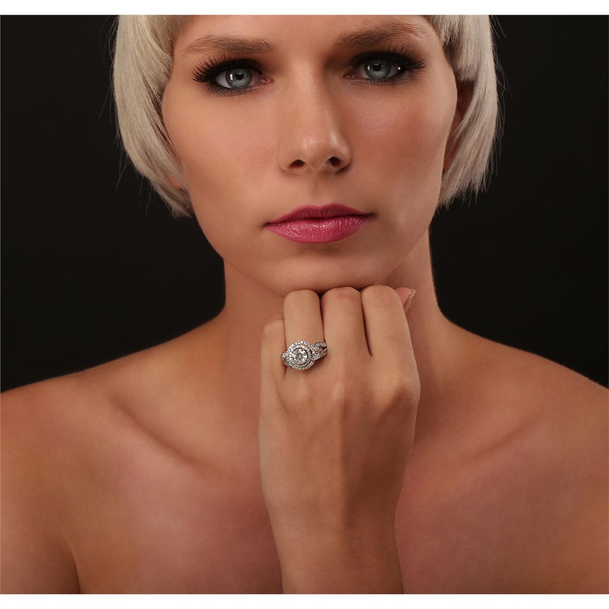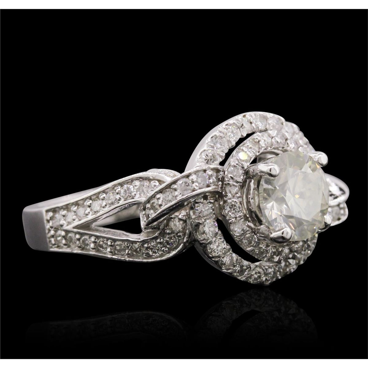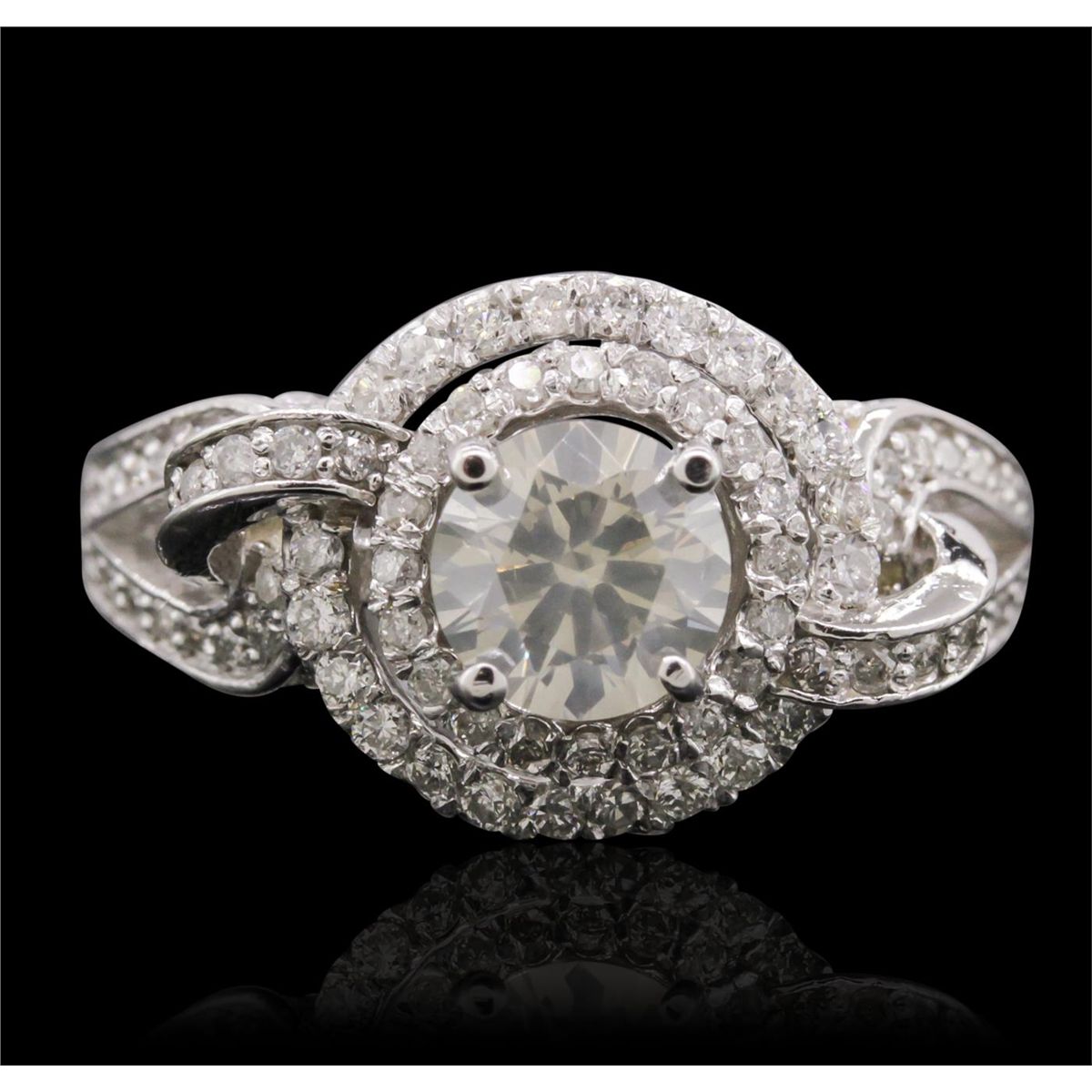 One electronically tested 14KT white gold ladies cast diamond unity ring with a bright polish finish. Condition is new, good workmanship. The featured diamond is set within two tiered diamond bezels supported by elaborate diamond set split shoulders, completed by a two and one-half millimeter wide band. Identified with markings of "K14". Containing: One prong set round brilliant cut diamond, measuring 6.73 - 6.71 x 4.19mm exact weight 1.23ct. EGL Report attached. Graded loose prior to setting in the EGL Laboratory Report #US 905512504D. Clarity: I-2. Color: J Depth 62.4%. Table 56.0%. Pavil. Depth%. 42.1%. One Hundred Fourteen prong set round brilliant cut diamonds, measuring 1.40 - 1.20 x 0.78mm (depth est.) approximate. Total Weight of 114 Stones = 1.01ct. Graded in the setting. Clarity: SI-2 to I-2. Color: G - I. Total Weight of Diamonds 2.24ct. Total Weight of Ring 7.22 grams. AIGAppraised at $13,985.00.