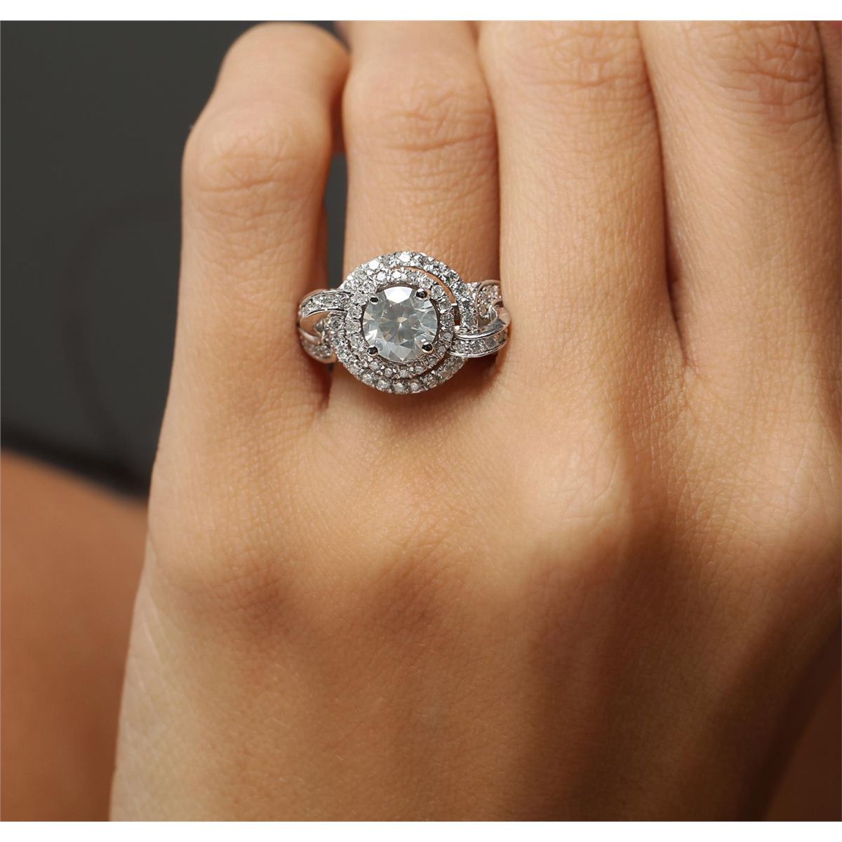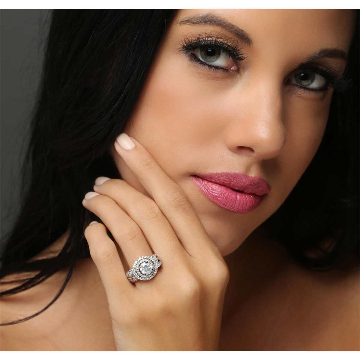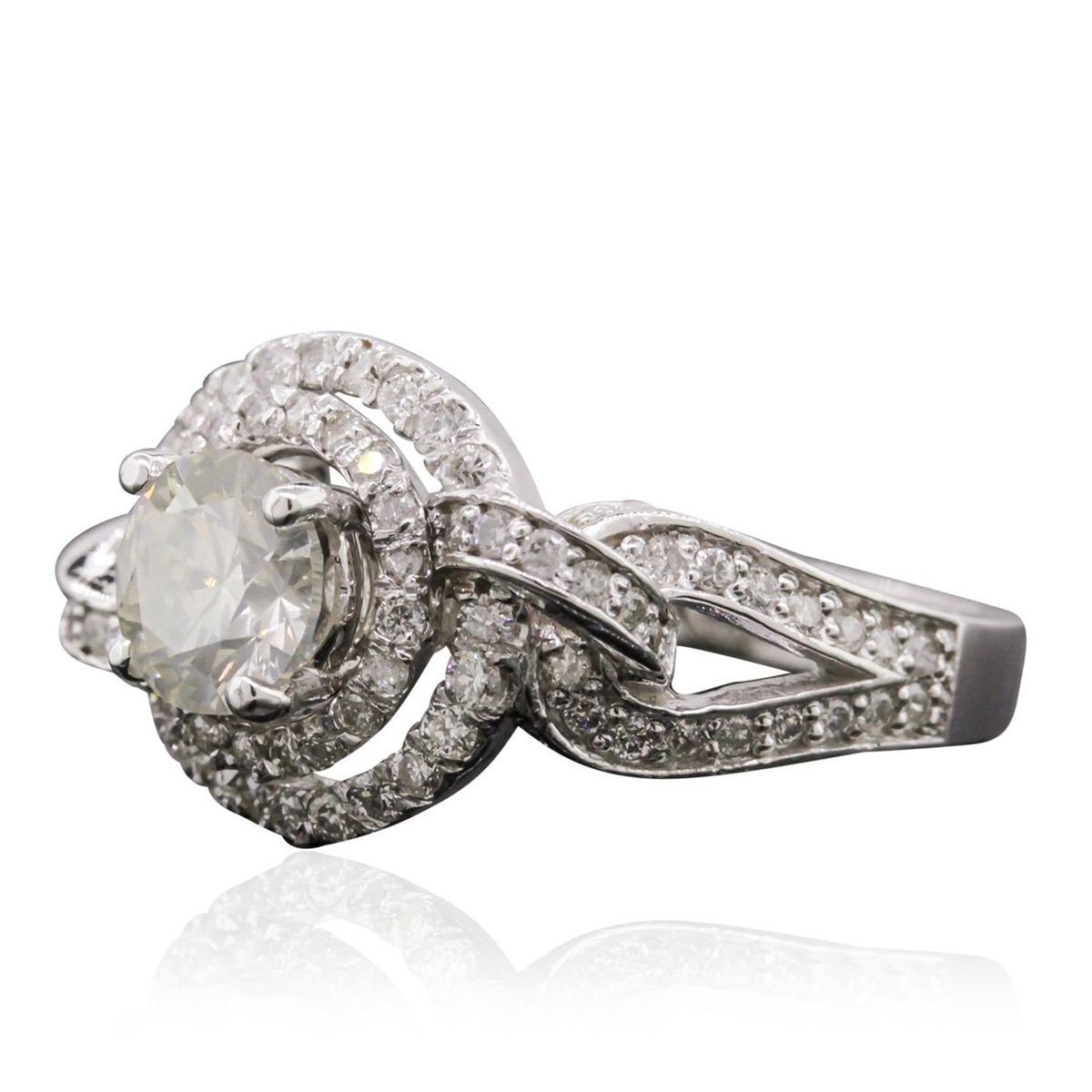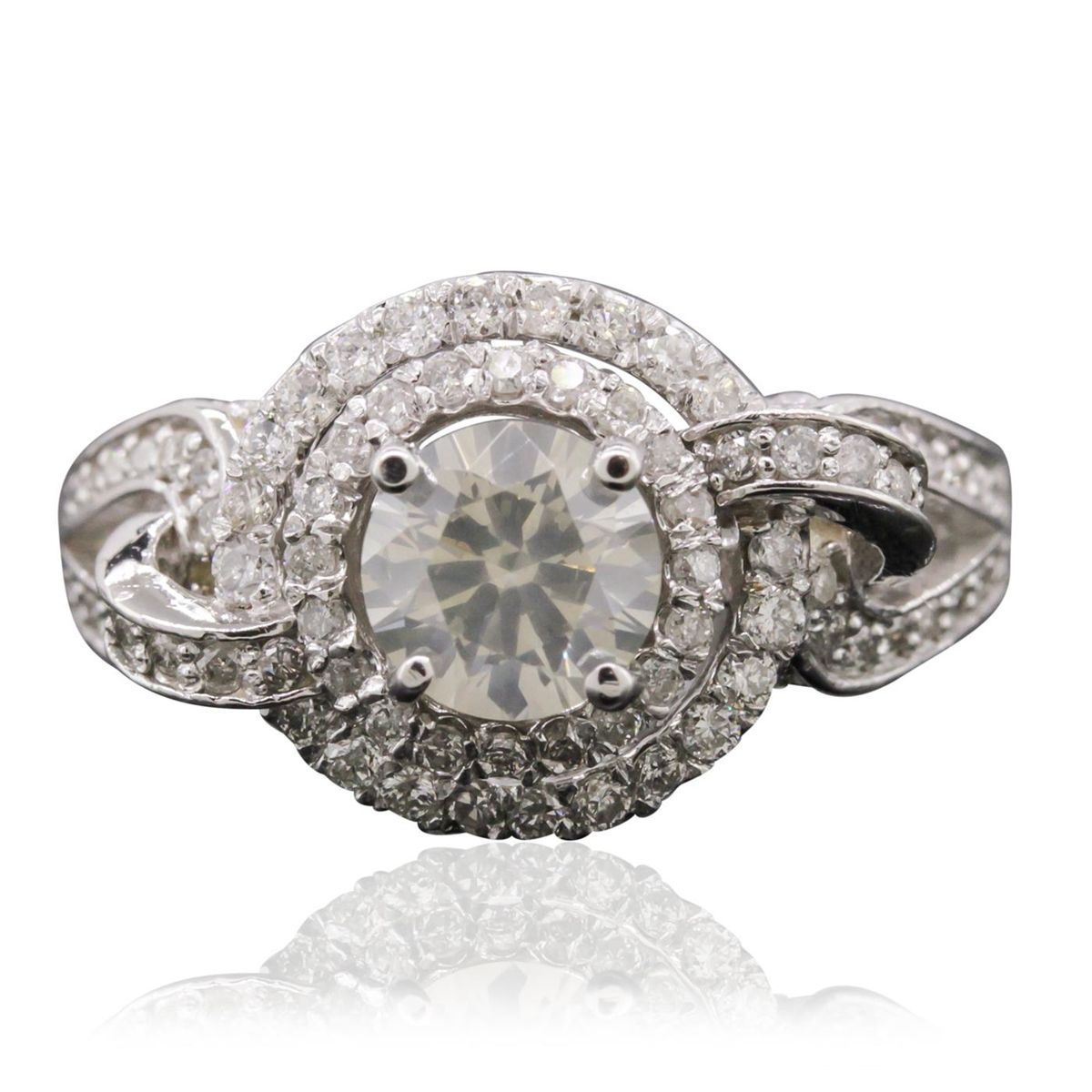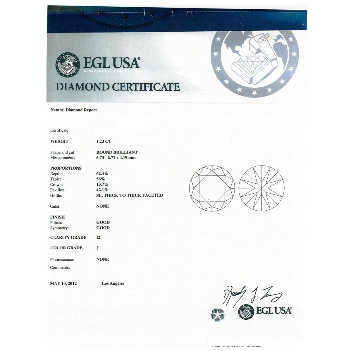 One electronically tested 14KT white gold ladies cast diamond unity ring with a bright polish finish. Condition is new, good workmanship. The featured diamond is set within two tiered diamond bezels supported by elaborate diamond set split shoulders, completed by a two and one-half millimeter wide band. Identified with markings of "K14". Containing: One prong set round brilliant cut diamond, measuring 6.73 - 6.71 x 4.19mm exact weight 1.23ct. EGL Report attached. Graded loose prior to setting in the EGL Laboratory Report #US 905512504D. Clarity: I-2. Color: J Depth 62.4%. Table 56.0%. Pavil. Depth%. 42.1%. One Hundred Fourteen prong set round brilliant cut diamonds, measuring 1.40 - 1.20 x 0.78mm (depth est.) approximate. Total Weight of 114 Stones = 1.01ct. Graded in the setting. Clarity: SI-2 to I-2. Color: G - I. Total Weight of Diamonds 2.24ct. Total Weight of Ring 7.22 grams. AIG Appraised at $13,985.00.