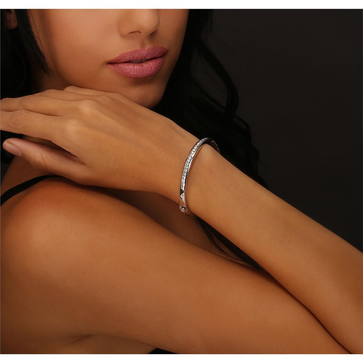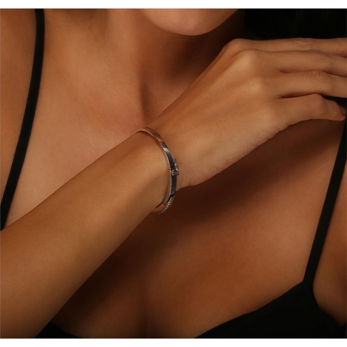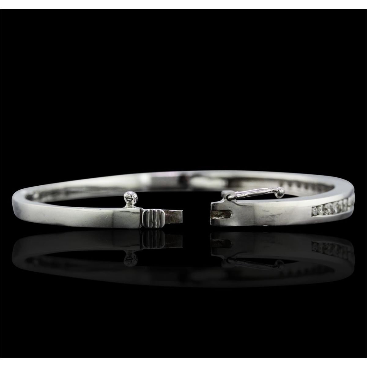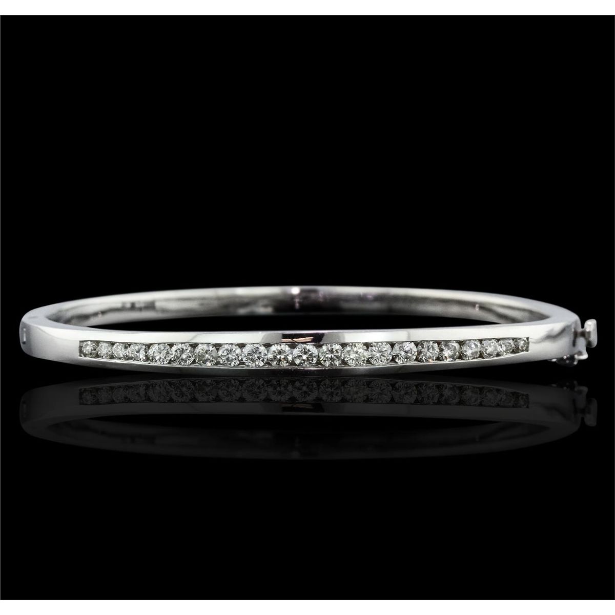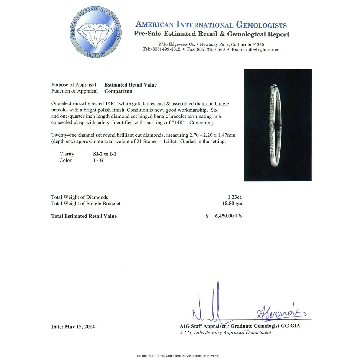One electronically tested 14KT white gold ladies cast & assembled diamond bangle bracelet with a bright polish finish. Condition is new, good workmanship. Six and one-quarter inch length diamond set hinged bangle bracelet terminating in a concealed clasp with safety. Identified with markings of "14K". Containing: Twenty-One channel set round brilliant cut diamonds, measuring 2.70 - 2.20 x 1.47mm (depth est.) approximate. Total Weight of 21 Stones = 1.23ct. Graded in the setting. Clarity: SI-2 to I-1. Color: I - K. Total Weight of Diamonds 1.23ct. Total Weight of Bangle Bracelet 18.80 grams. AIG Appraised at $6,450.00.