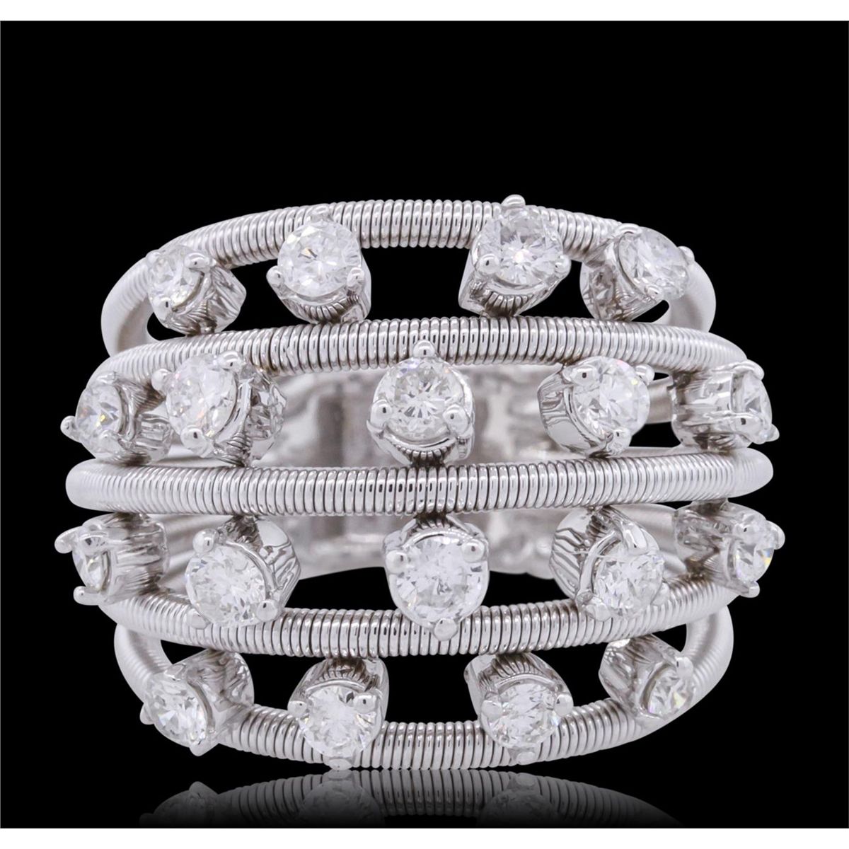 One electronically tested 14KT white gold ladies combination cast & assembled diamond ring with a bright polish finish. Identified with markings of "K14". Condition is new. Containing: Eighteen prong set round brilliant cut diamonds, measuring 2.80 - 2.50 x 1.59mm (depth est.) approximate total weight of 18 Stones = 1.23ct. Clarity: SI-2 to I-1. Color: H - I, Cut is Good. All diamonds are graded in the mounting, unless otherwise stated. Total Weight of Diamonds 1.23ct. Total Weight of Ring 10.90 grams. GGL Appraised at $5,150.00.