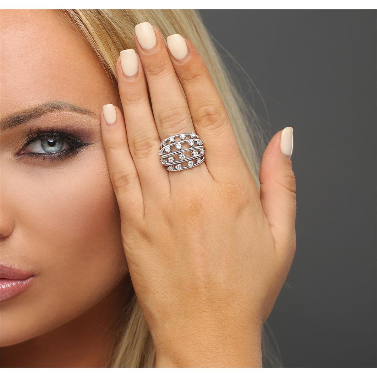 One electronically tested 14KT white gold ladies combination cast & assembled diamond ring with a bright polish finish. Identified with markings of "K14". Condition is new. Containing: Eighteen prong set round brilliant cut diamonds, measuring 2.80 - 2.50 x 1.59mm (depth est.) approximate total weight of 18 Stones = 1.23ct. Clarity: SI-2 to I-1. Color: H - I, Cut is Good. All diamonds are graded in the mounting, unless otherwise stated. Total Weight of Diamonds 1.23ct. Total Weight of Ring 10.90 grams. GGL Appraised at $5,150.00.