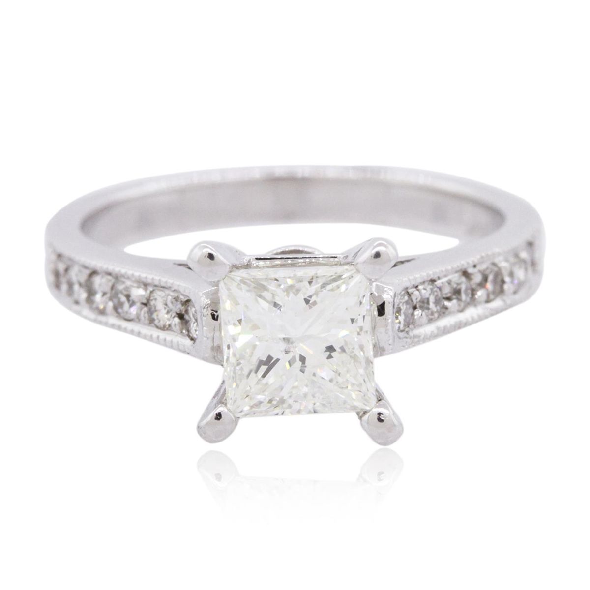 One electronically tested 14KT white gold ladies combination cast & assembled diamond engagement ring with a bright polish finish. Identified with markings of "14K". Condition is new. Containing: One prong set princess cut diamond, measuring 5.60 x 5.60 x 4.20mm (depth est.) approximate weight of 1.08ct. Clarity: SI-2. Color: K, Cut is Good. Twelve prong set round brilliant cut diamonds, measuring 1.50 - 1.50 x 0.90mm (depth est.) approximate total weight of 12 Stones = 0.15ct. Clarity: SI-2. Color: J - K, Cut is Good. All diamonds are graded in the mounting, unless otherwise stated. Total Weight of Diamonds 1.23ct. Total Weight of Engagement Ring 4.10 grams. GGL Appraised at $11,340.00.